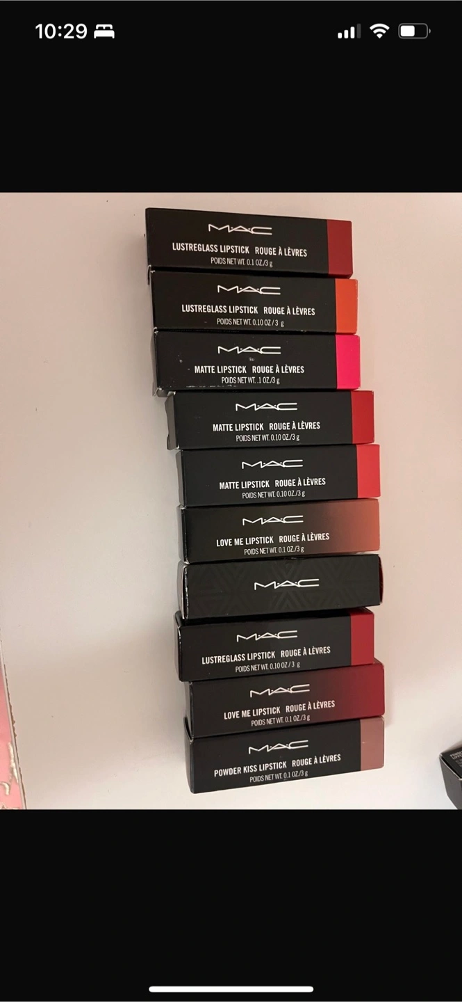 Collection of MAC lipsticks. Includes various shades and finishes like Lustreglass and Matte. Perfect for makeup lovers or collectors. All in original packaging. $30 each