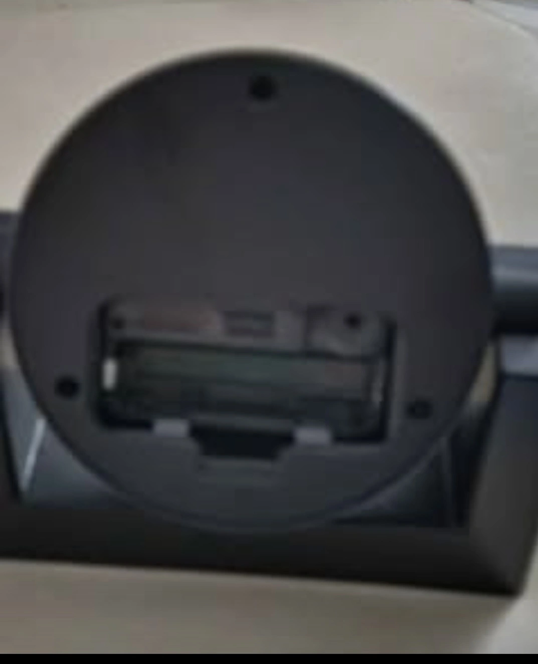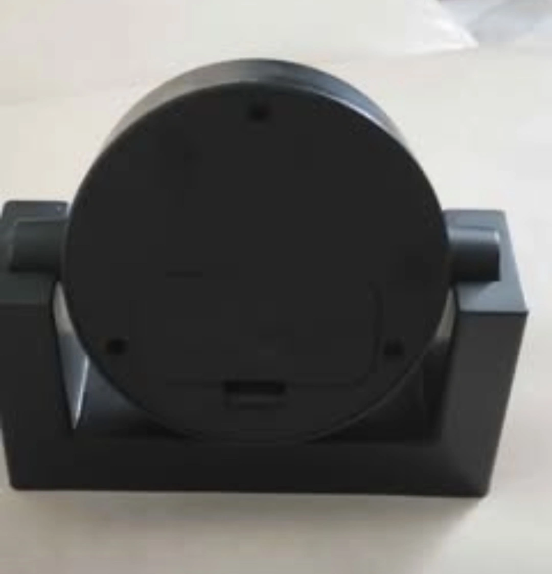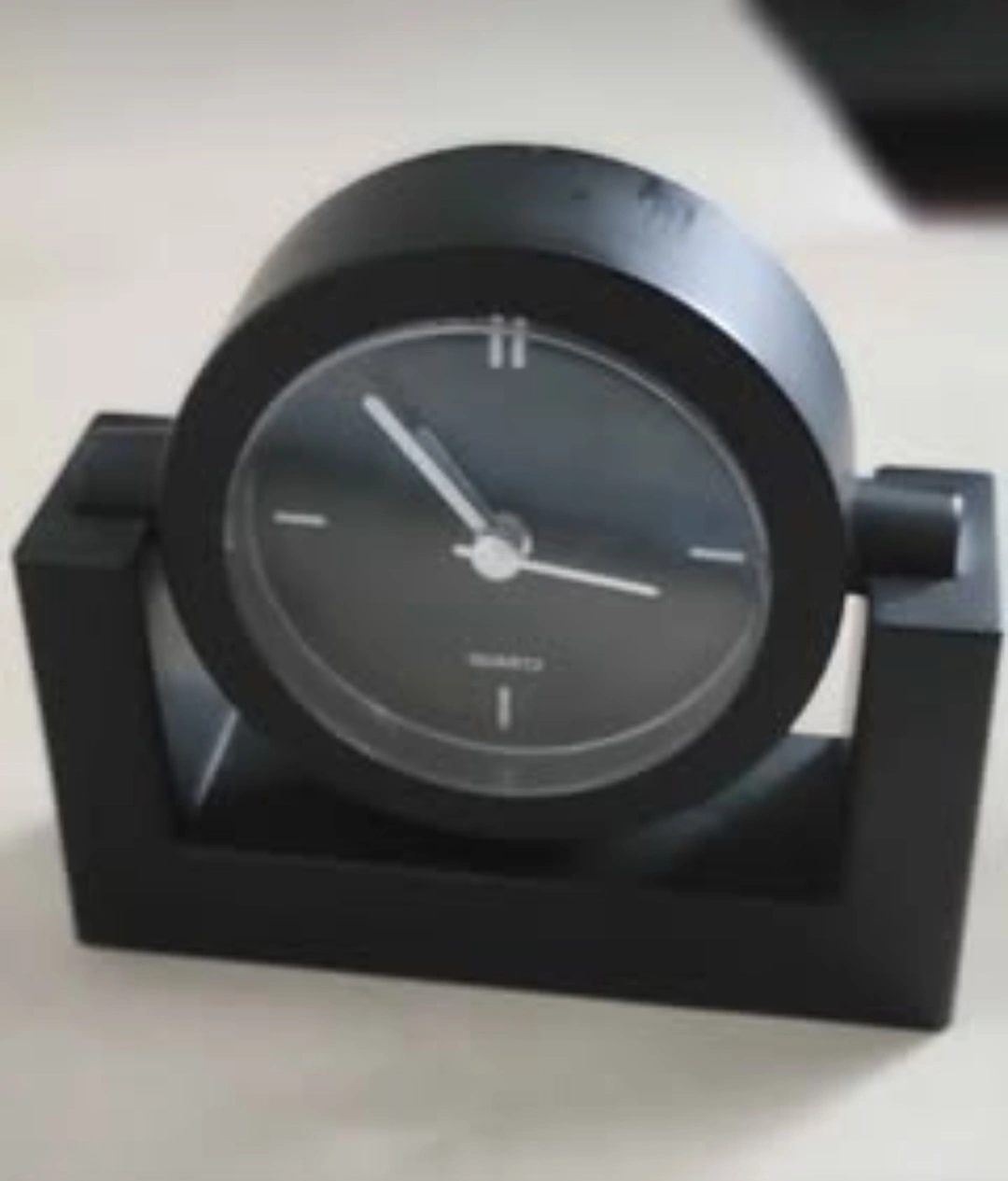 Small, round, black analog clock. Features minimalist design. Quartz movement. Clock sits in a black stand. Perfect for a desk or bedside table. Battery operated.
