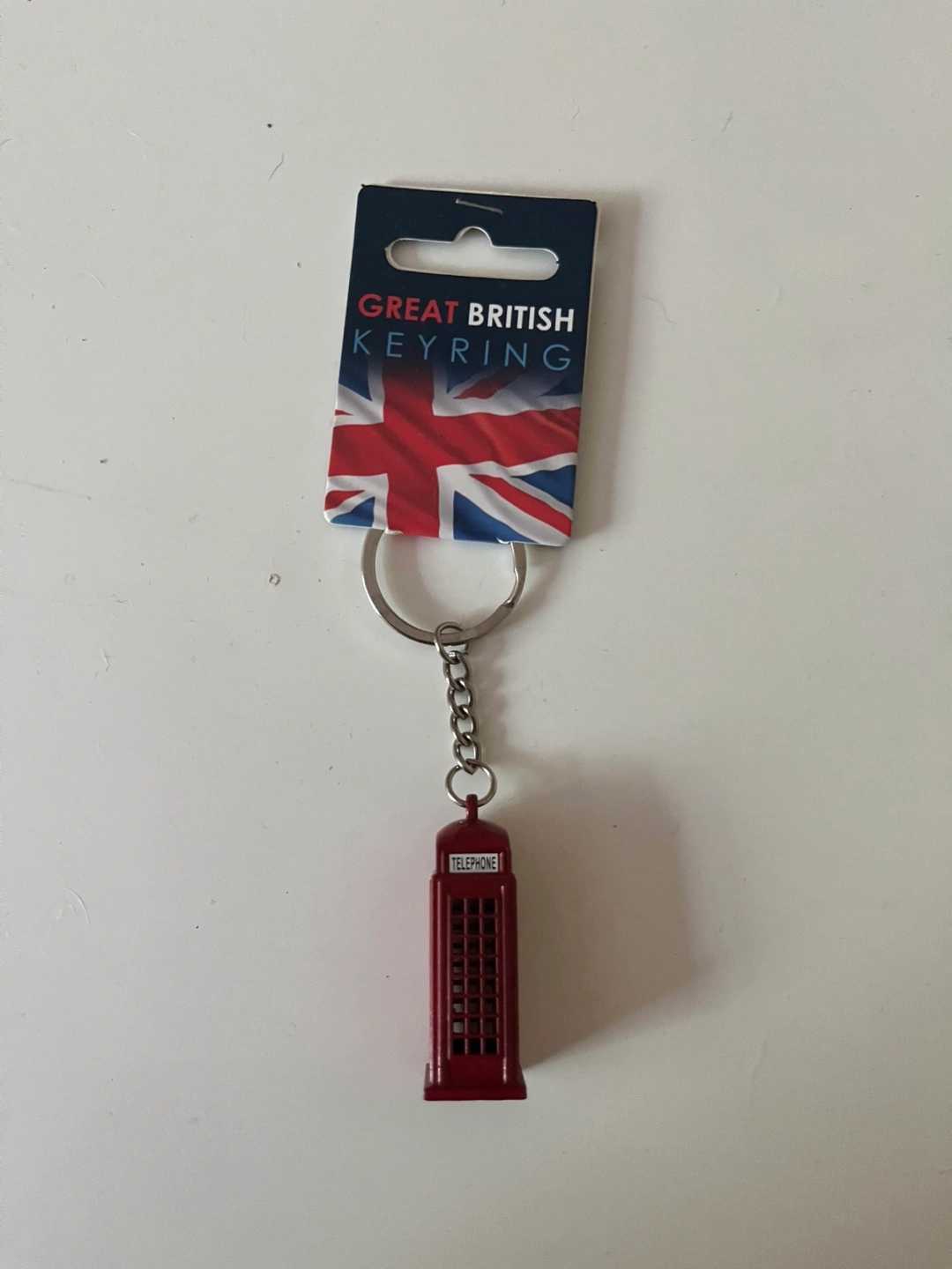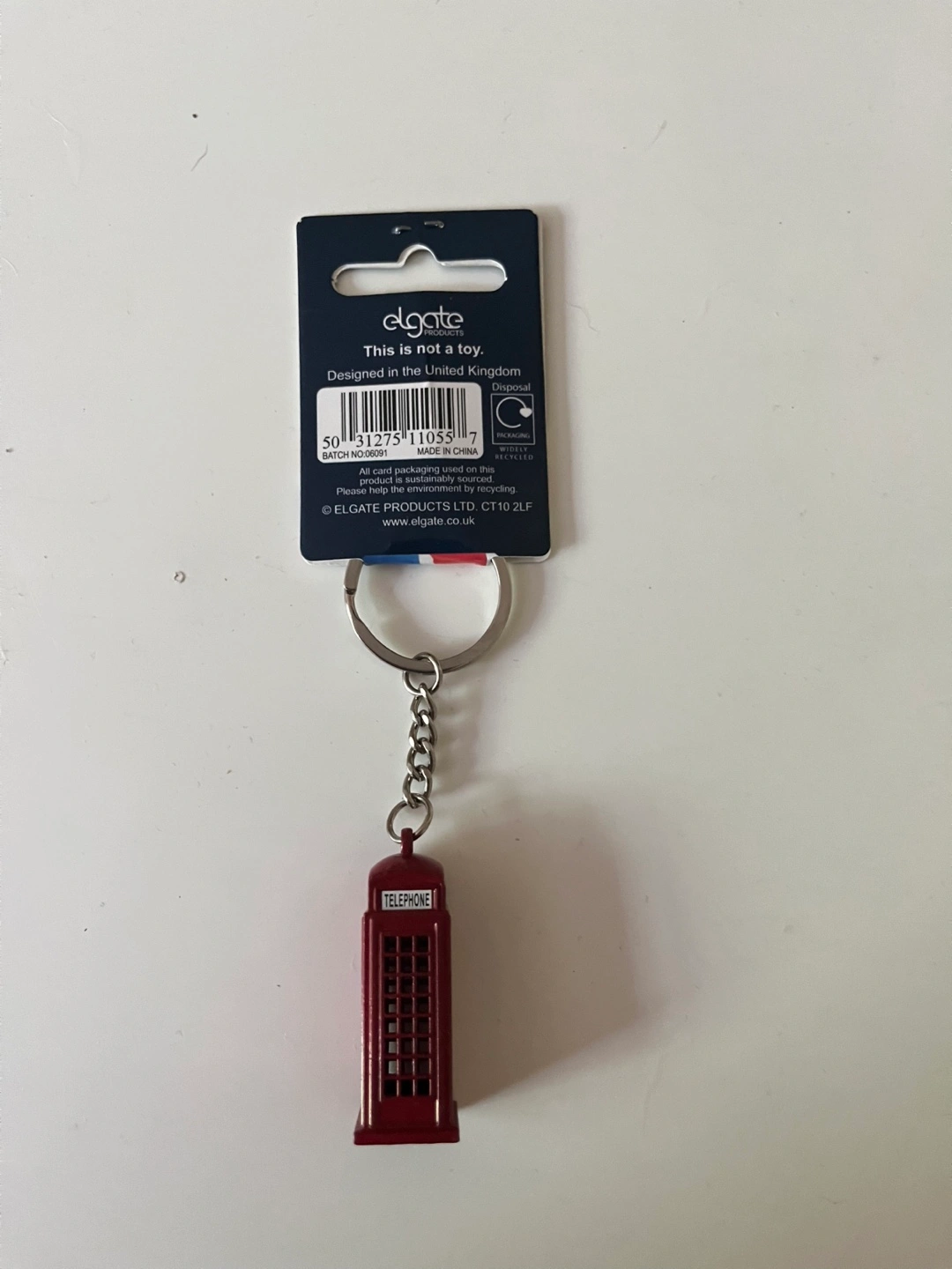 Red telephone booth keyring. Attached to a silver chain and keyring. New in package. Great souvenir or gift.