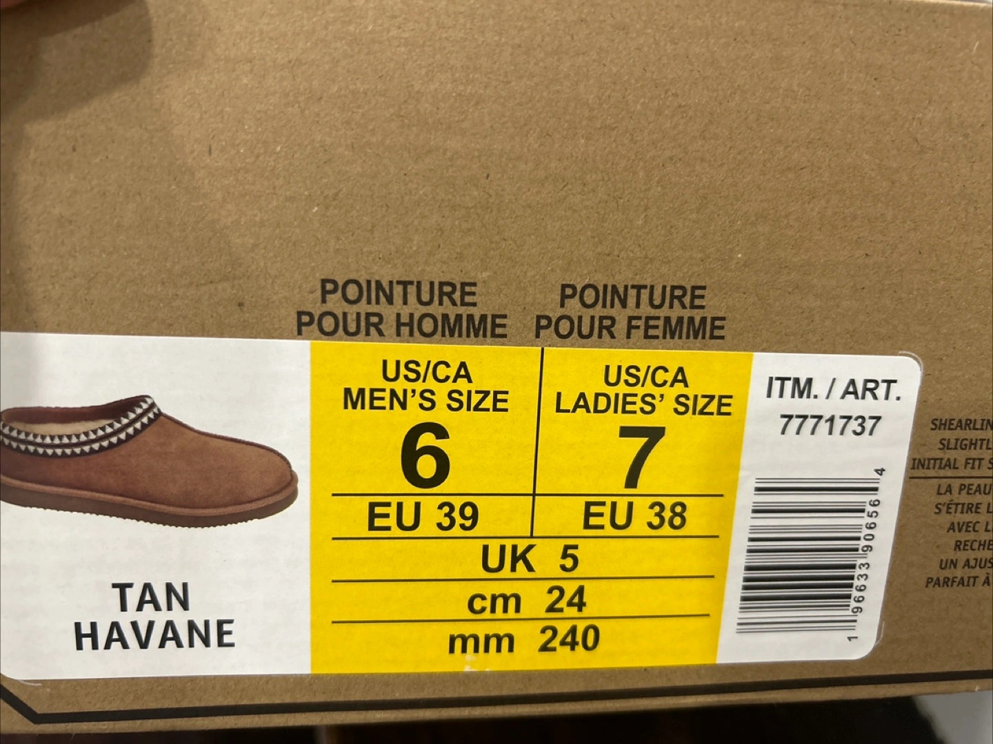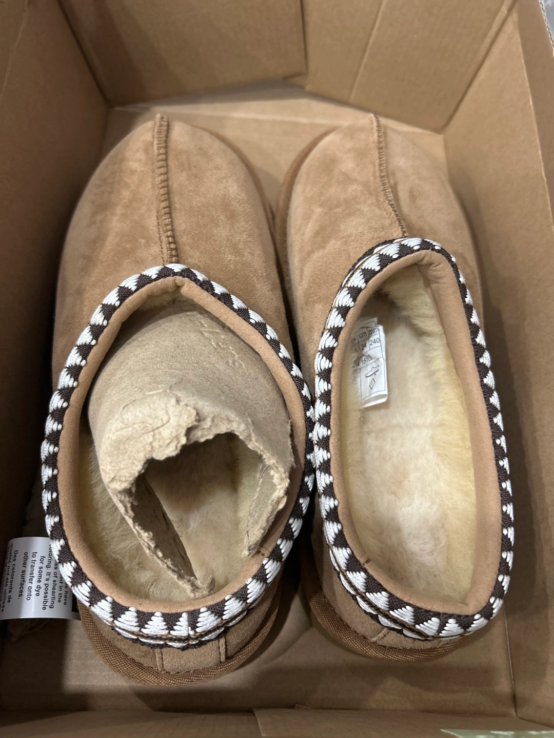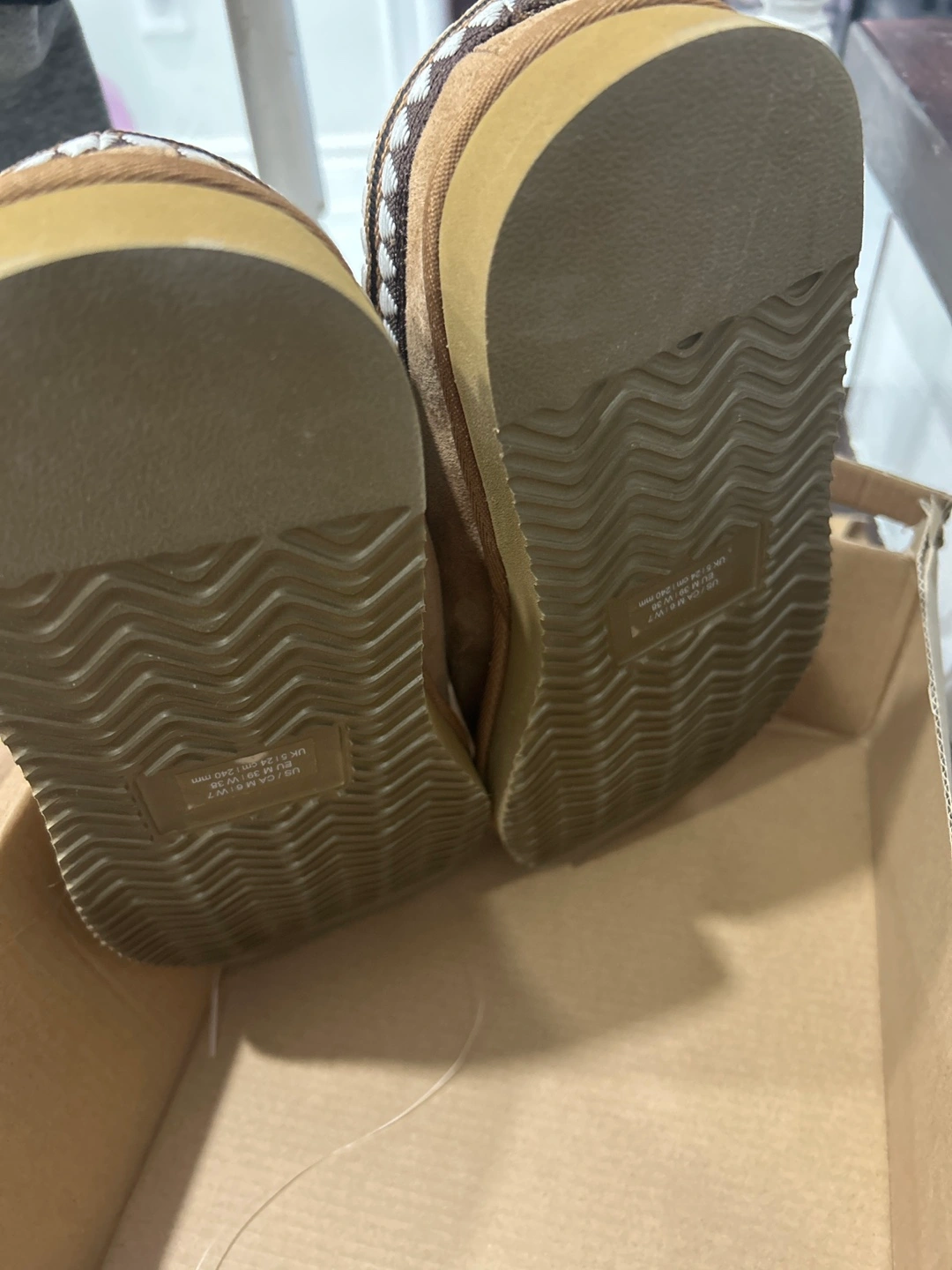 Kirkland women's slippers. Size 7. Tan sheepskin. Brown and white patterned trim. Brand new
