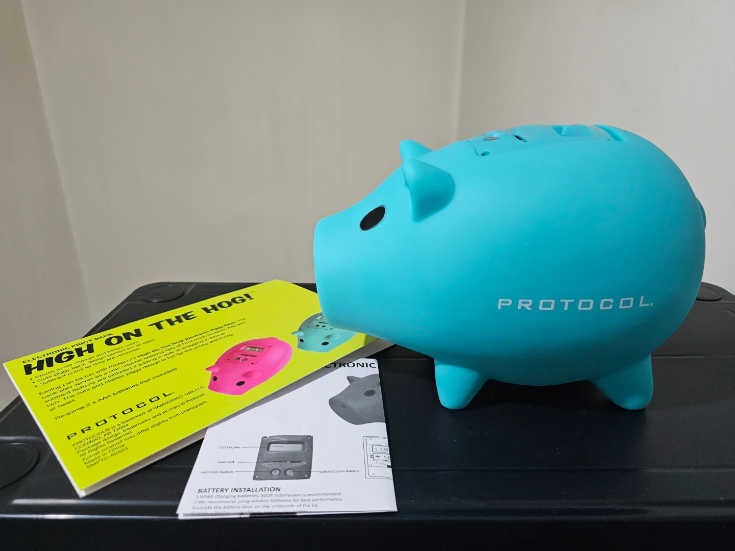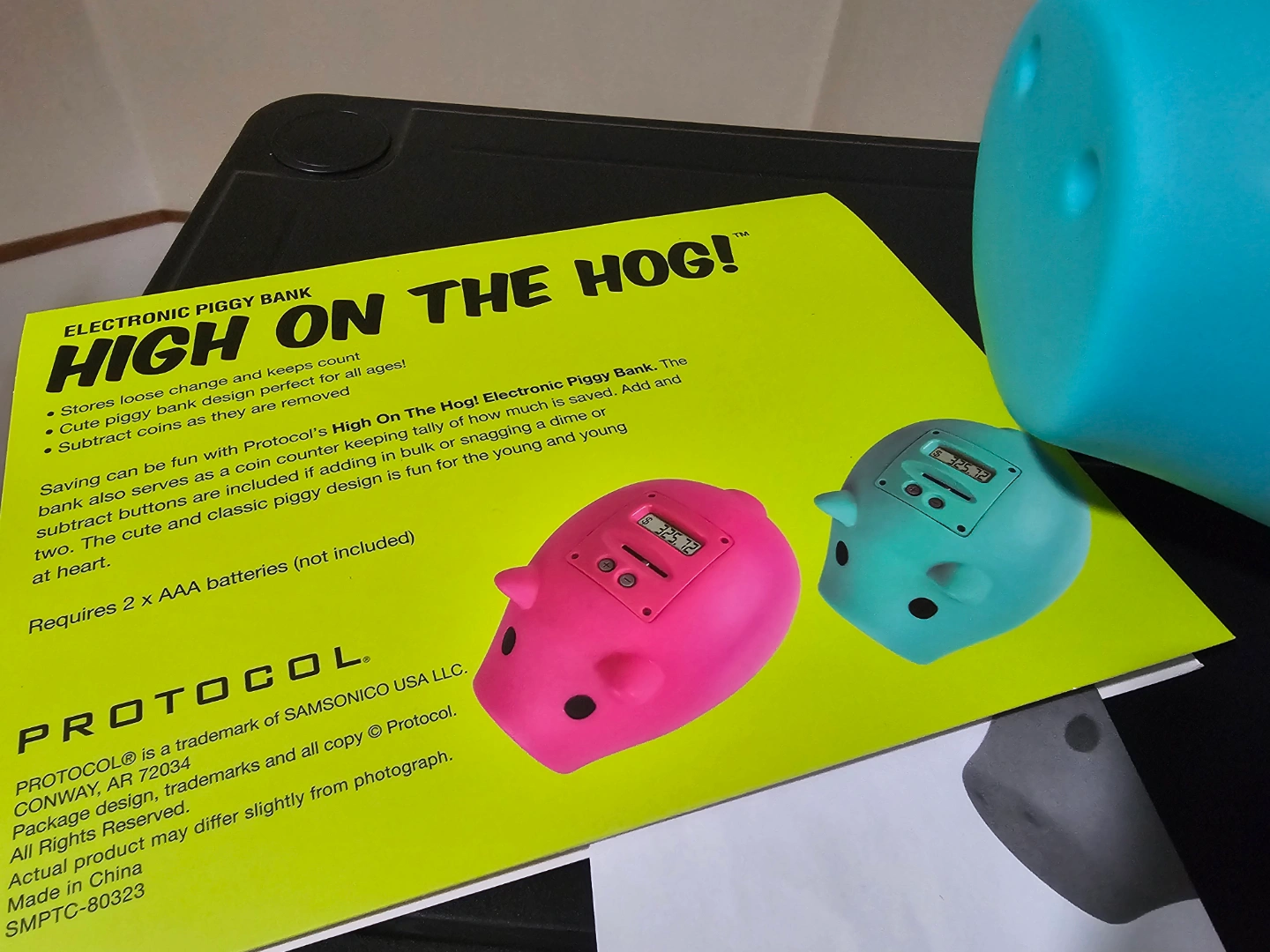 MOVING SALE The bank also serves as a coin counter keeping tally of how much is saved Add and subtract buttons are included if adding in bulk or snagging a dime or two Stores loose change and keeps count on an LCD screen Cute piggy bank design perfect for all ages! Dimensions: H 10.23" x W 6.69" x D 6.69" Weight: 0.01 lbs. 2 AAA batteries required (not included) Material: PVC, PS, and Glass FINAL SALE Accepting cash only please