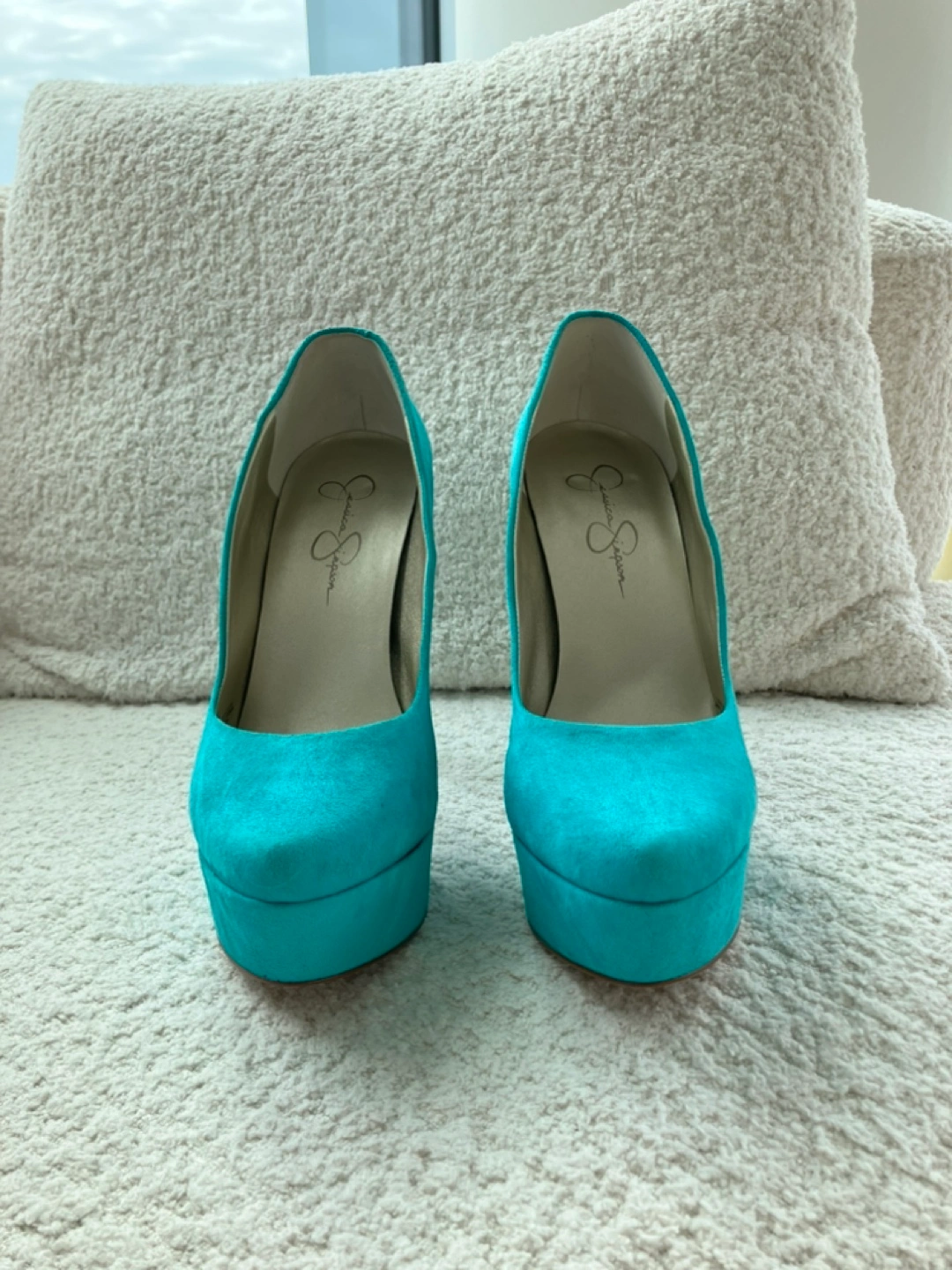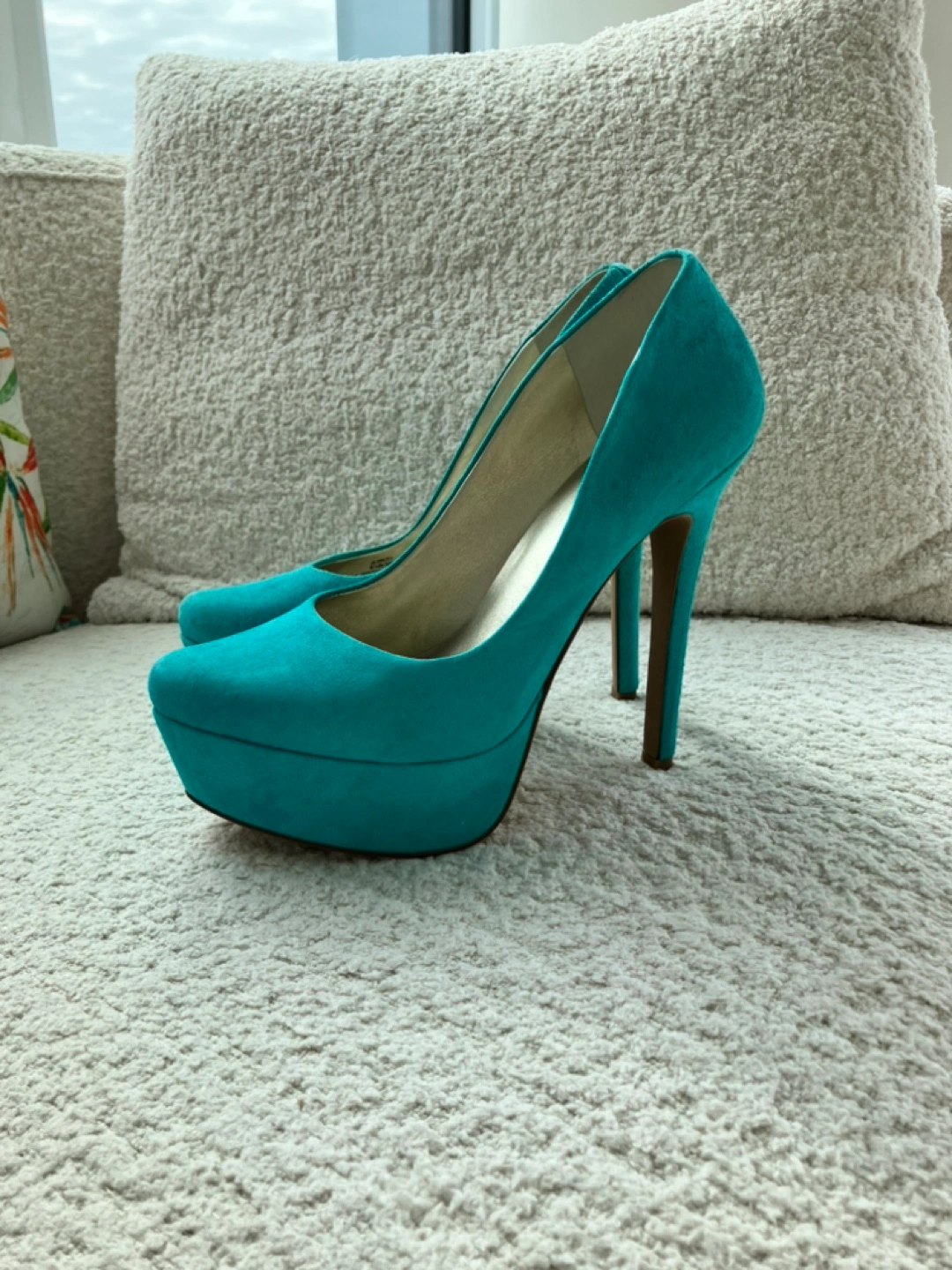 Gorgeous Teal/ Turquoise suede platform pump. Size 8.5 B Heel height 5 “ Platform height 1.5 “ Never worn, just tried on. Bought for $100. Smoke/pet free home Cash only please For pick up at dufferin and dupont.