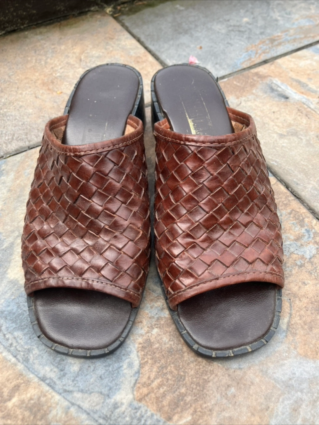 Perfect for spring & summer!Women's brown leather woven mules. Low block heel. Open toe. Genuine leather upper. Size 7.5. Cash only, p/up in Thornhill, Yonge St & Elgin St, south of Hwy 7/407