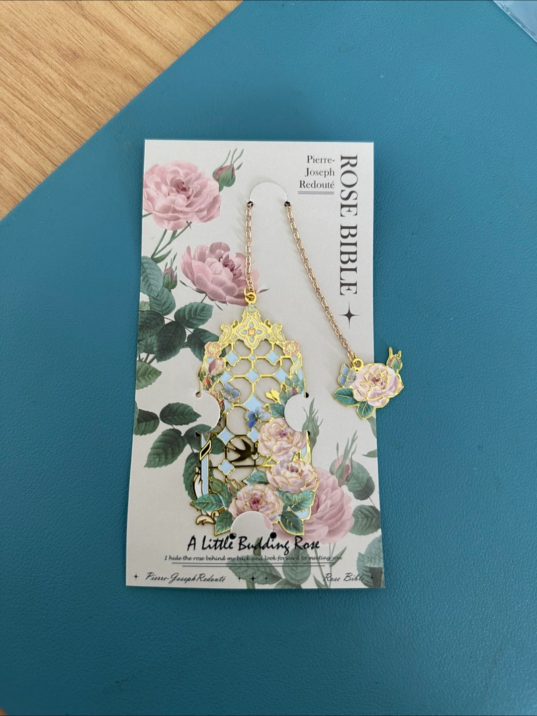 Beautiful rose-themed bookmark. Features delicate gold chain and enamel details. Perfect for book lovers.