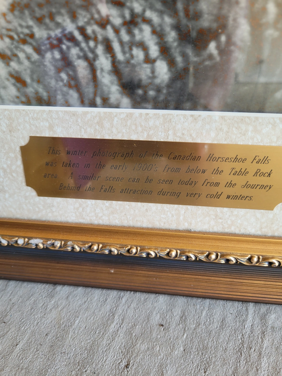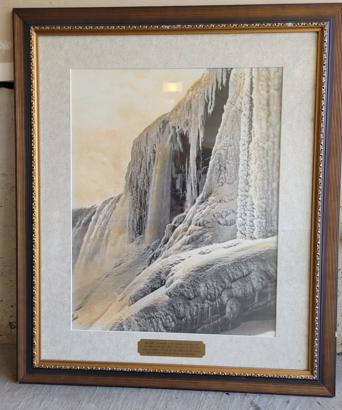 Vintage framed photograph of the Canadian Horseshoe Falls in winter. Taken in the early 1900s. Features a gold ornate frame. Minor damage to frame.