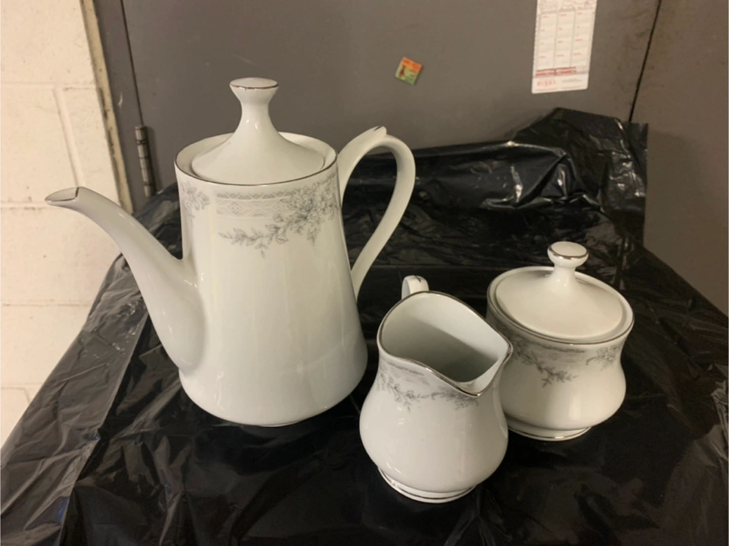 Elegant vintage coffee and tea set. Includes coffee pot, creamer, sugar bowl, and lids. Grey floral pattern. Excellent for serving or display.