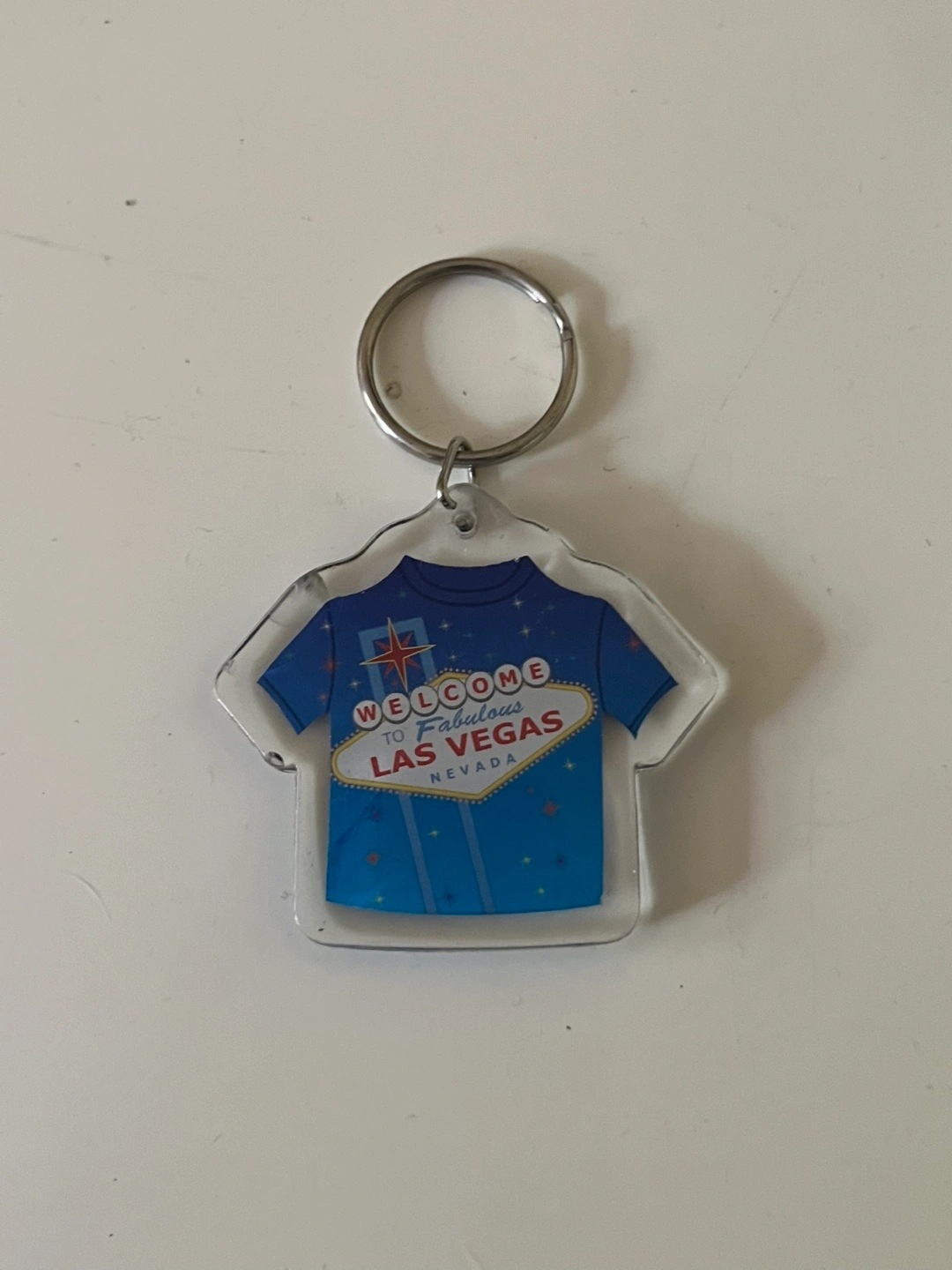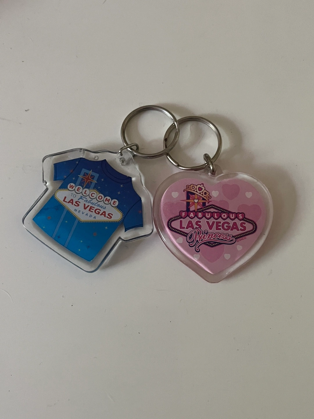 Two Las Vegas themed keychains. One shaped like a shirt, the other a heart. Clear plastic with colourful designs. Collectible souvenirs.