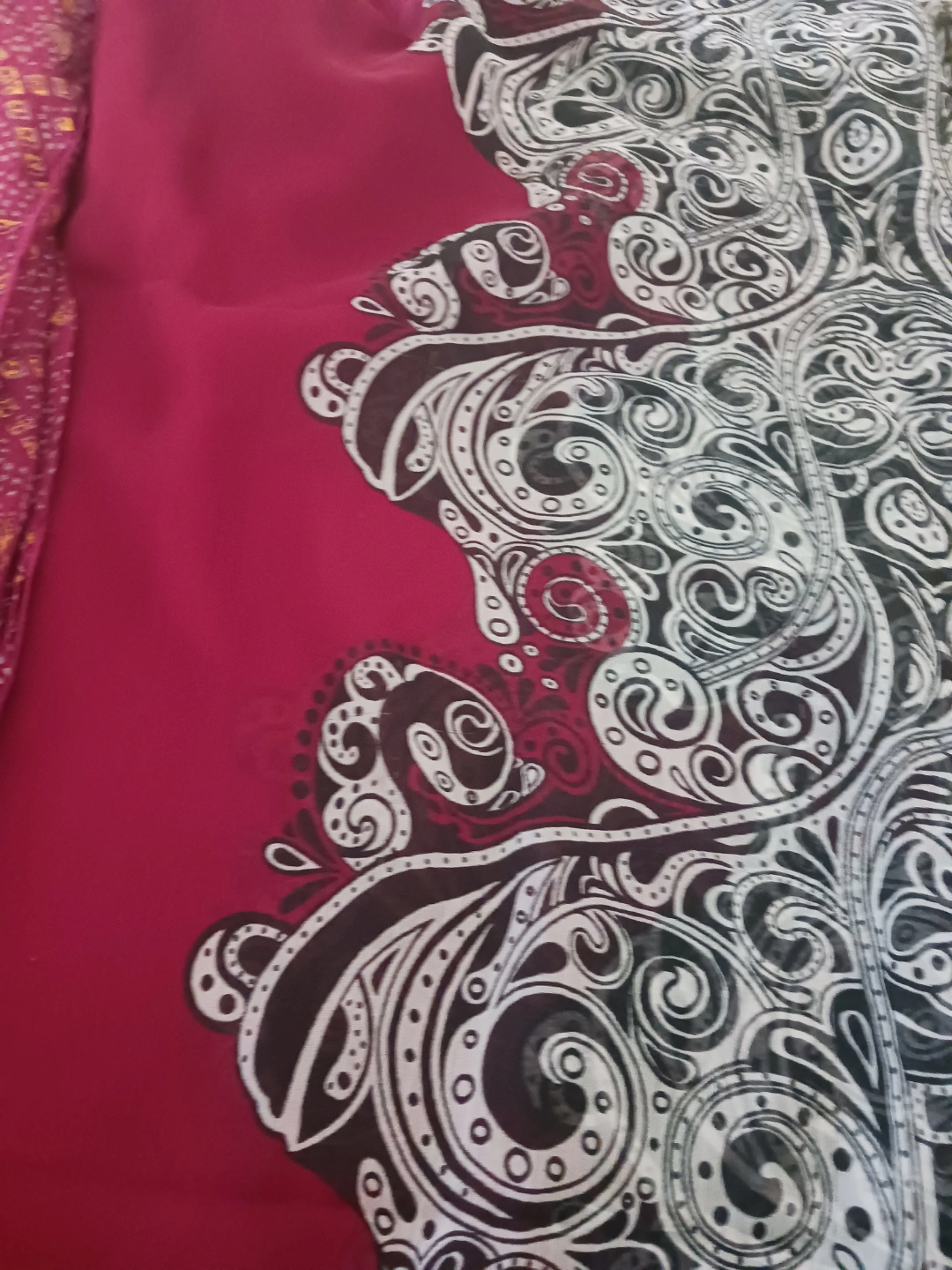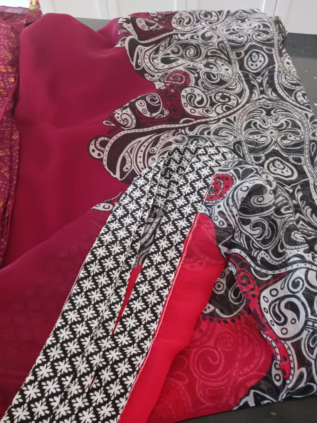 Lightweight sheer scarf. Burgundy background with black and white paisley print. Features a patterned border. Suitable for various occasions.