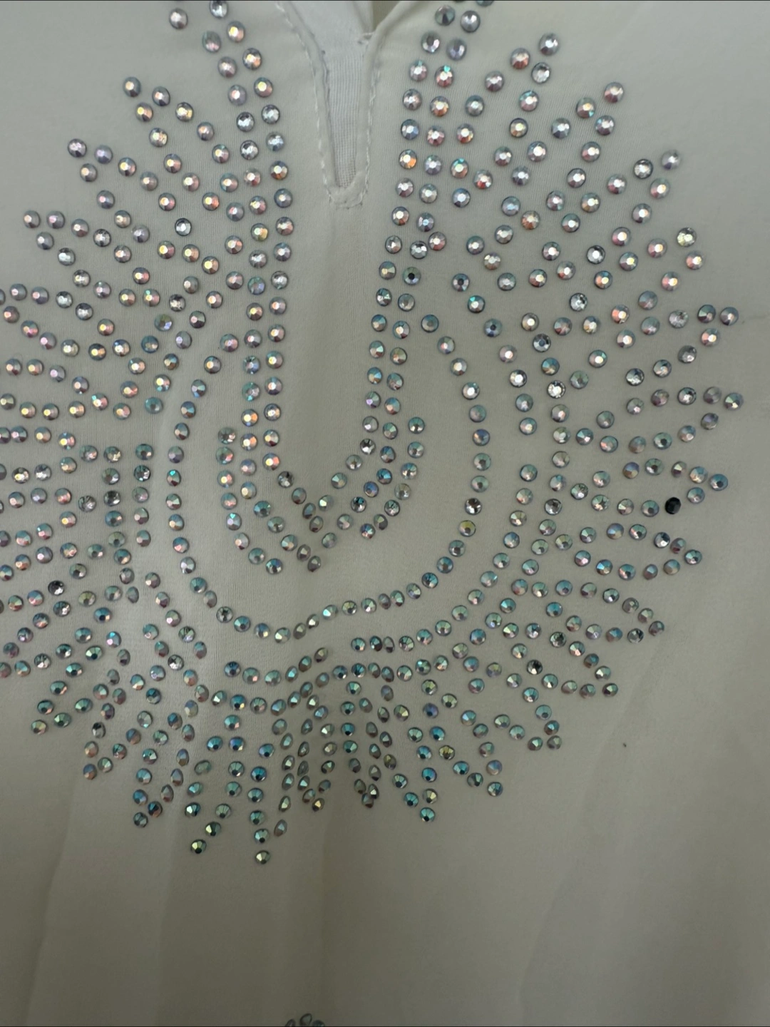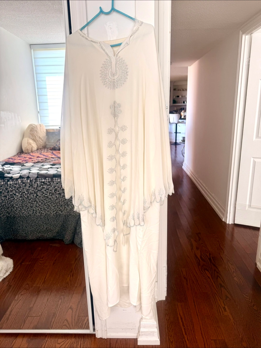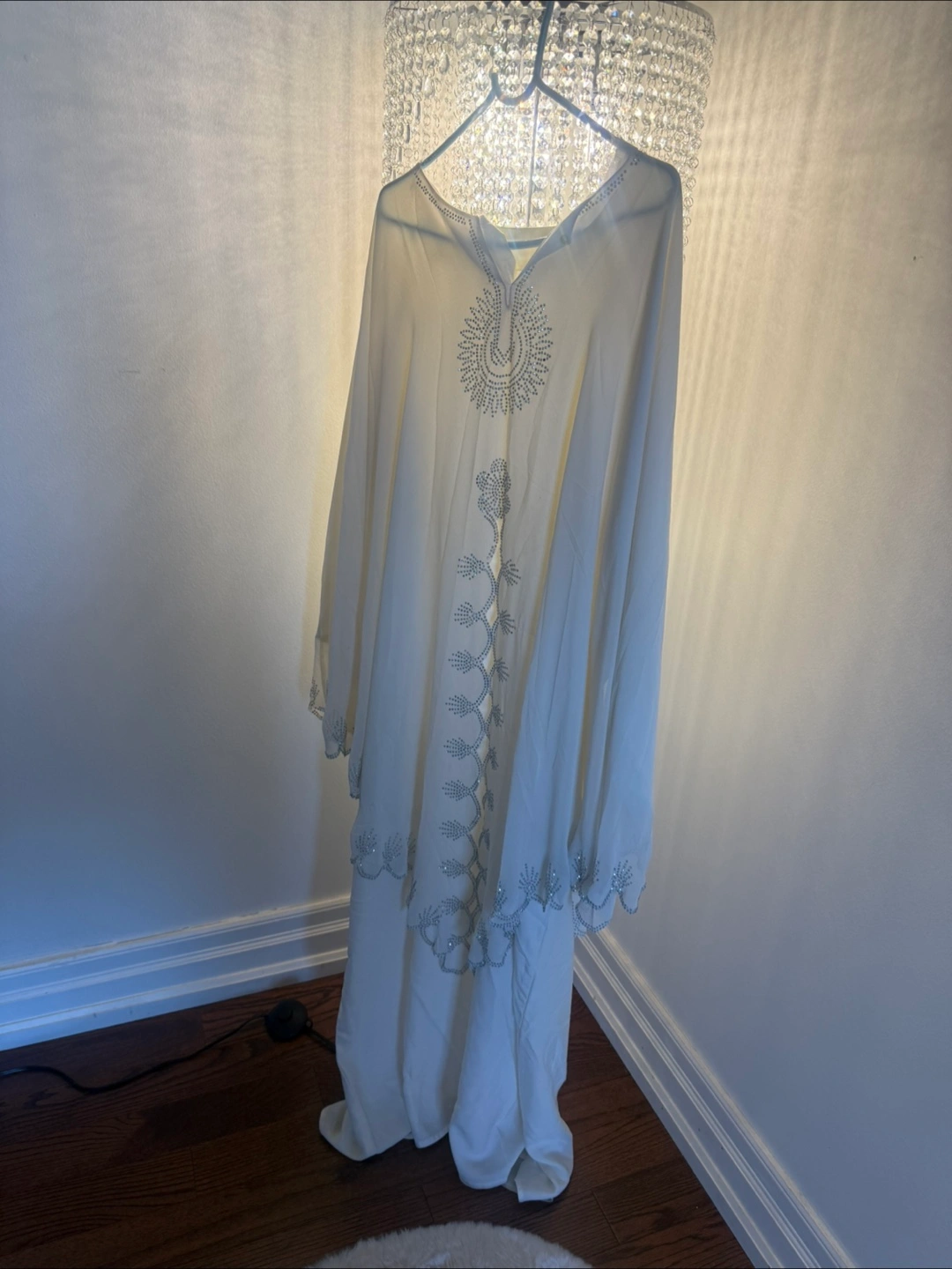 Beautiful off-white kaftan. Features intricate beaded detailing. Dubai style Abaya ,Long sleeves, floor-length. Relaxed fit. Perfect for special occasions.