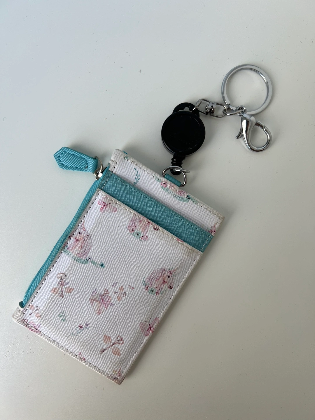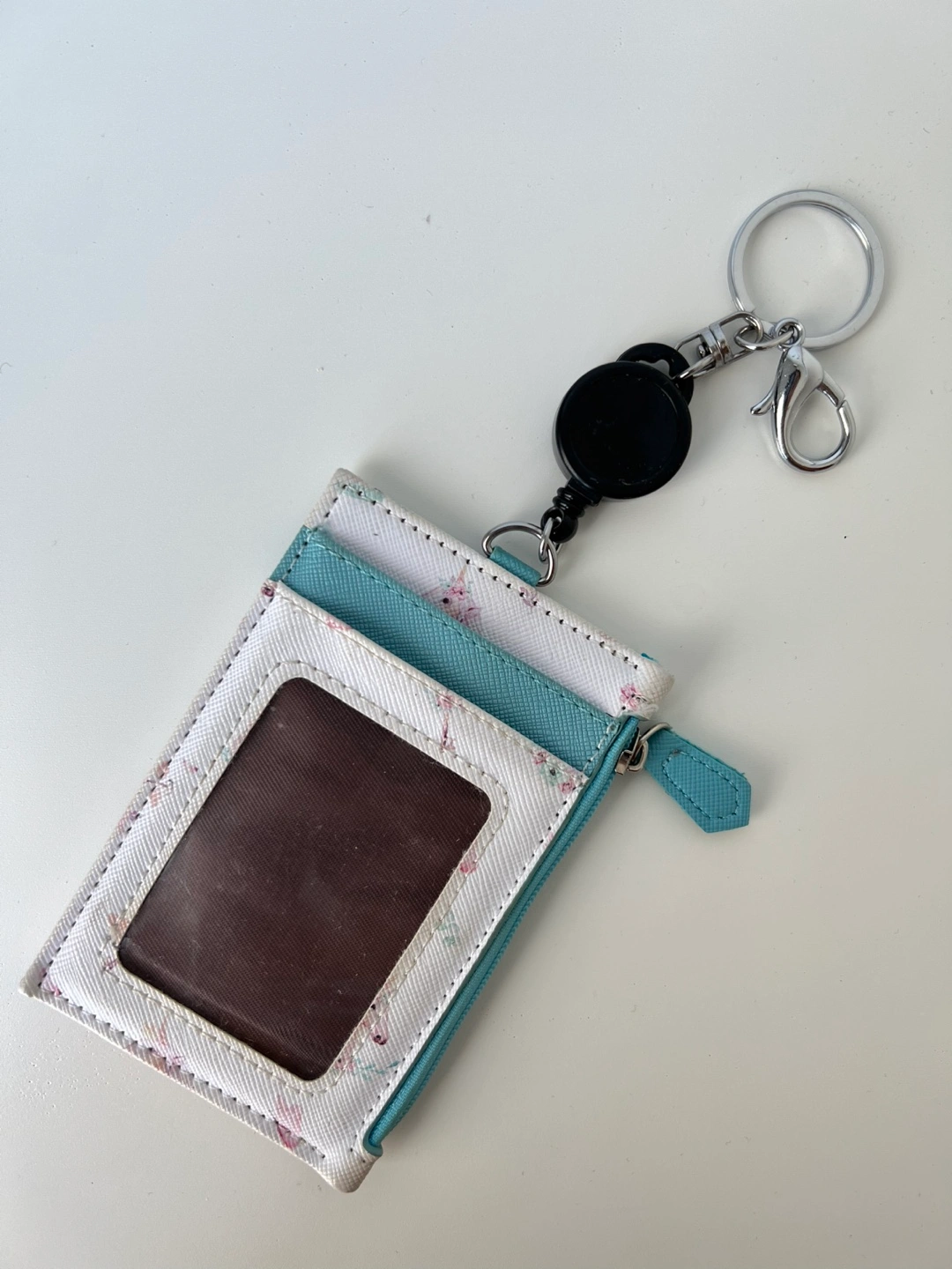 Like New Zip Pouch Cute floral pattern in light blue and white. Features a clear ID window and a retractable reel keychain, making it perfect for keys and cards. Stylish, practical, and barely used! Got it from Singapore