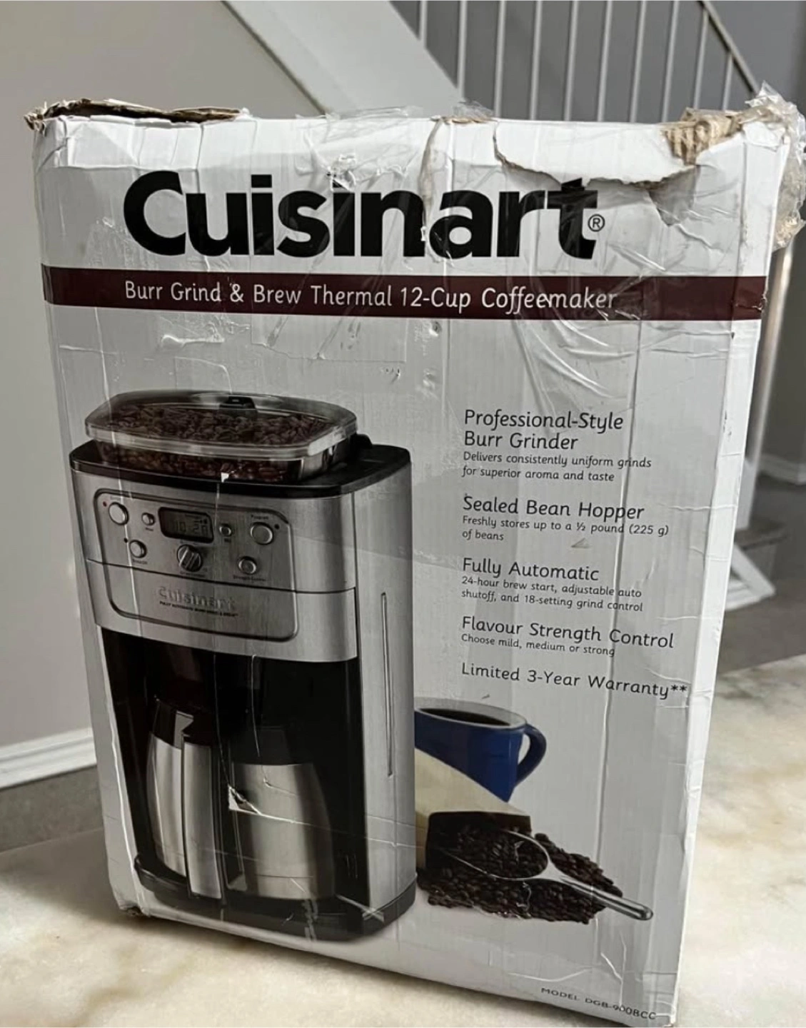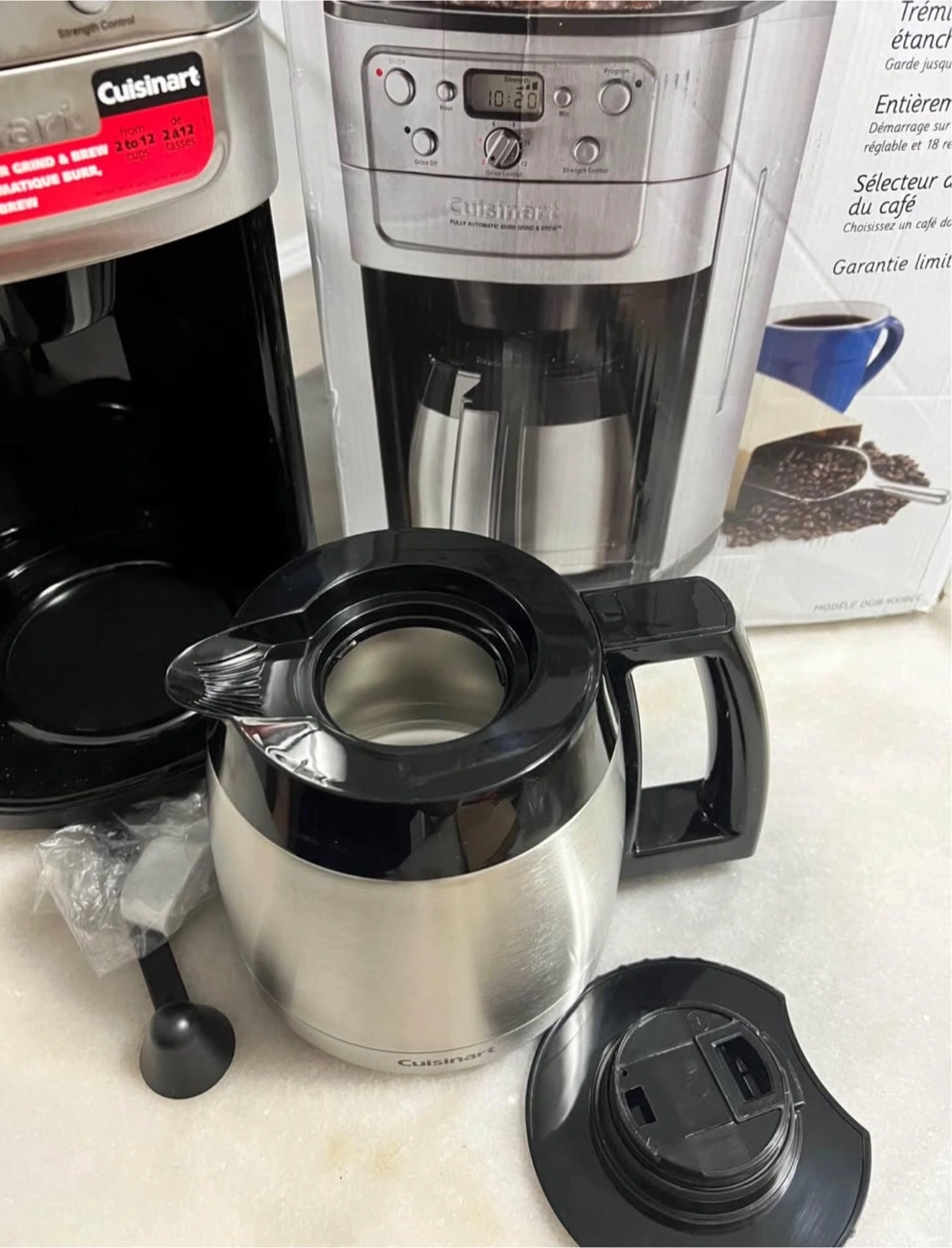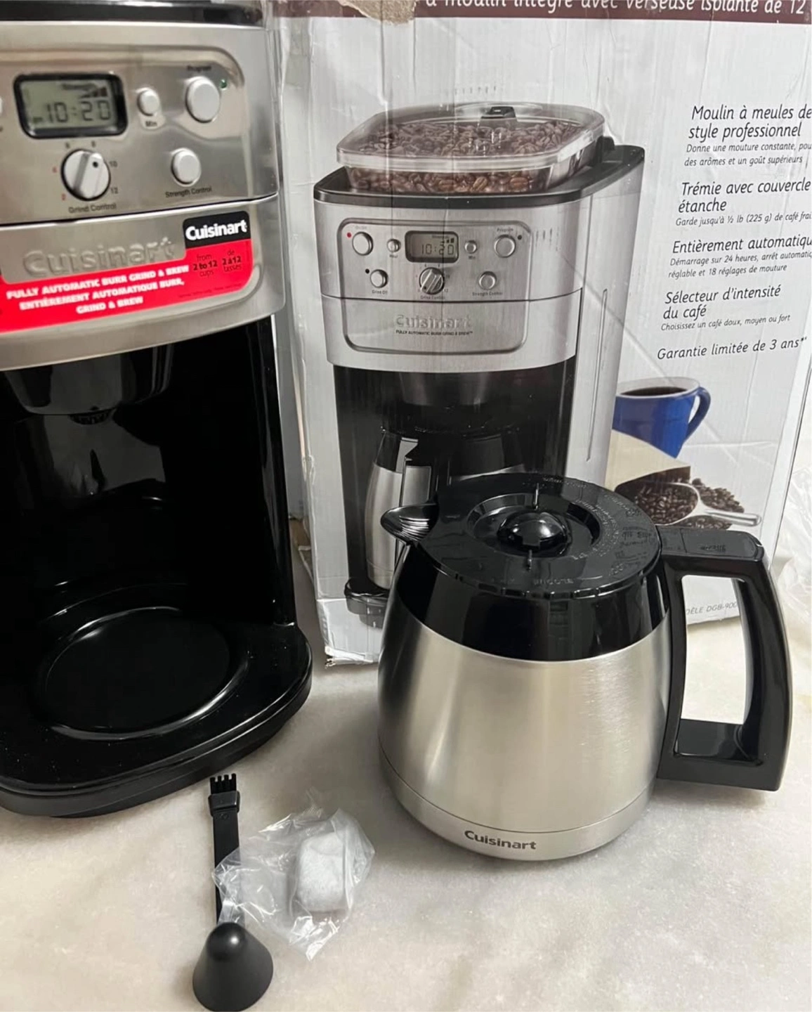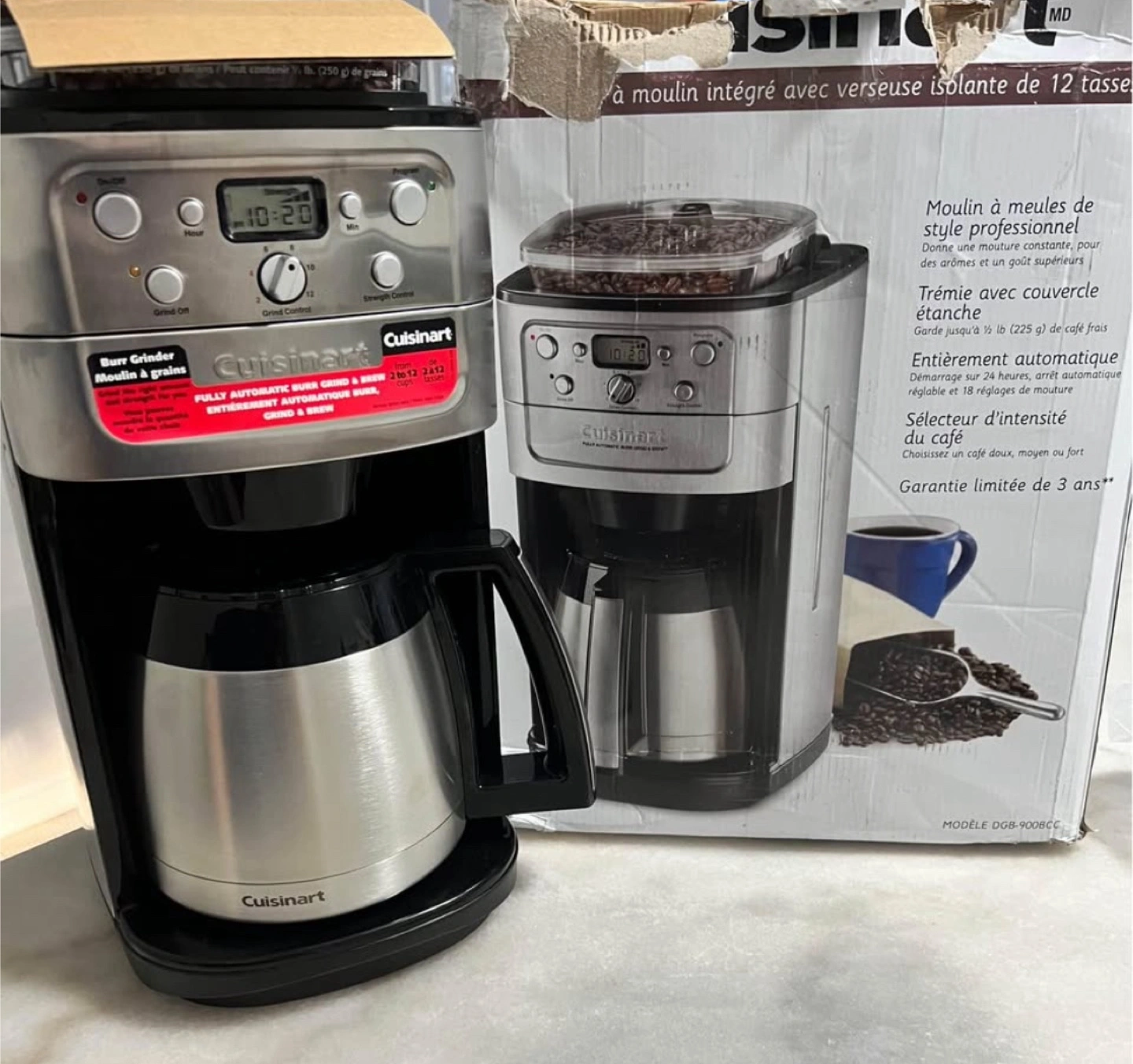 Burr Grind & Brew 12-Cup Automatic Coffeemaker, Stainless Steel Description: Cuisinart Model: DGB-900BCC is like new original box used 2 times! Key Features: Charcoal Water Filter 5 Oz Elegant Brushed stainless steel styling Has 8 oz Bean hopper with a sealed lid to prevent moisture Burr Grinder automatically grinds beans before brewing Strength selector, Choose coffee strength when brewing with the grinding of beans: Strong, Medium or Mild Portion Control, Program the amount of coffee you want to grind: choose from 2 to 12 cups Our Price: $165 Local Pickup in Westmount Delivery & Shipping Available — Item #: HACART900