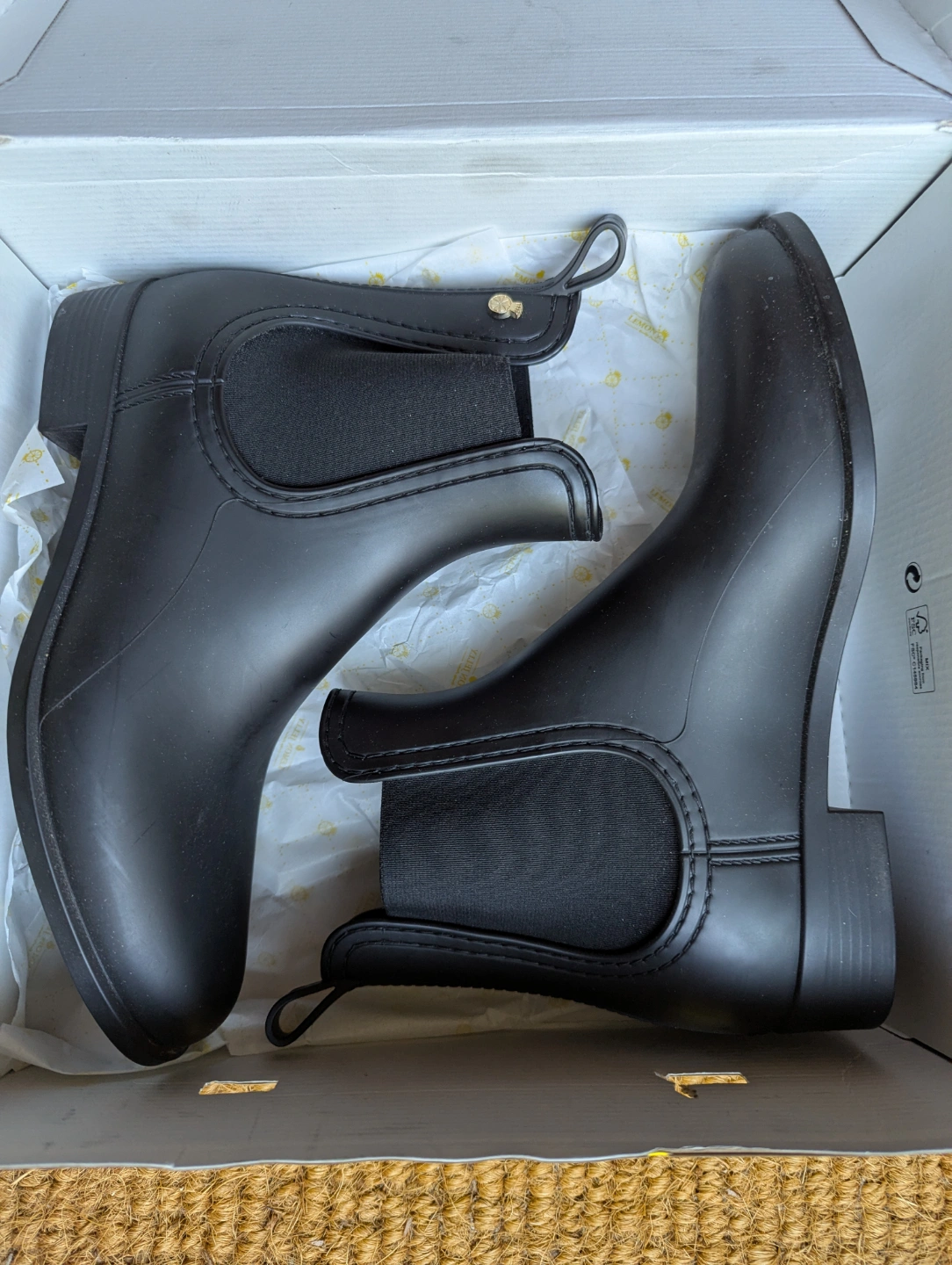Looking to trade for size 9.5 shoes or $50. Brand new pair of women's black rain boots. Chelsea style. Size 39. Made in Portugal. Come in original box. Still smells lemony!