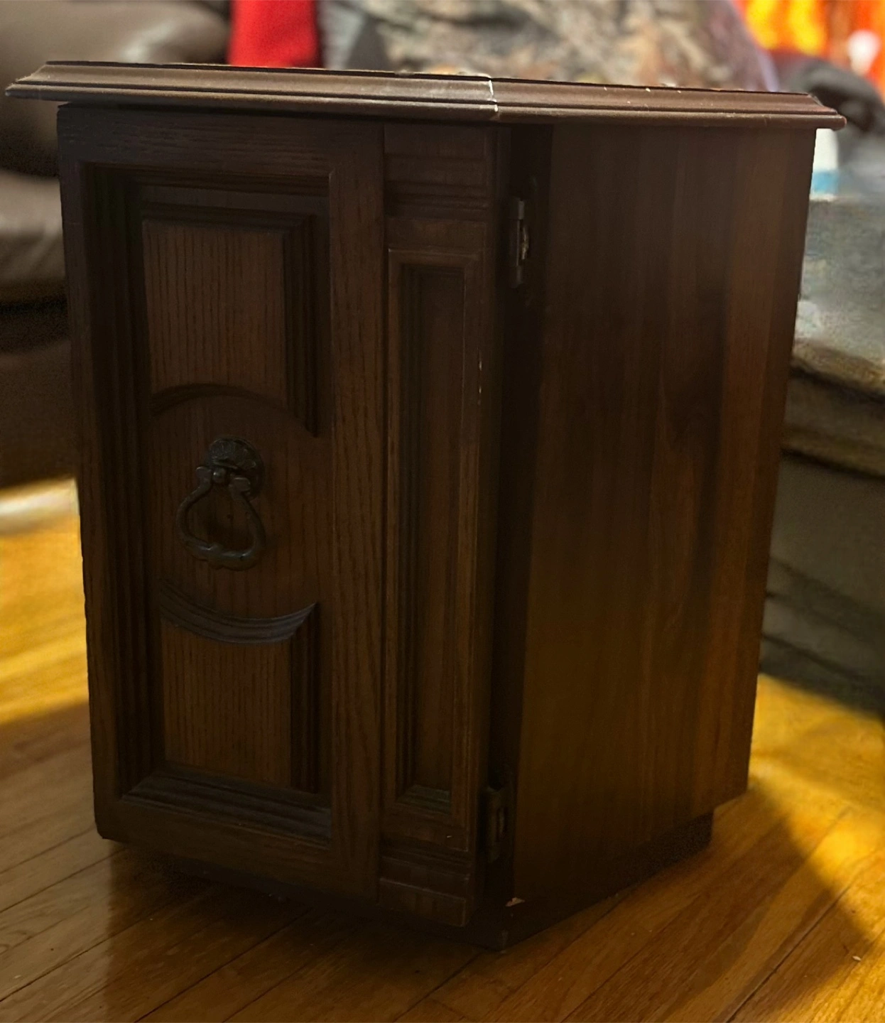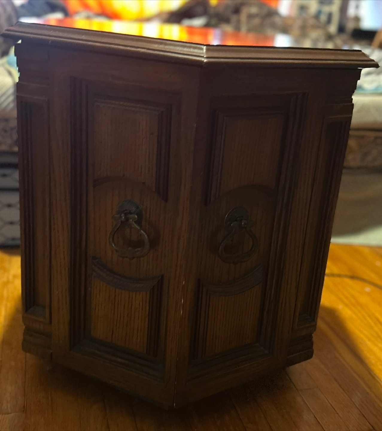 Vintage Hexagonal Wooden End Table with Storage Small vintage hexagonal wooden cabinet- end table, with a brown finish and intricate detailing. Two hinged doors and plenty of storage space. Adds vintage charm. Size : width of it is 22.375" and the height of it is 20”