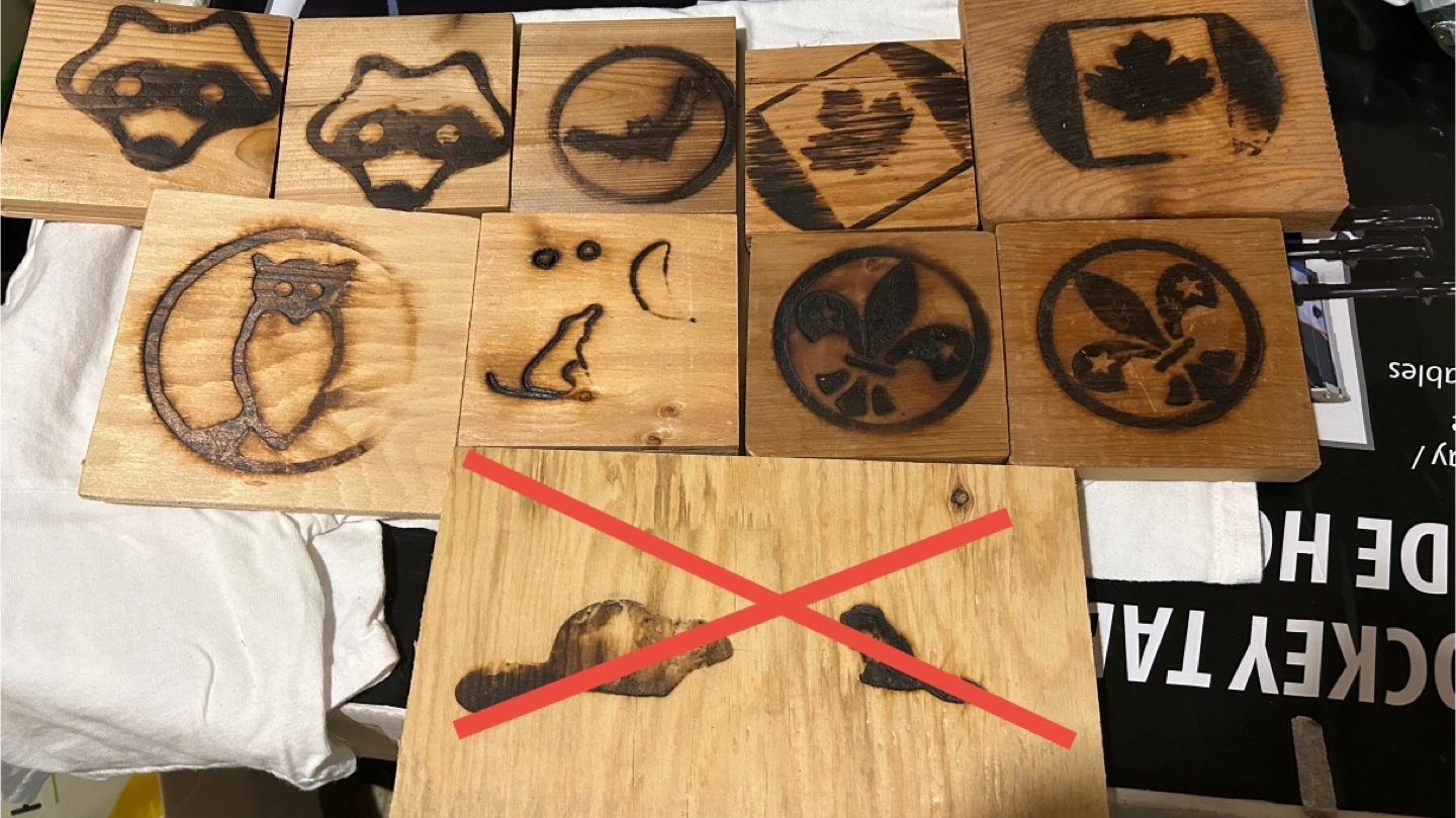 Nine unique, square wooden coasters. Each features a different wood-burned design. Designs include animals, plants, and symbols (scouts and Canada flag). Can be used for coasters, most of them are 1/2”. Owl is 1/4”.