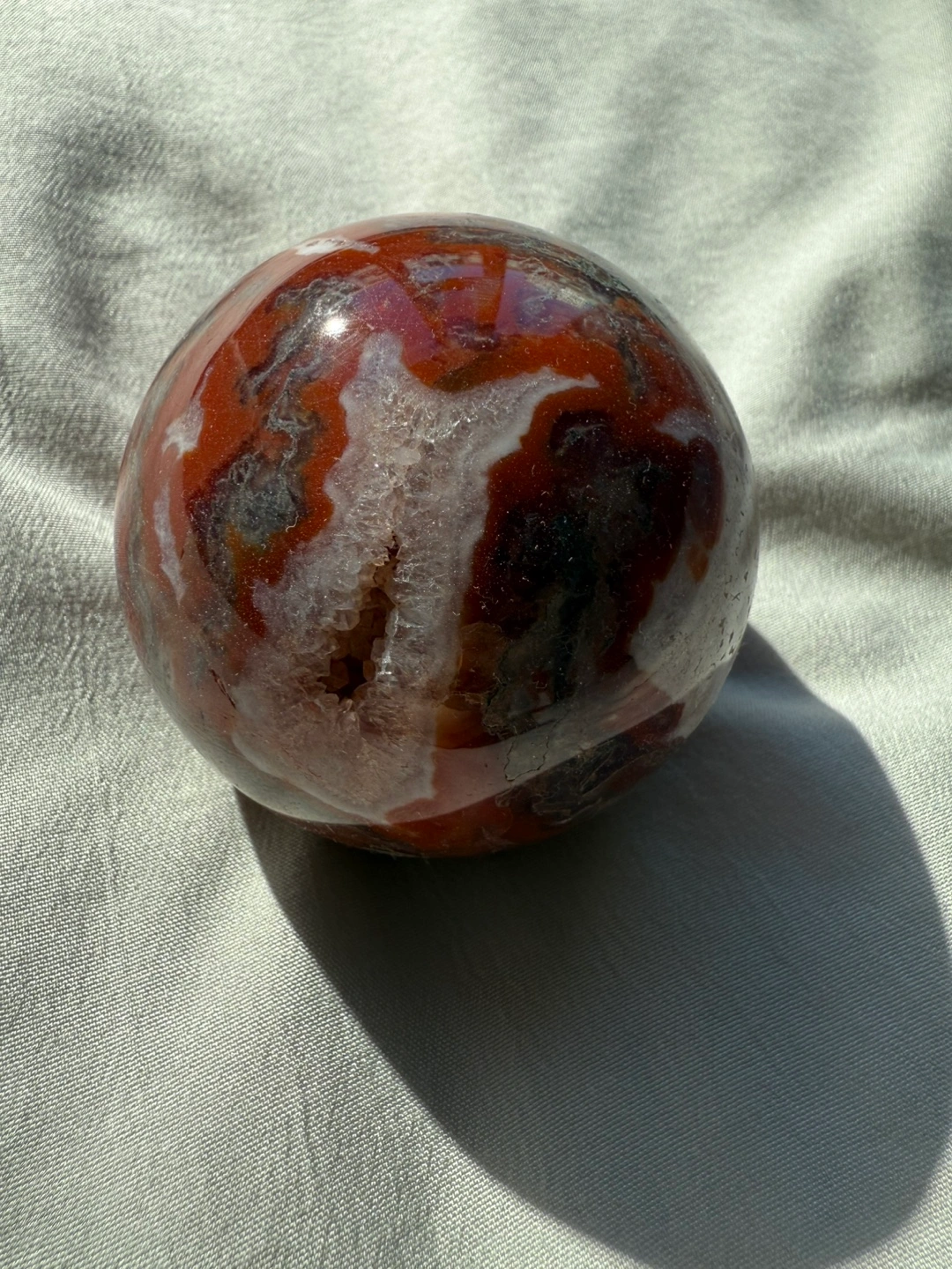 Beautiful polished carnelian sphere. Intricate patterns and colours. Unique geode cavity. Great for display or collection.