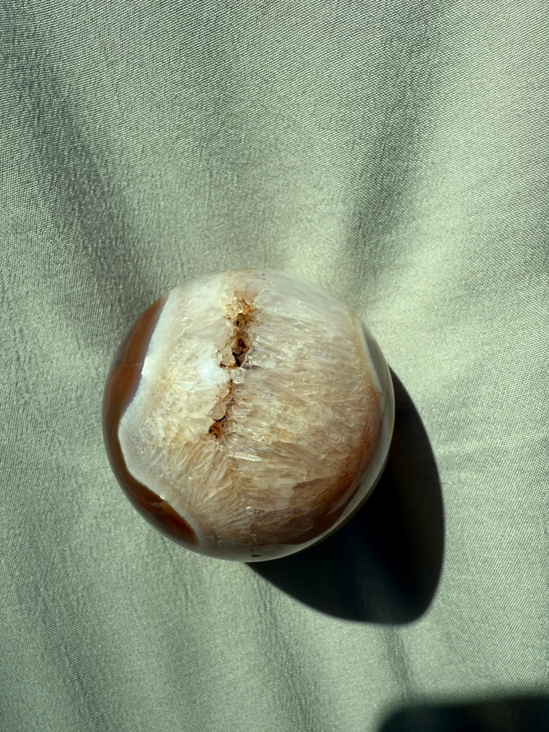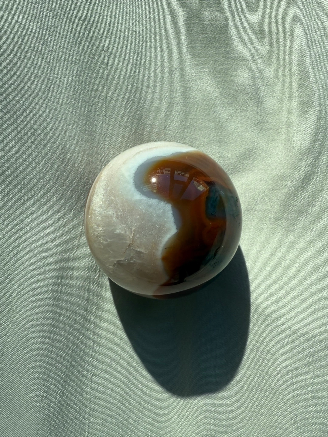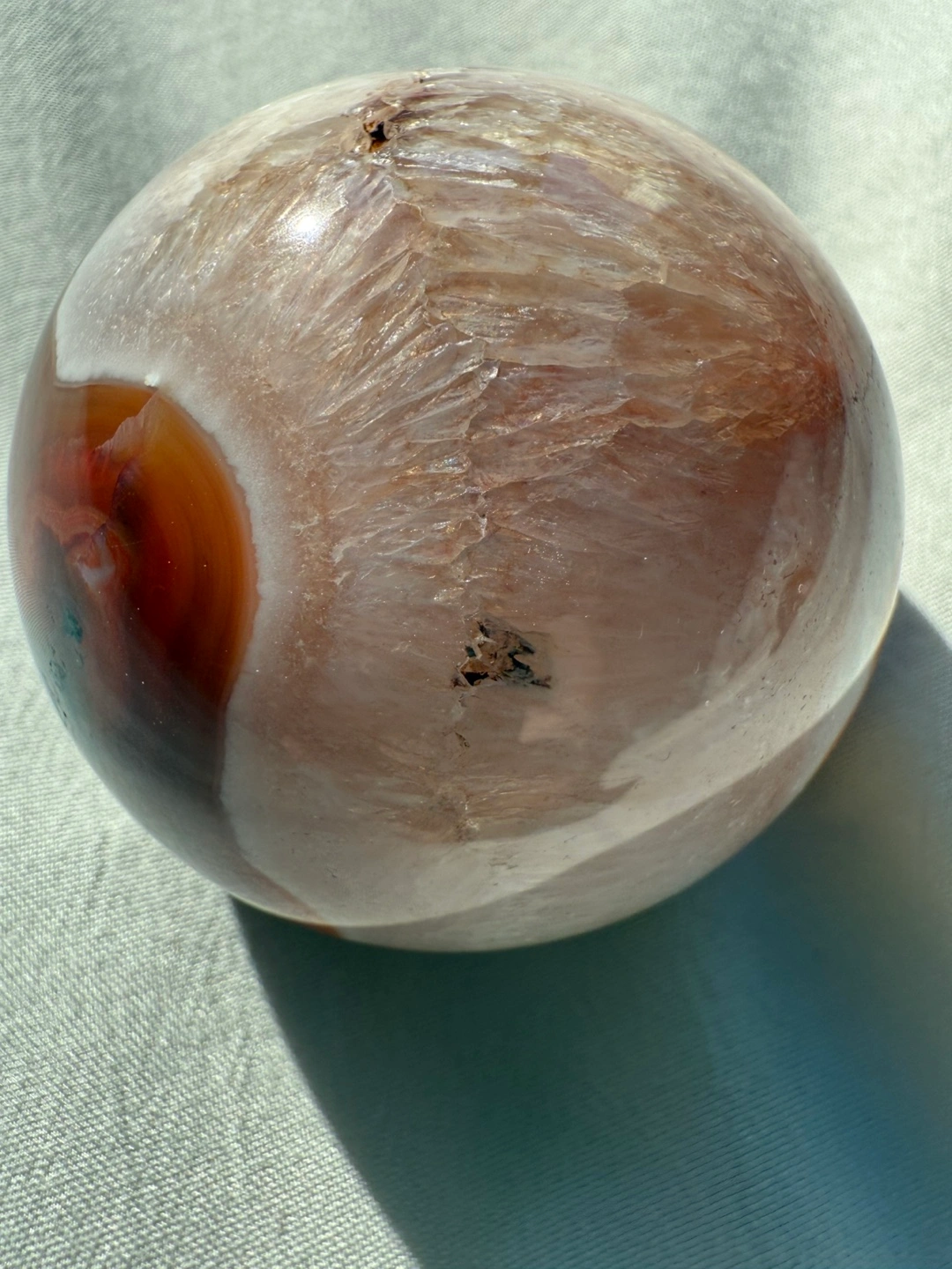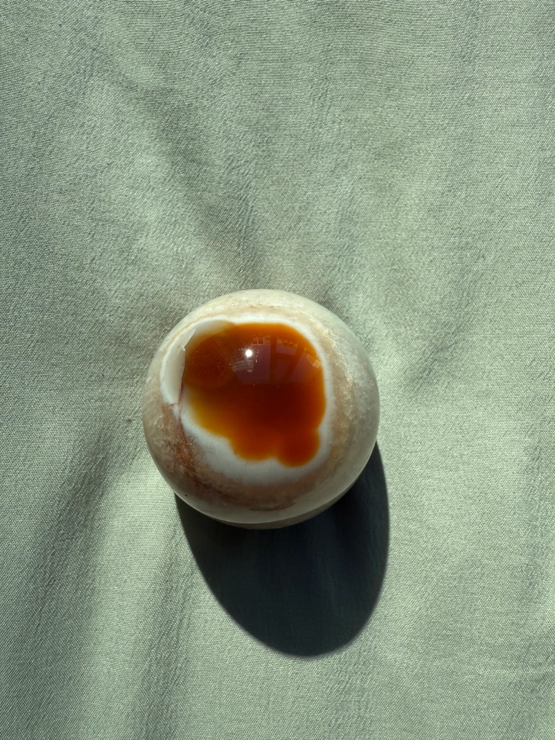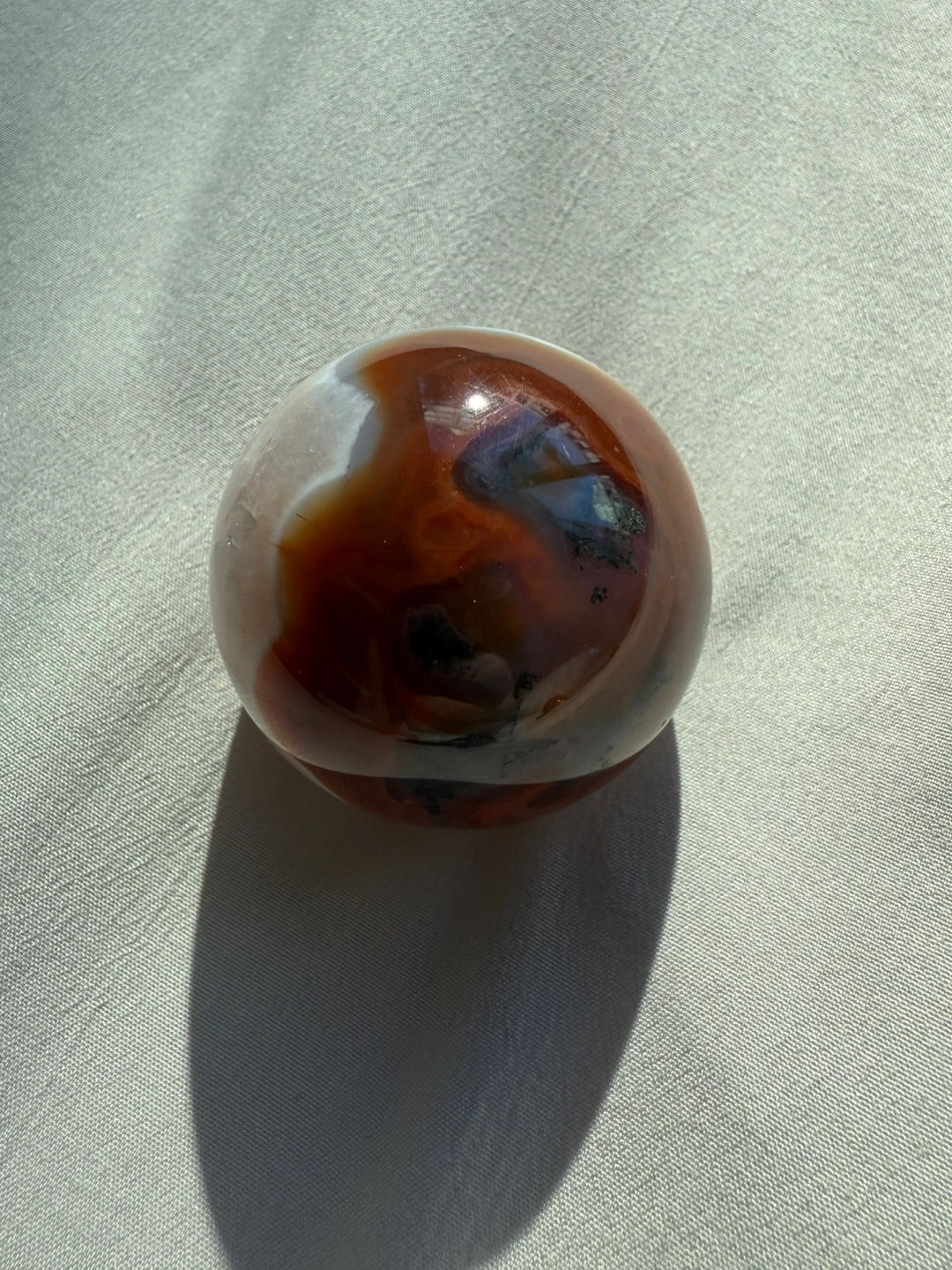 Beautiful polished carnelian agate sphere. Unique banding and colours. Great for decoration or crystal healing.