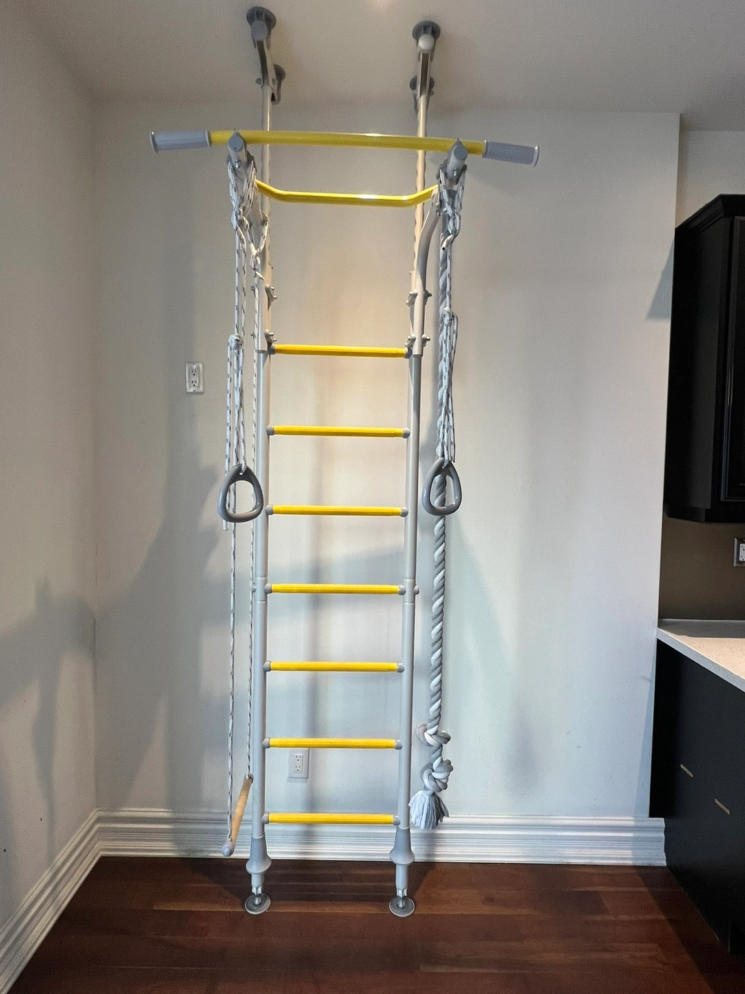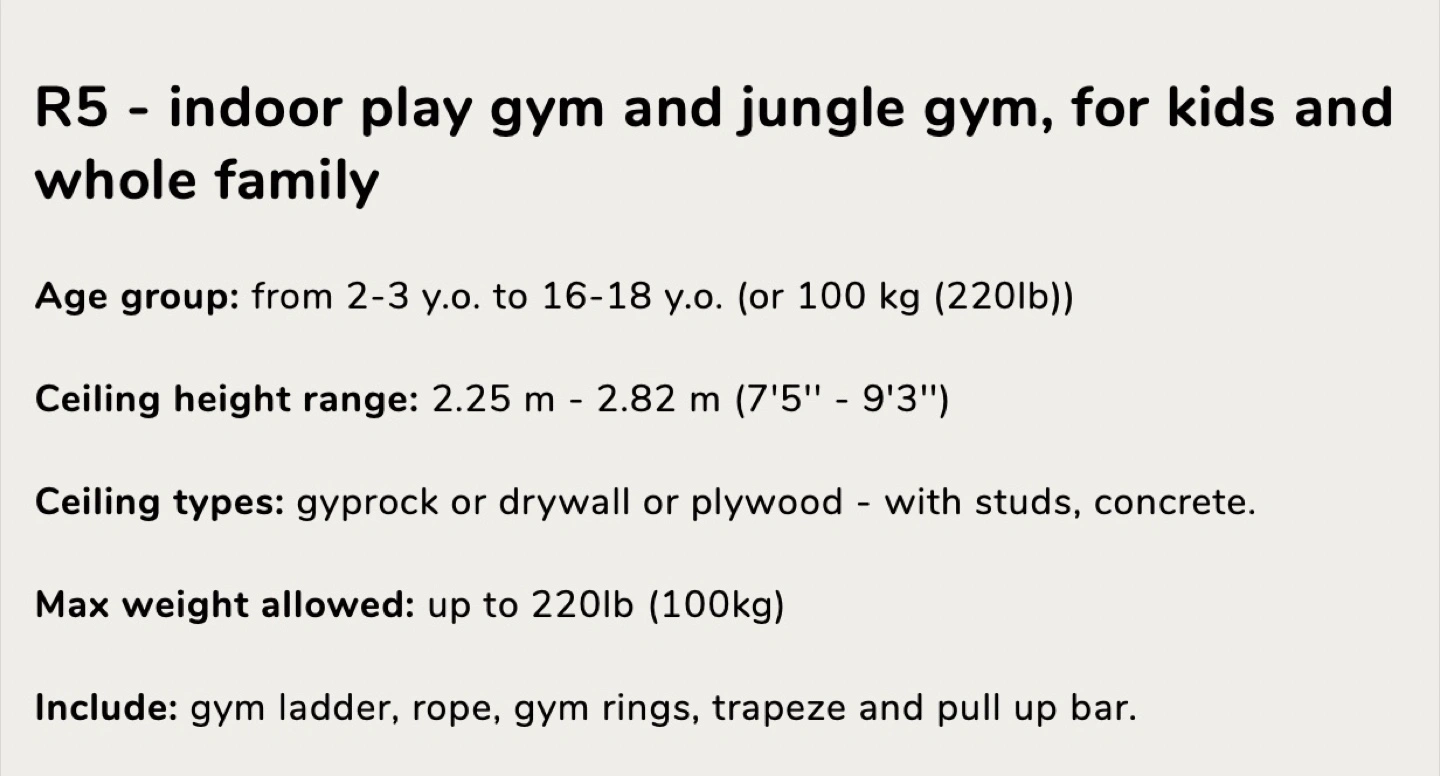 Indoor play gym and jungle gym. Suitable for ages 2-18 or up to 100kg. Includes gym ladder, rope, gym rings, trapeze and pull-up bar. Ceiling height adaptable, 2.25m - 2.82m. Gyproc, drywall, plywood or concrete ceilings.