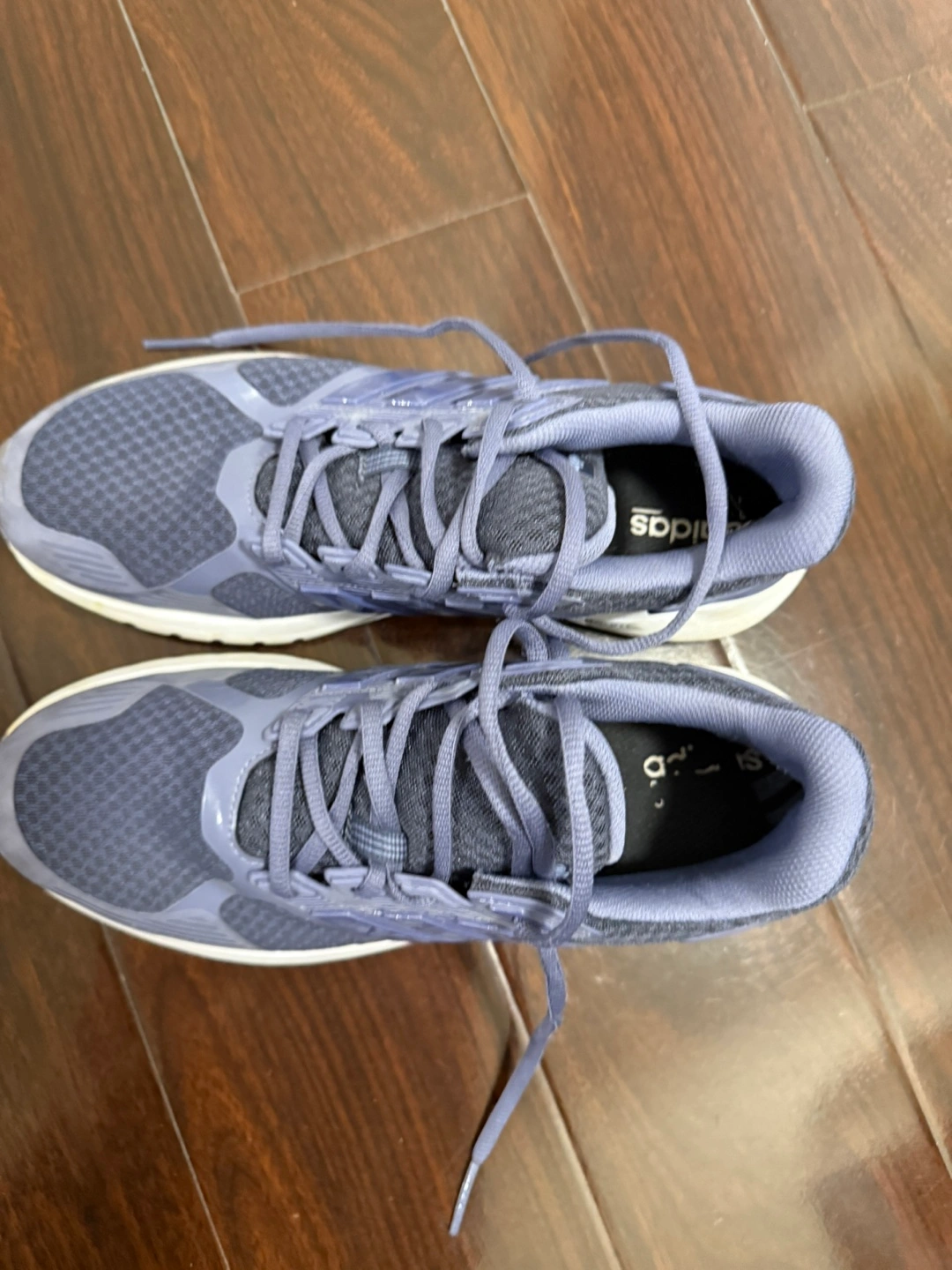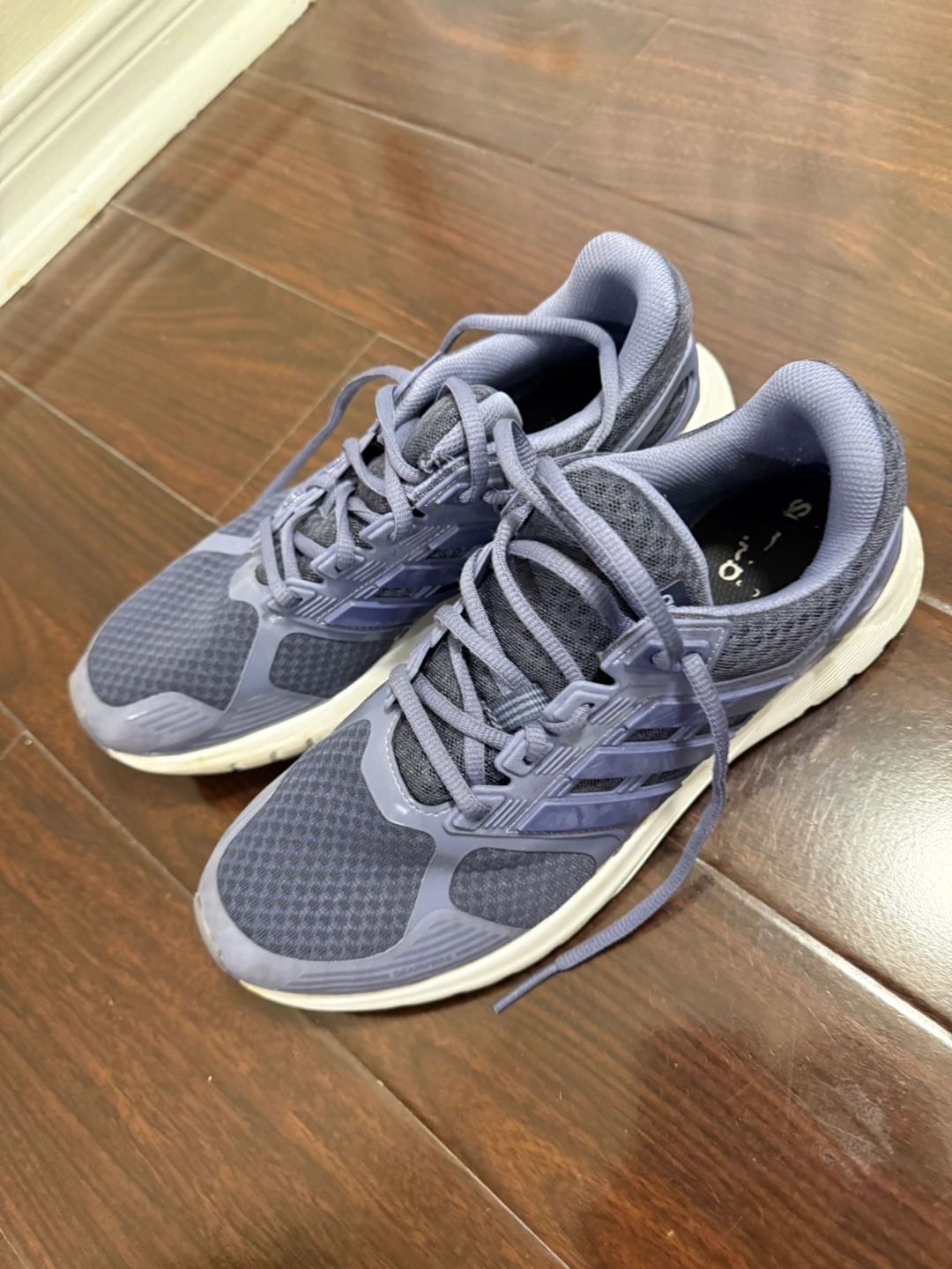 Purple Adidas running shoes. Lace-up closure. Breathable mesh upper. Comfortable cushioning. Great for workouts or everyday wear.