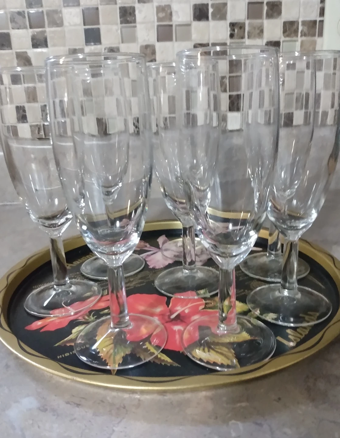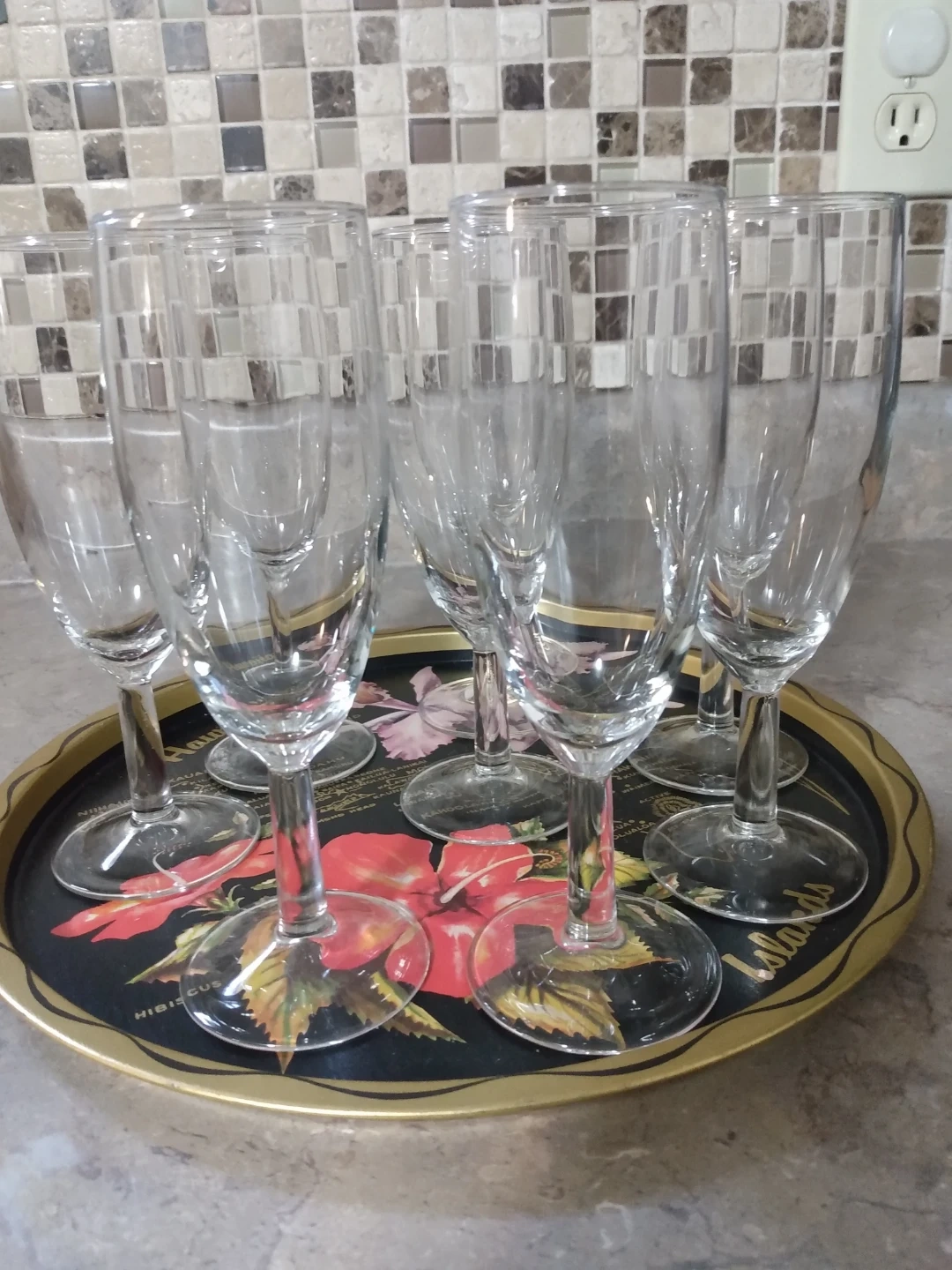 Eight lovely vintage wine glasses. Clear glass, simple design. Perfect for entertaining or adding a touch of vintage charm to your Tray not included (Cash pick up)