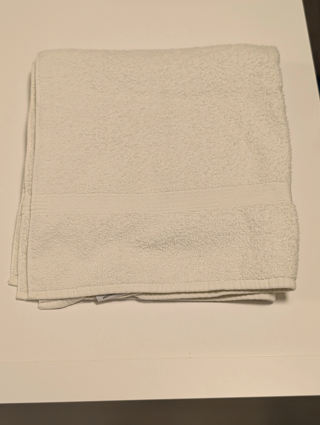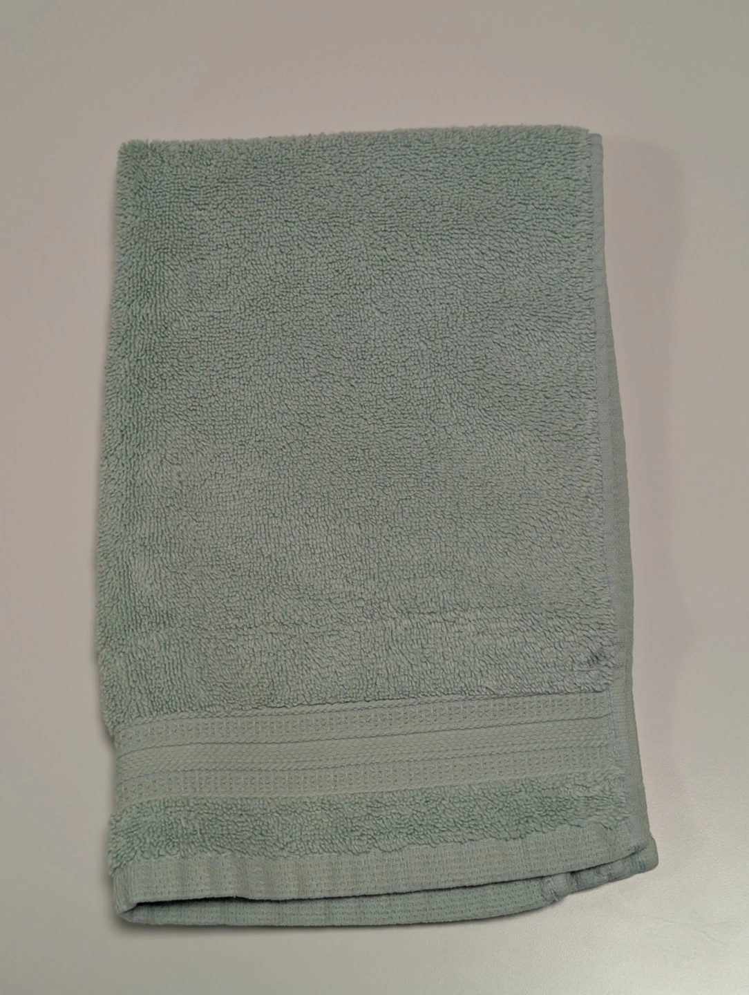 Two used hand towels. One aqua blue, one cream. Soft and absorbent. Perfect for your bathroom.