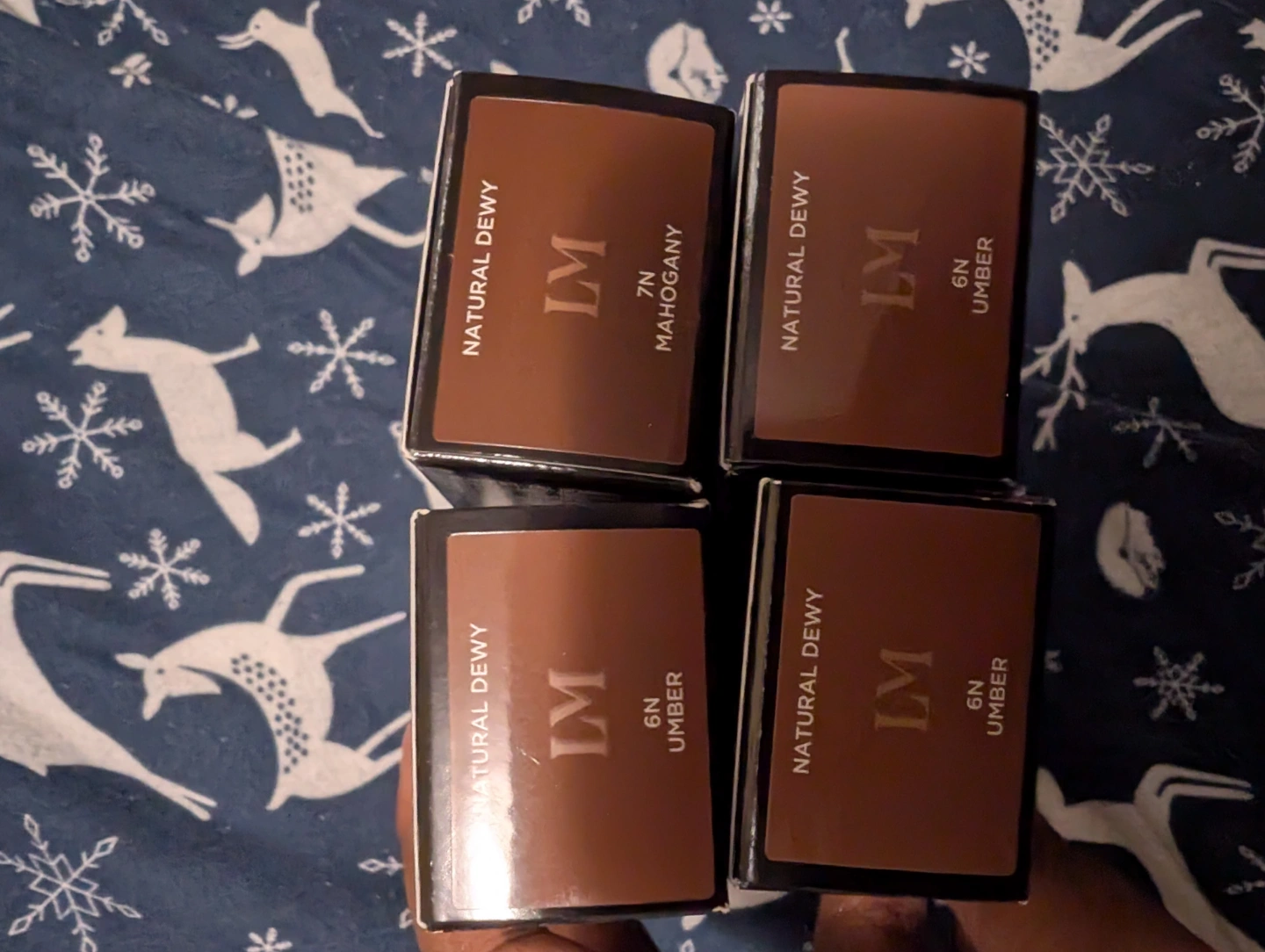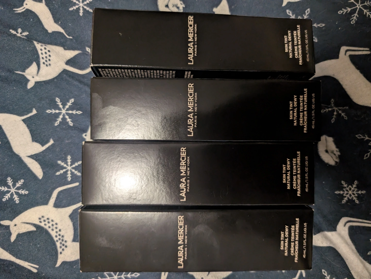 Four boxes of Laura Mercier Skin Tint in Natural Dewy finish. Two are shade 7N Mahogany and two are 6N Umber. New and unopened.