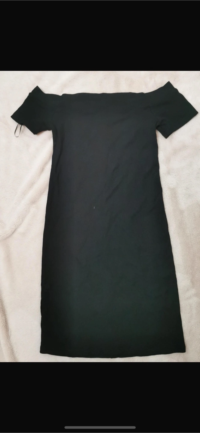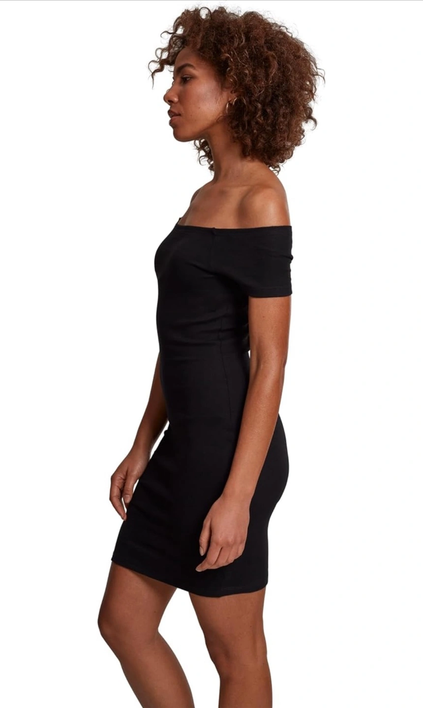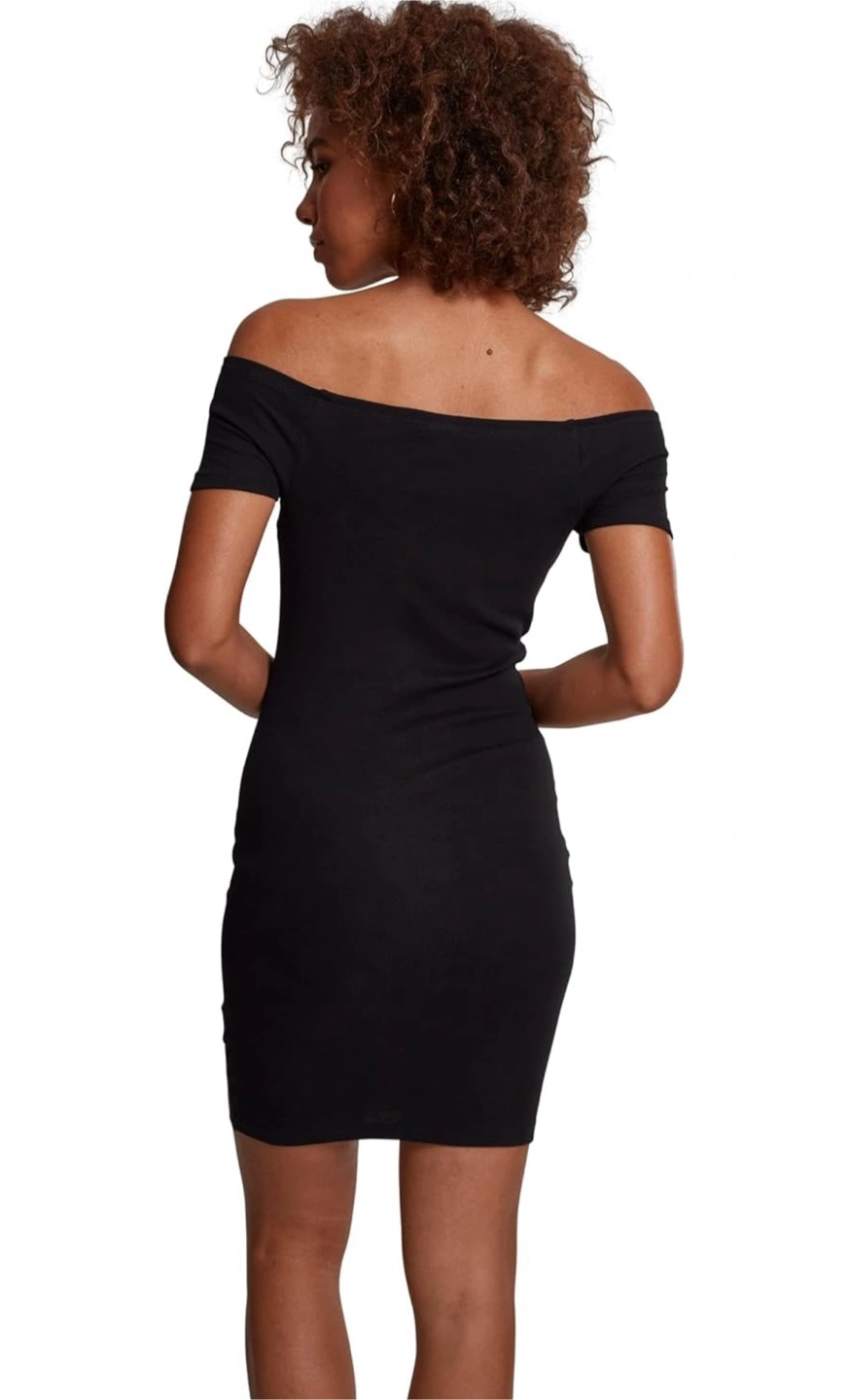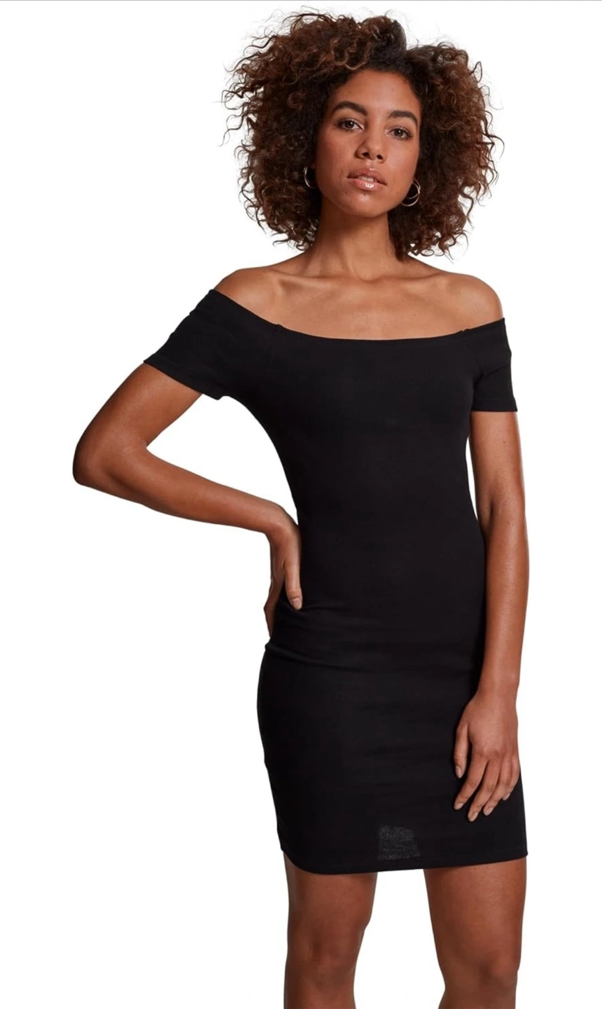 NEW! Simple black mini dress. Off-the-shoulder neckline. Short sleeves. Bodycon fit. Great for a night out. You'll be a real eye-catcher in this figure-hugging jersey dress. The off-the-shoulder style is made from super-soft ribbed cotton in a figure-flattering fit and features short sleeves. Pair the Ladies Off-Shoulder Rib Dress with metallic flip flops or playful high heels and become a trendsetter.
