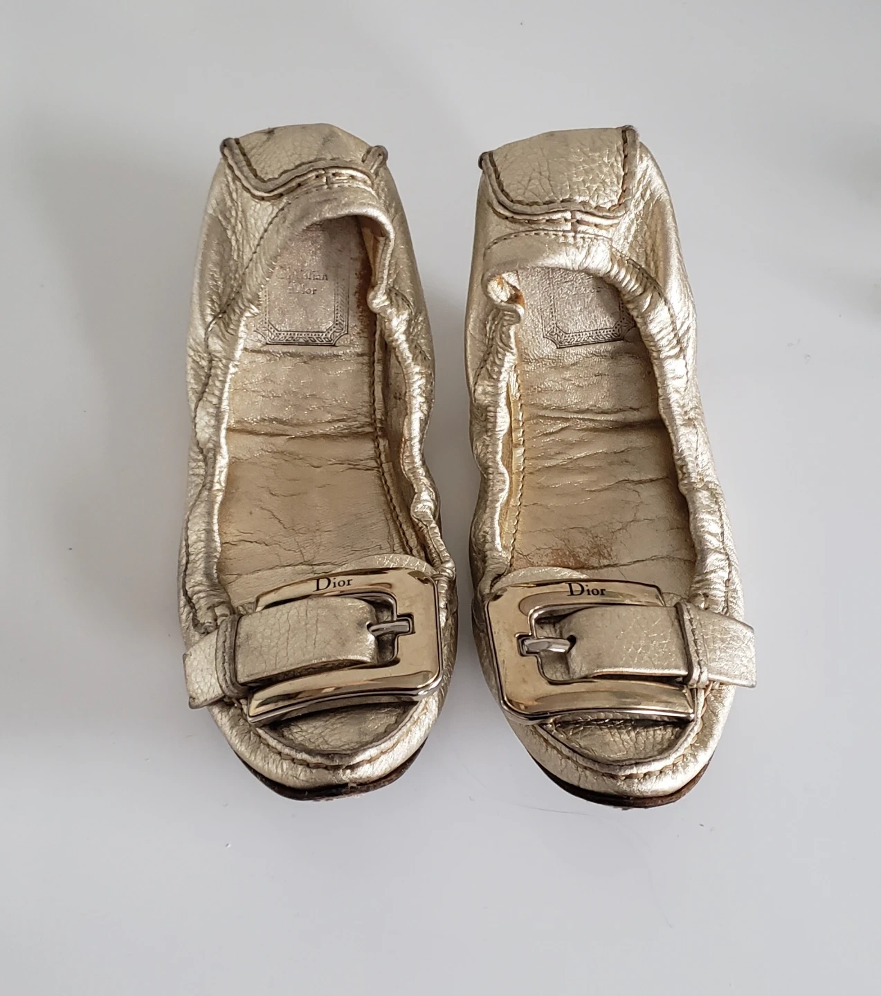 Dior champagne / white gold leather metallic ballet flats w/ branded buckle. Comfortable and dont slip off your feet as some flats tend to. Gorgeous designer piece.