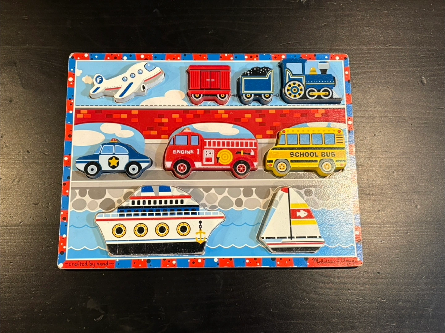 Nine-piece wooden puzzle featuring various transportation vehicles. Includes a plane, train, cars, boat, and more. Great for toddlers and preschoolers. Pick up in the Yonge and Finch area.