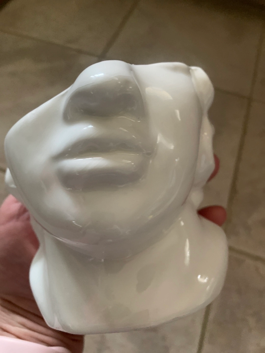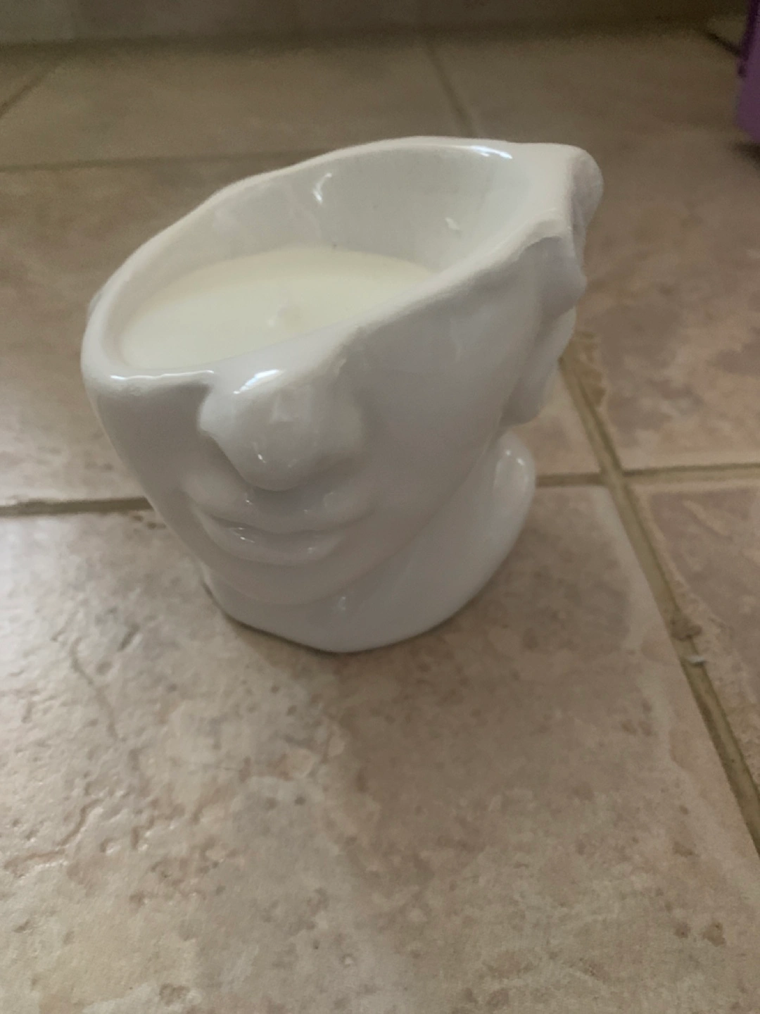 Unique candle holder. Shaped like a bust. White ceramic. Smells mahogany (gentle, subtle)