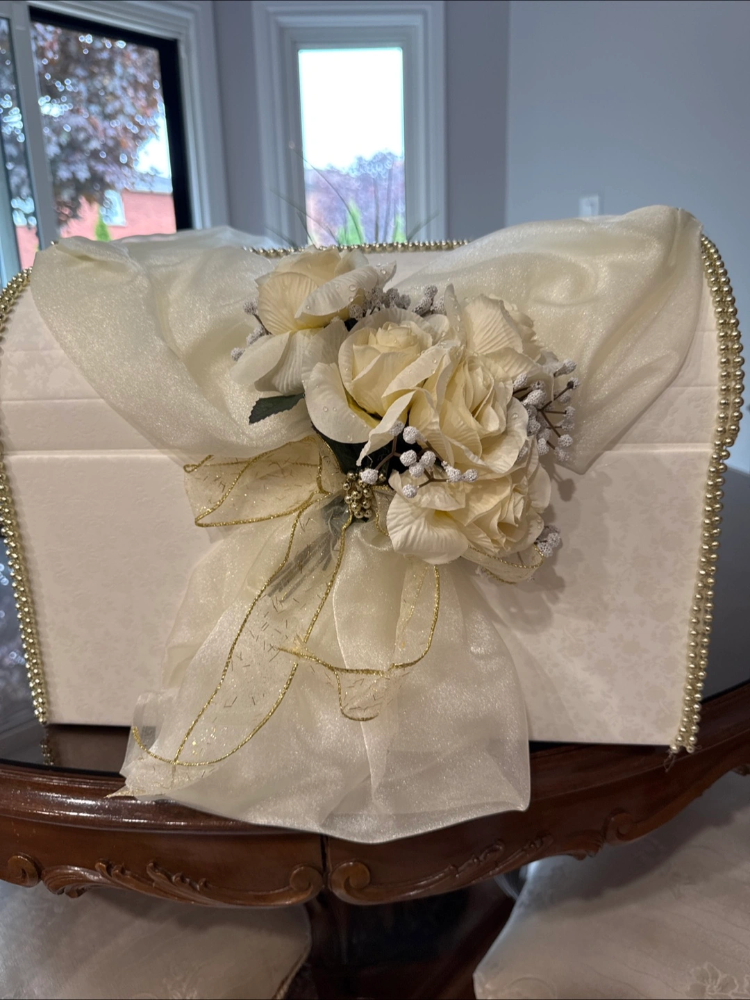 Beautiful ivory card box, perfect for weddings. Features pearl detailing and an ivory fabric overlay with artificial flowers. Slot for cards on top.