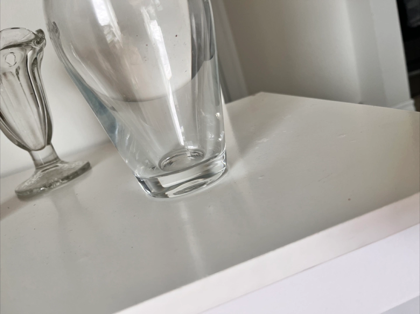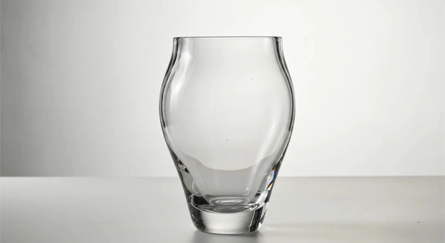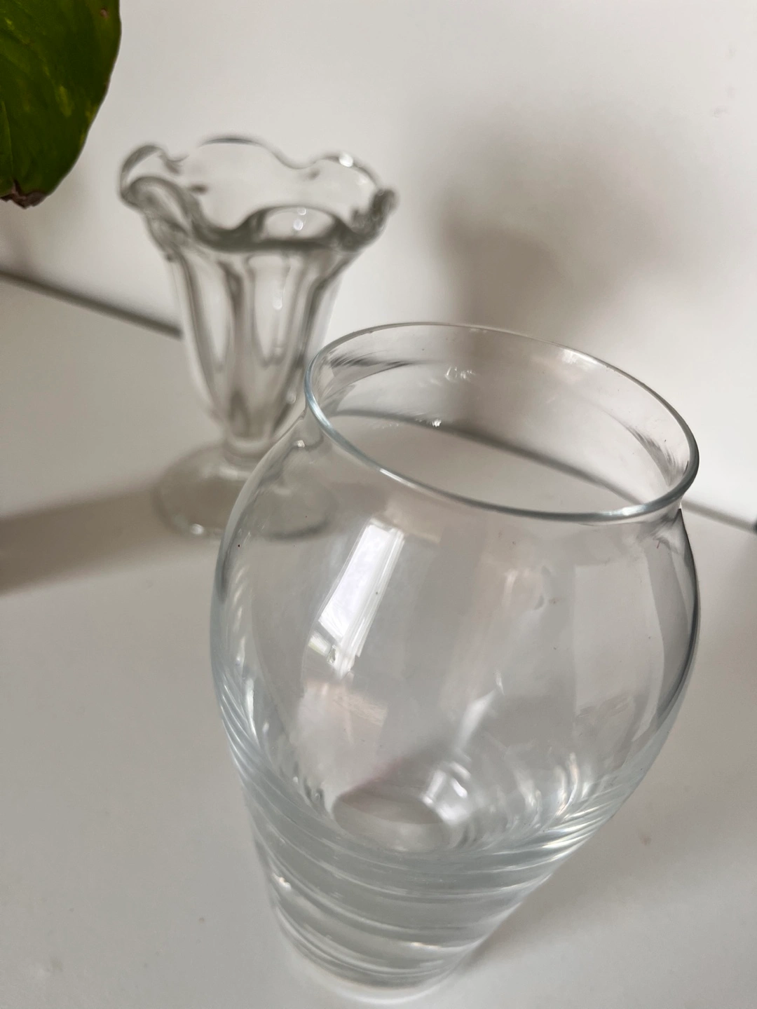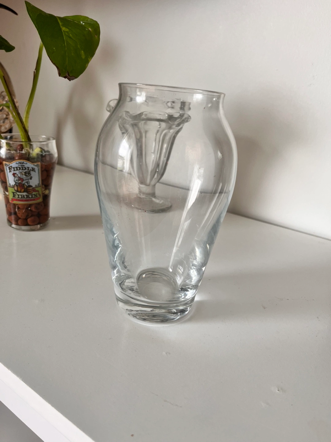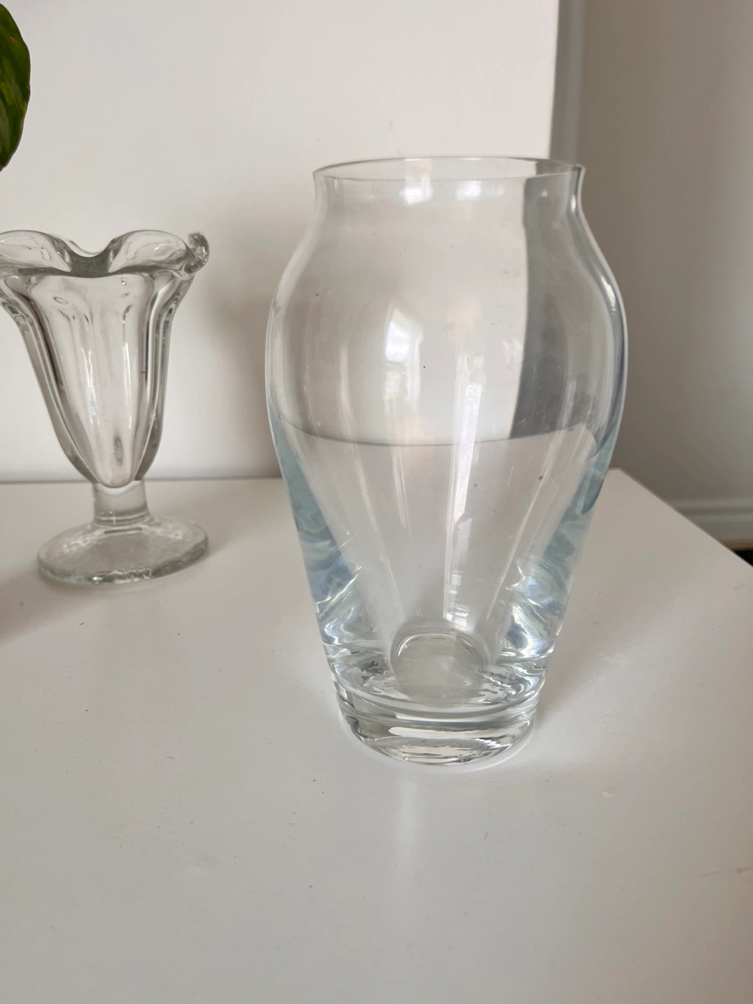 Elegant clear glass vase. Simple design. Perfect for small bouquets or home decor. Approximately 7 inches tall.