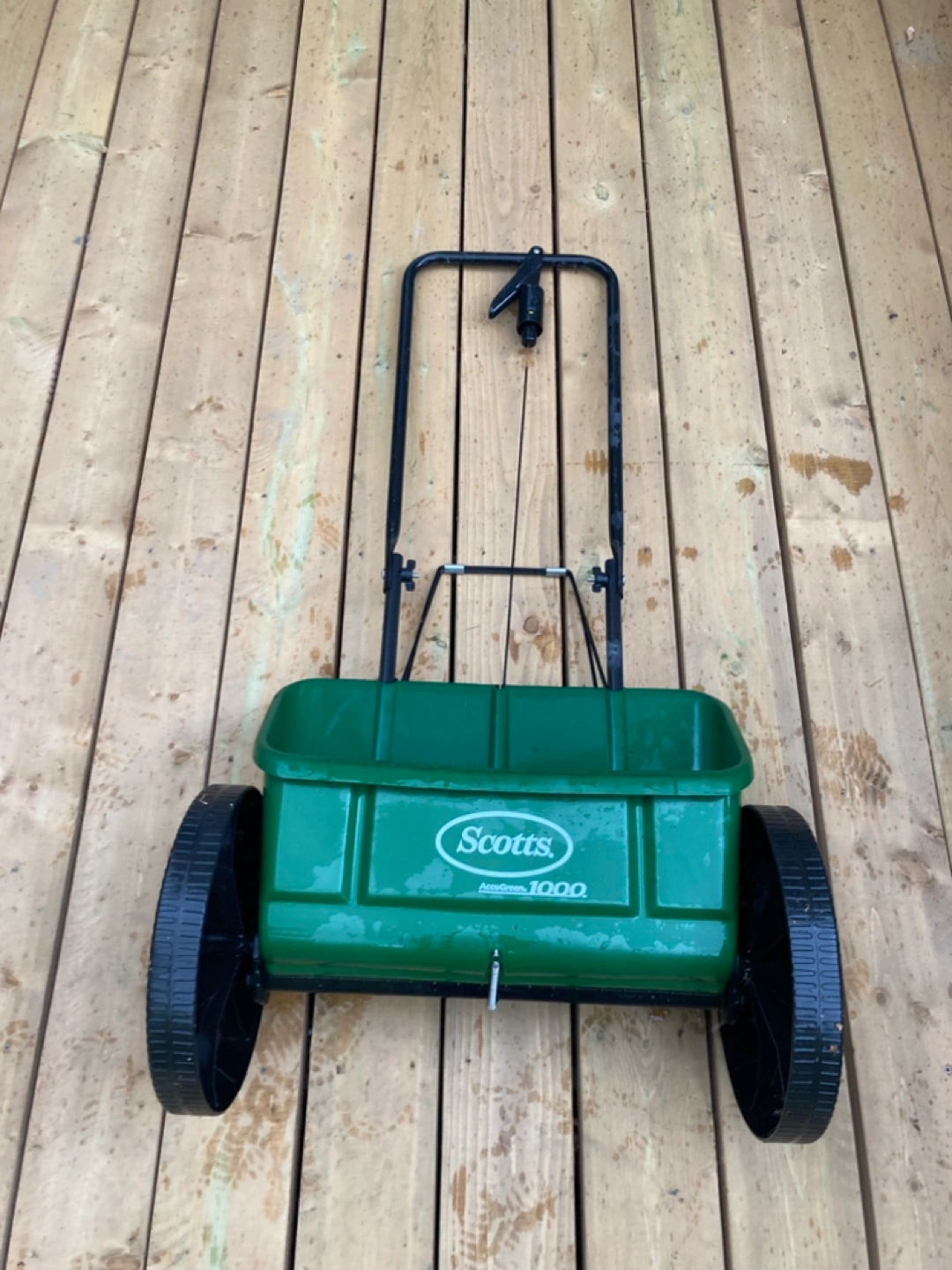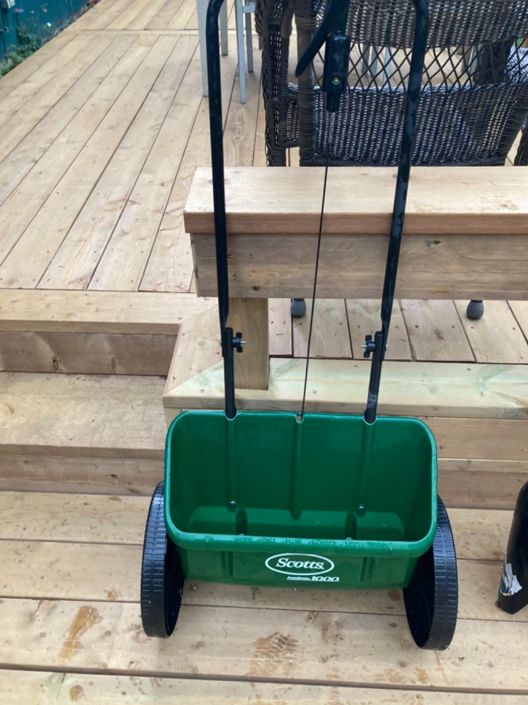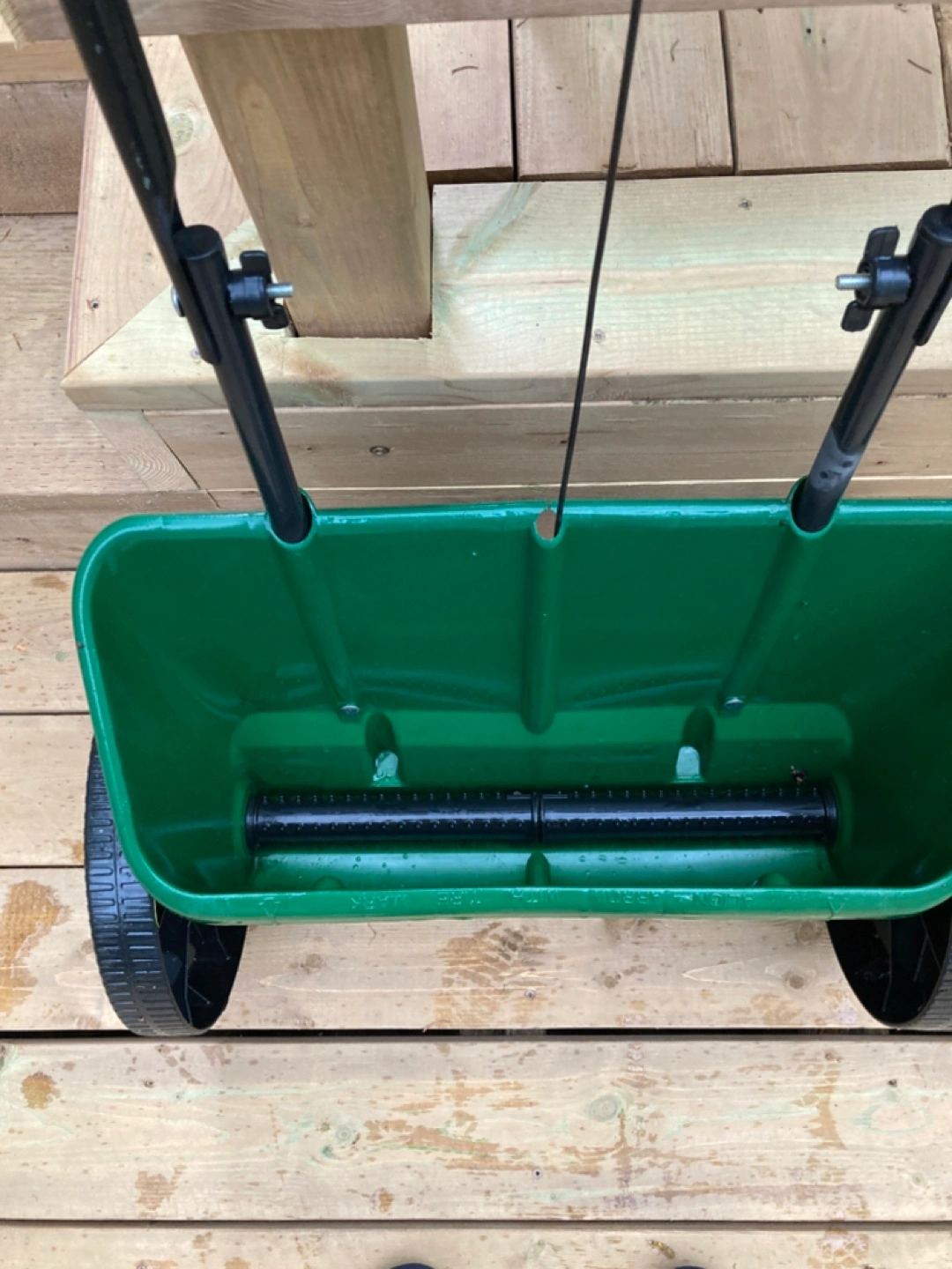 Green plastic spreader. Black metal handles. Two wheels. Excellent, like new condition. I believe we used this once only!