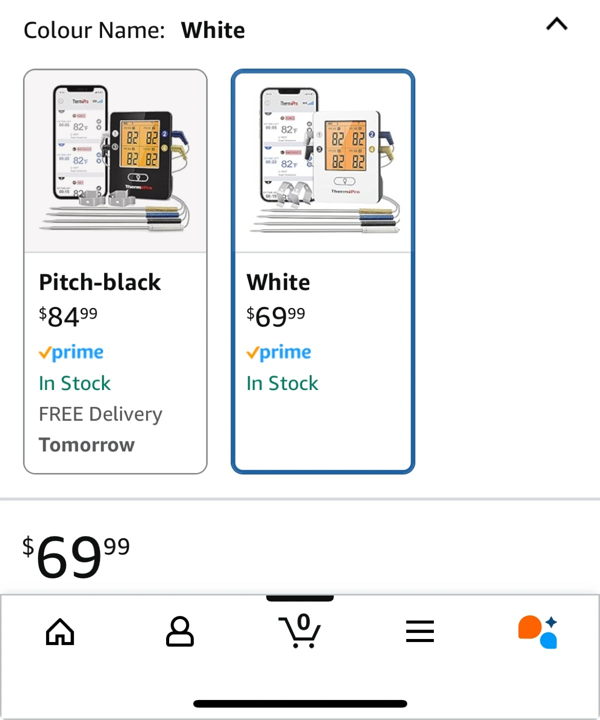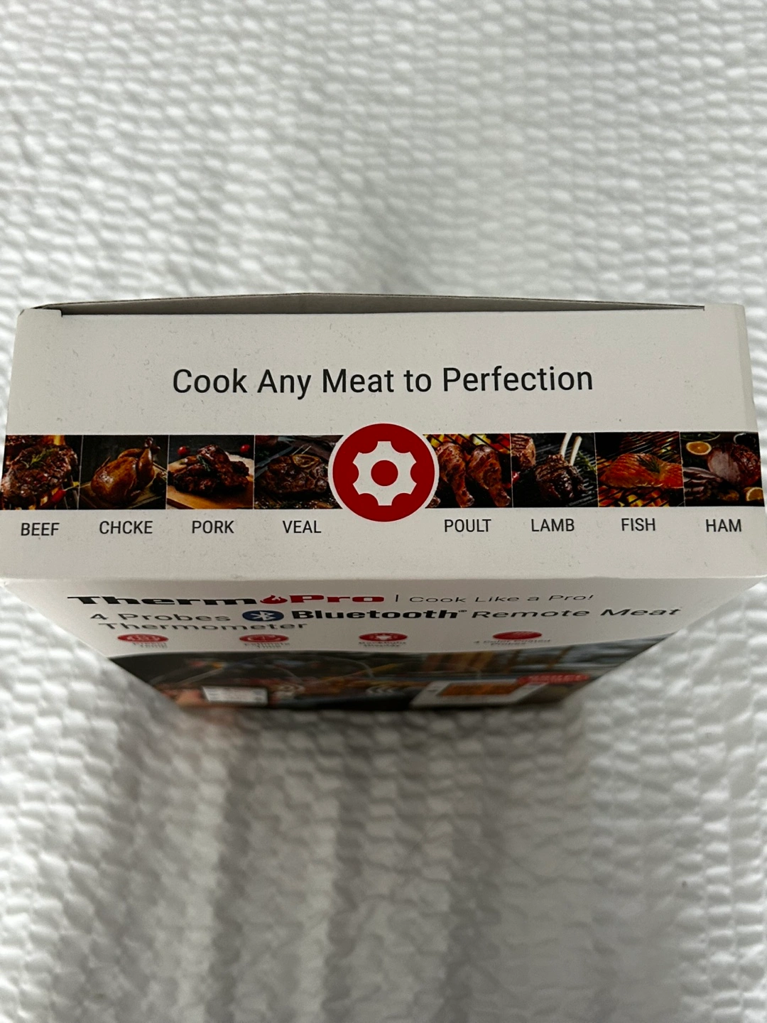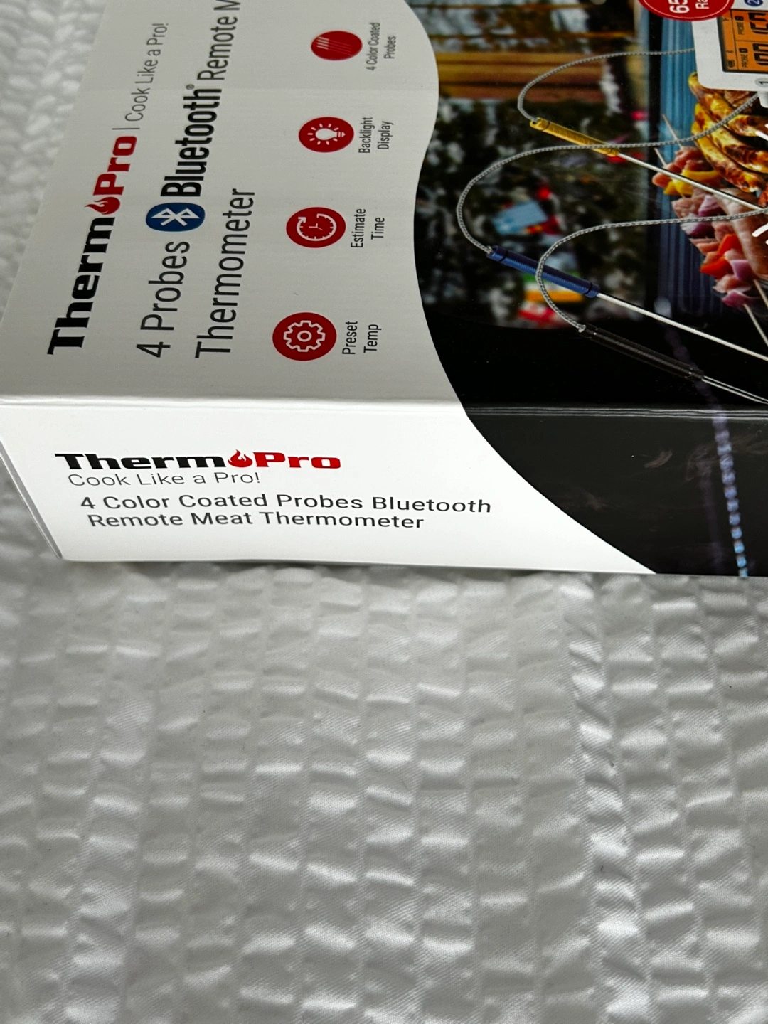 Wireless meat thermometer. Features four colour-coded probes, Bluetooth connectivity, a backlit display, preset temperatures, and estimated time remaining. 650-foot range. White. Sells on Amazon for 69.99 plus tax. Pickup location Bayview and Sheppard