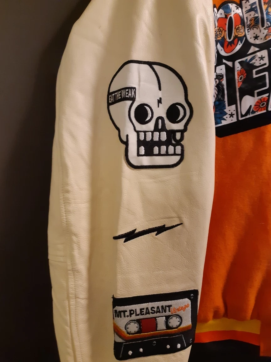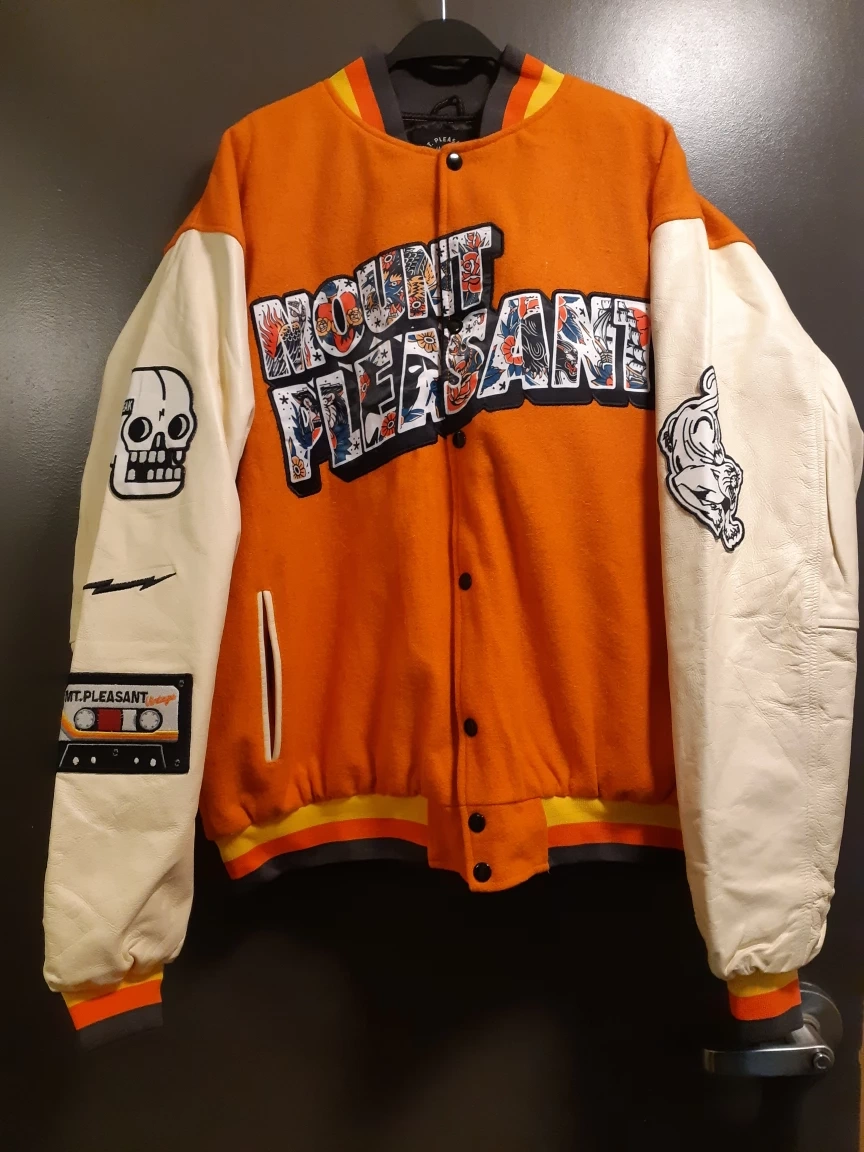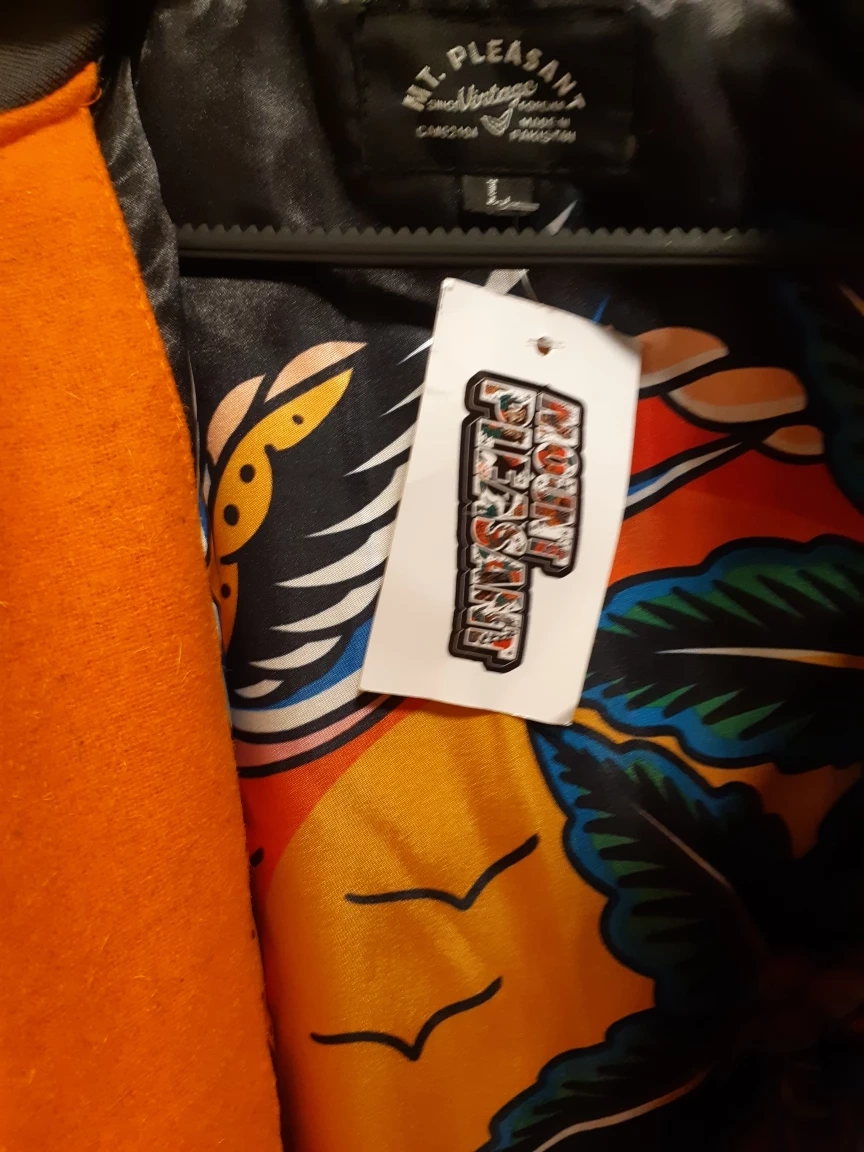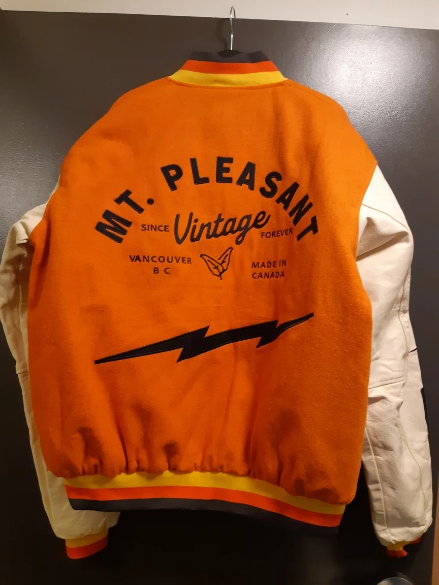 NWT Vintage-style Mount Pleasant letterman jacket (size L) or sale for $240 or best offer! $10 off if you call or text today! 6043667153 call or text! Greyhound Station/Main St. downtown area pick-up is ideal! Good condition! Colourful, funky design, with patterned lining and inner pocket!
