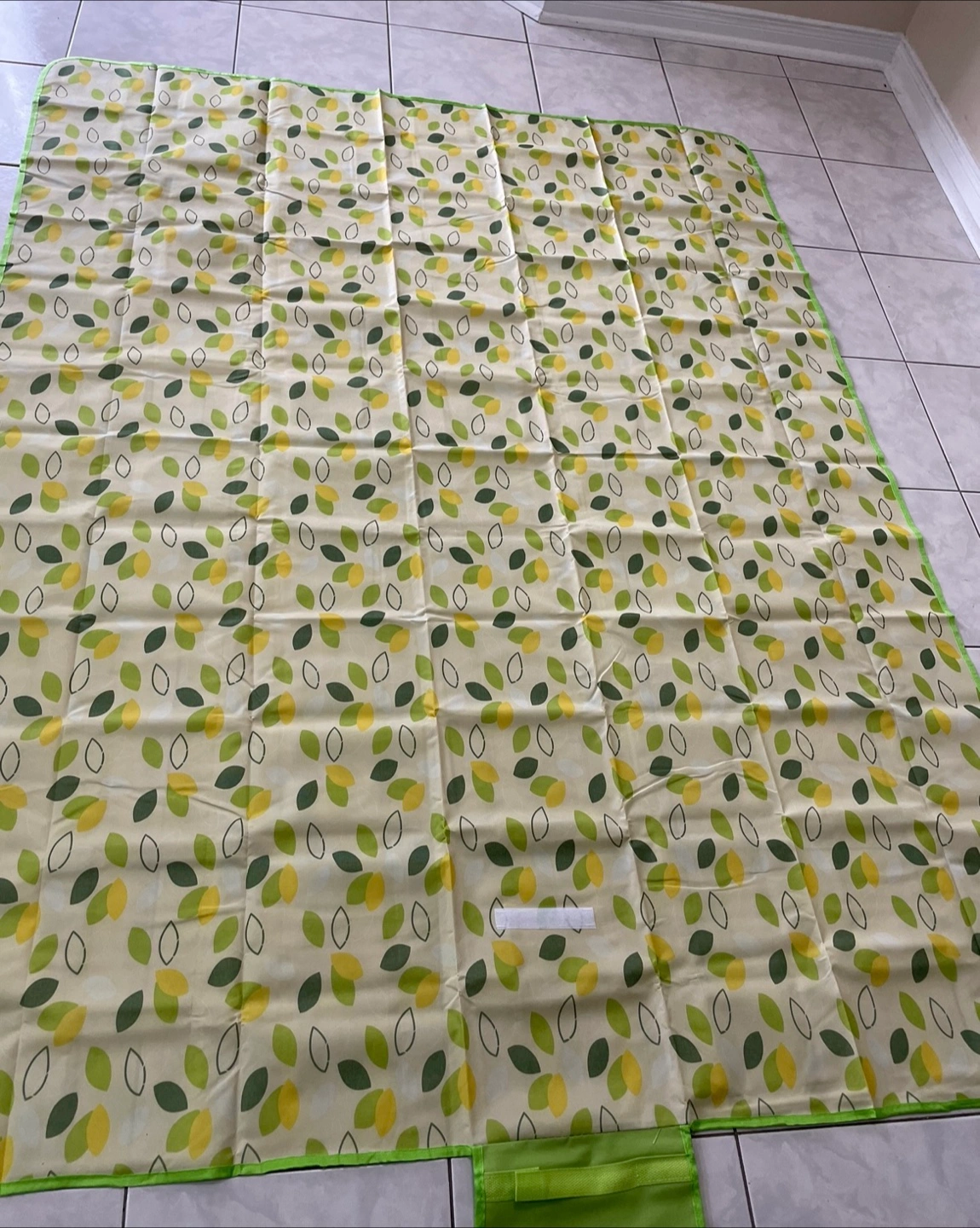 Large picnic blanket, leaf design. Features a carrying case. Cream coloured base with green and yellow leaves. Waterproof backing. Brand new product