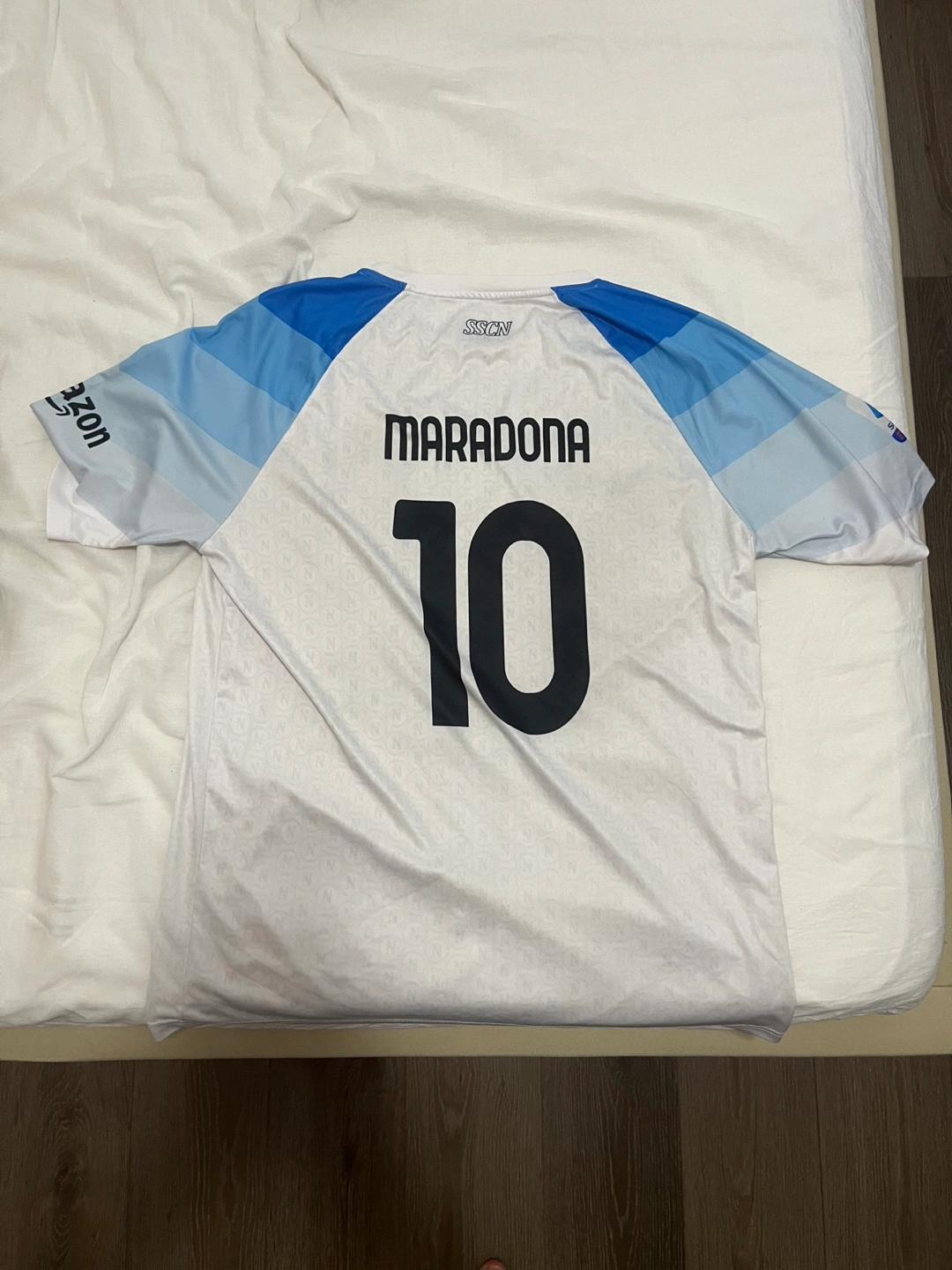White and light blue Napoli jersey. Features Maradona name and number 10 on the back. Lete MSC sponsor logo on the front. EA7 branding visible.