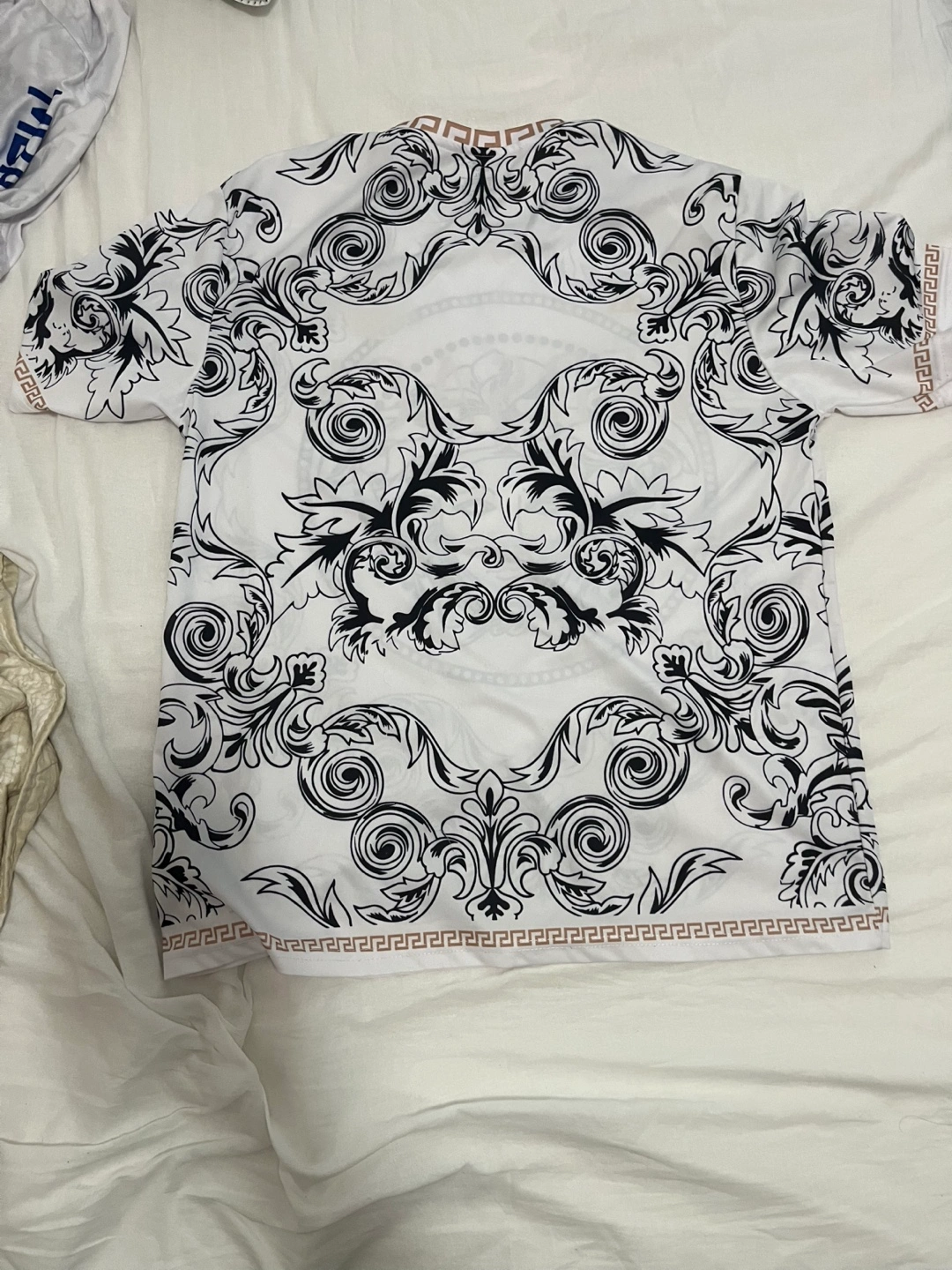 Men's short sleeve t-shirt. White with black baroque print. Features Medusa head logo. Aeroready technology.