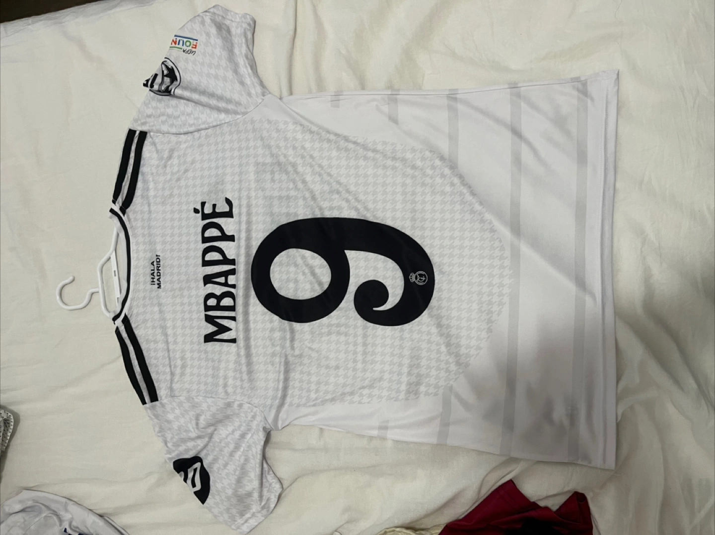 Men's white Real Madrid jersey. Features Mbappé's name and number 9 on the back. Adidas logo visible. Emirates Fly Better sponsor.