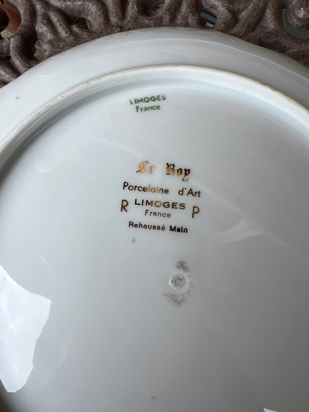 Decorative plate. Features a charming scene of people bartering fruit. Gold gilded edges. Made in France.