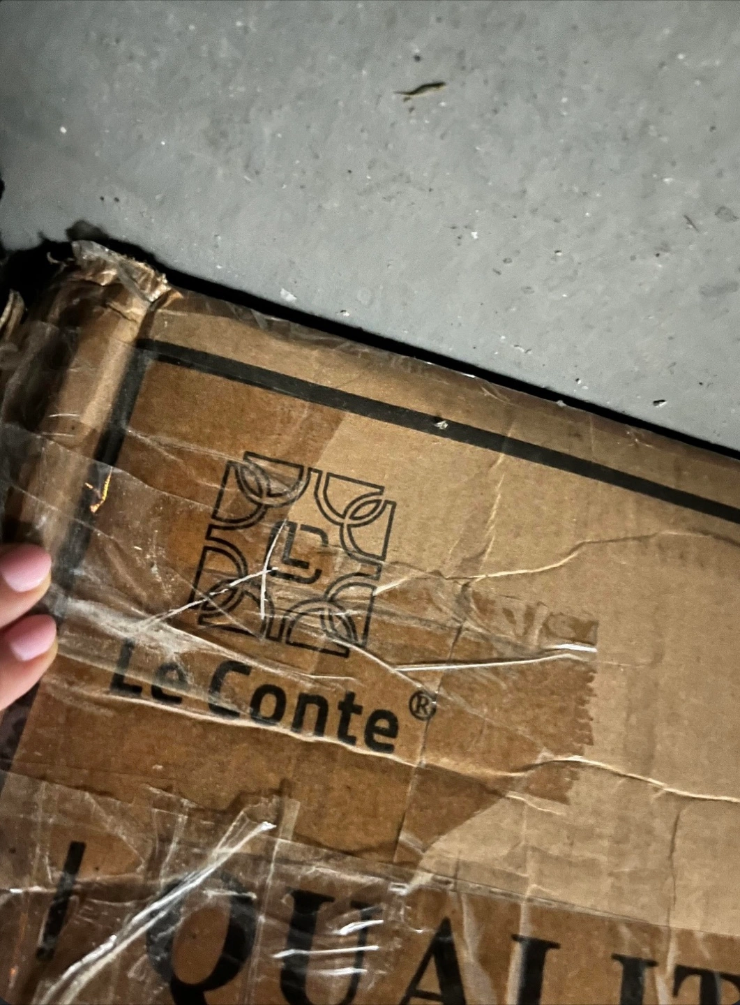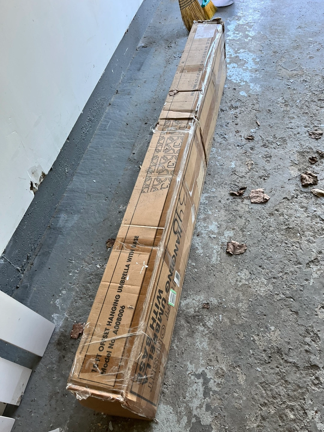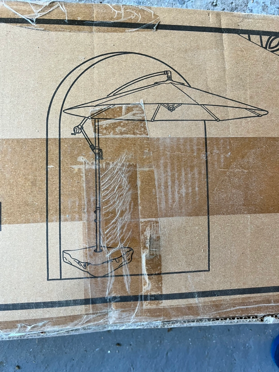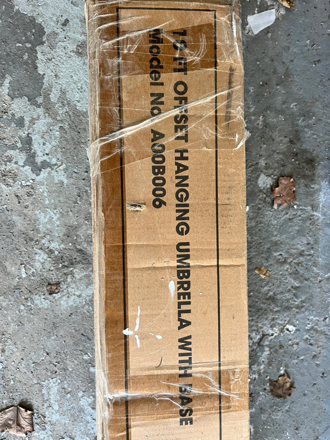 Brand new in box. Le Conte 10-foot offset hanging patio umbrella. Includes base. Model # A00B006. Perfect for your outdoor space. Asking $120