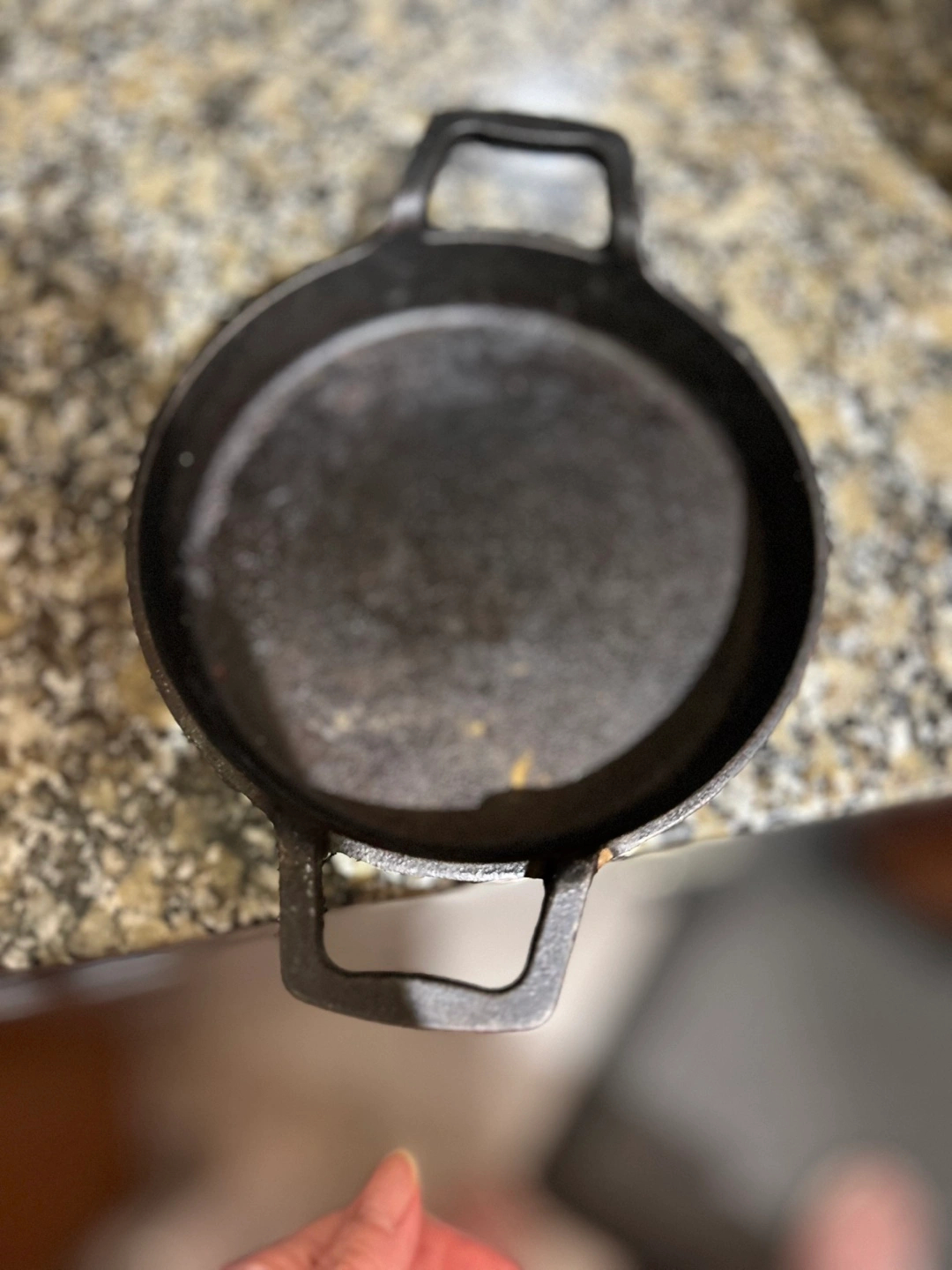 Small cast iron skillet. Features two handles. Shows some signs of use.