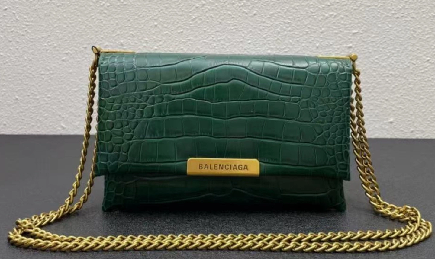 Beautiful dark green crossbody bag. Features a gold chain strap and crocodile-embossed leather. Subtle Balenciaga branding. Perfect for evenings out.