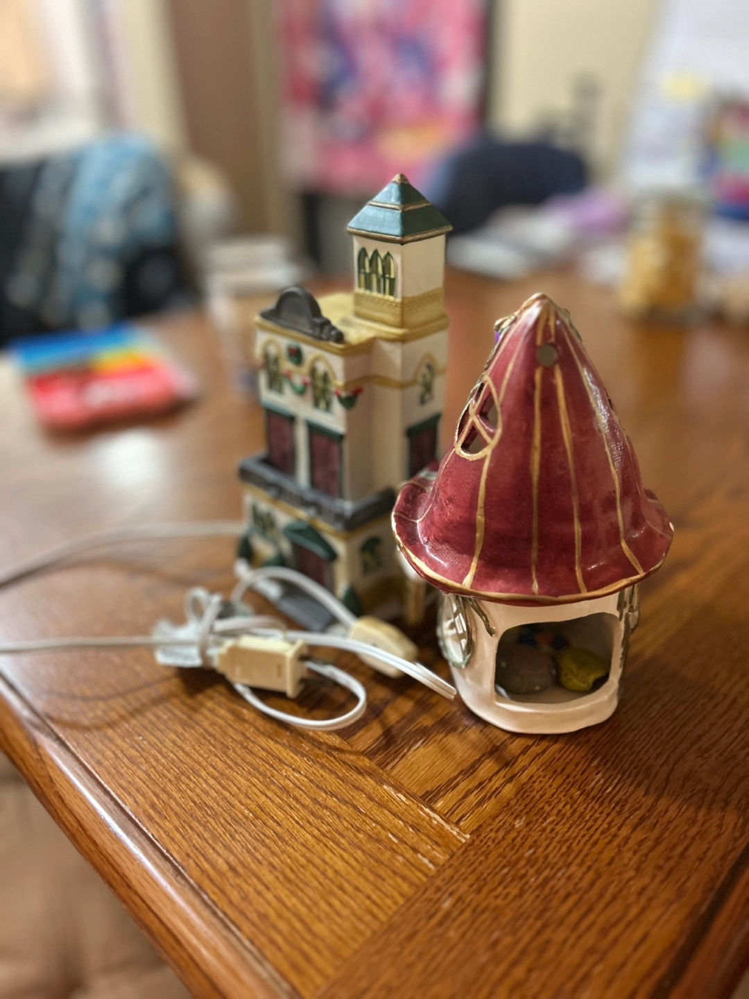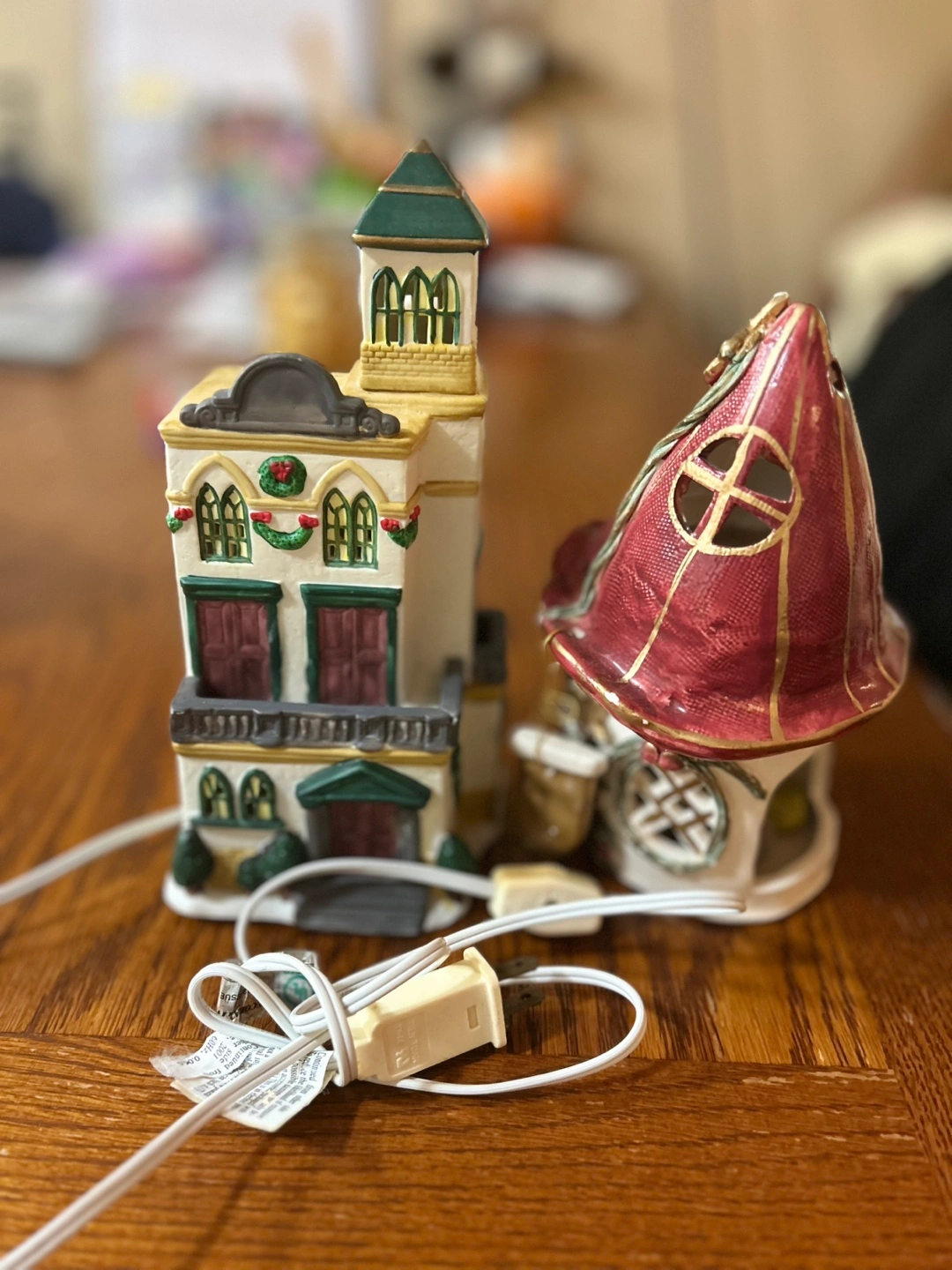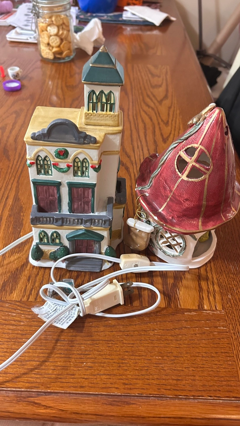 Pair of ceramic Christmas village houses. Light-up features. One resembles a town hall, the other a whimsical elf house. Collectible holiday decor. Pre-owned.