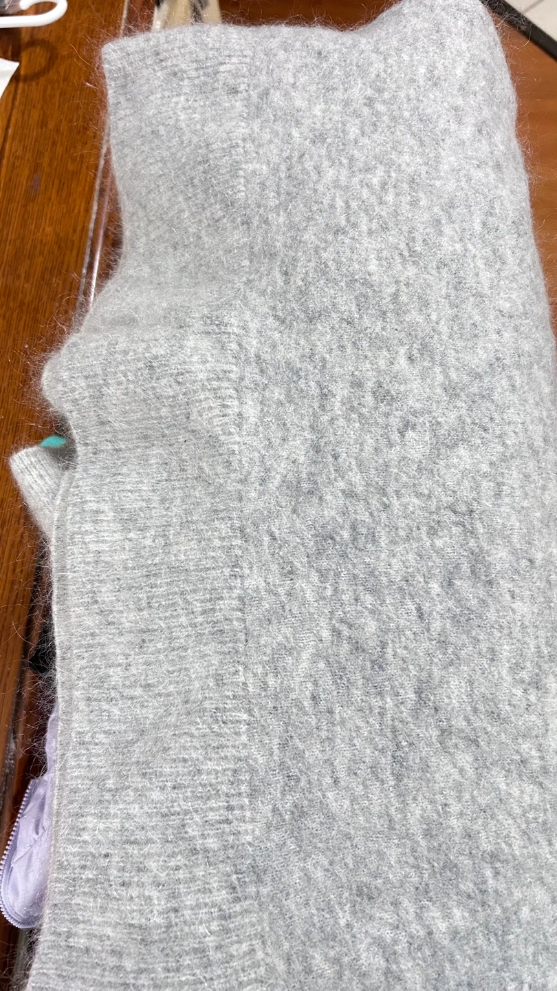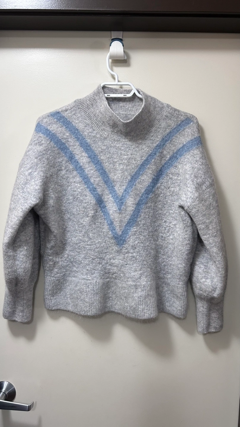 Women's grey mock neck sweater. Features a V-shaped design with blue stripes. Lightweight knit. Approximately 22 inches wide. wool alpaca materials but i cut the material tag out