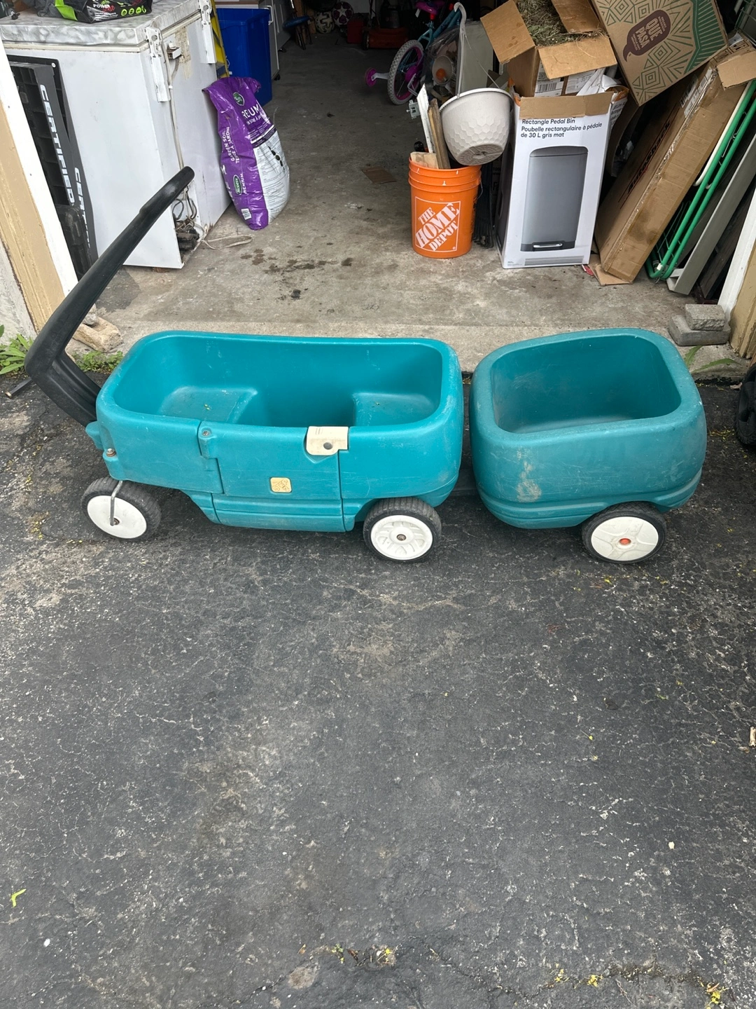 Radio Flyer wagon and trailer set. Teal plastic. Some wear and tear. Great for kids.