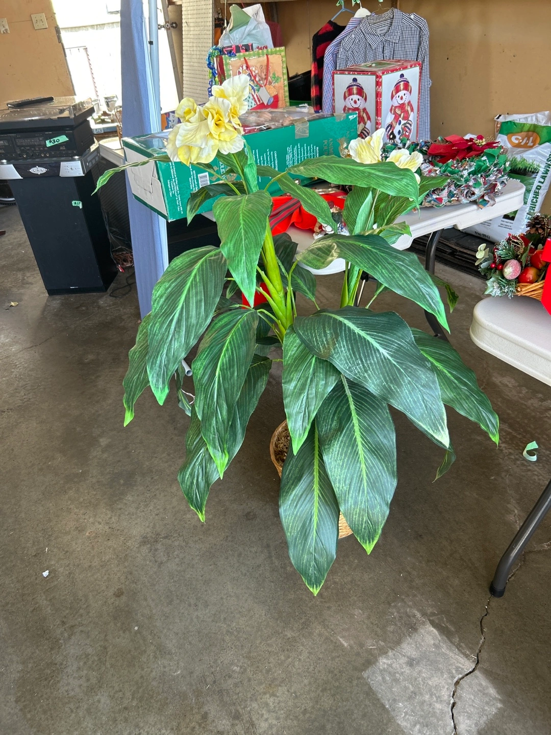 Large artificial plant. Green leaves, yellow flowers. Planted in a woven basket. Looks great in any room.