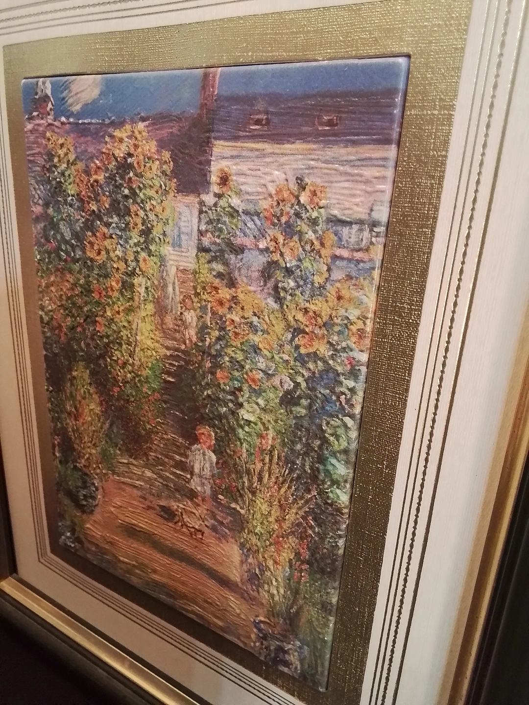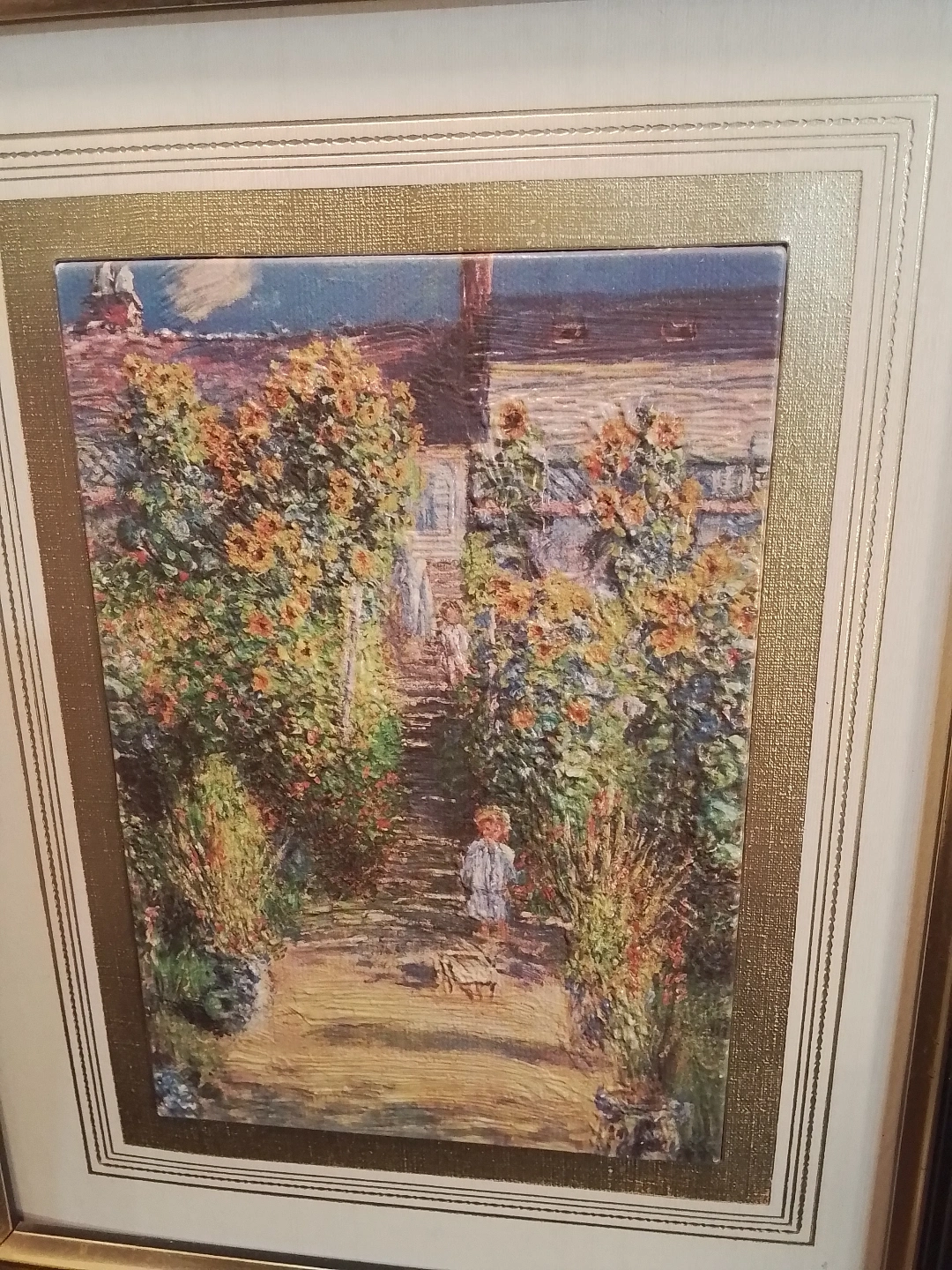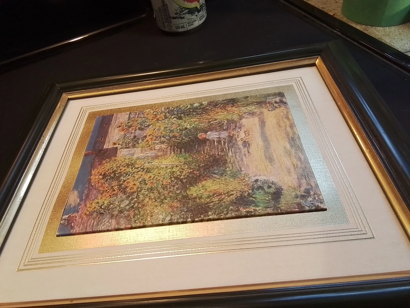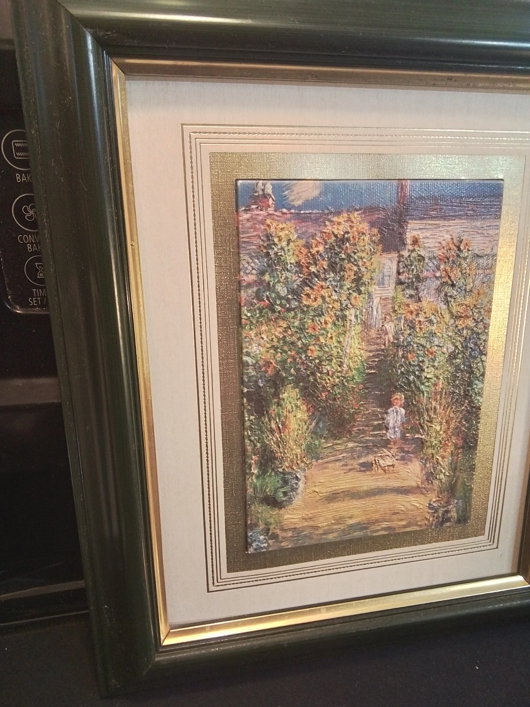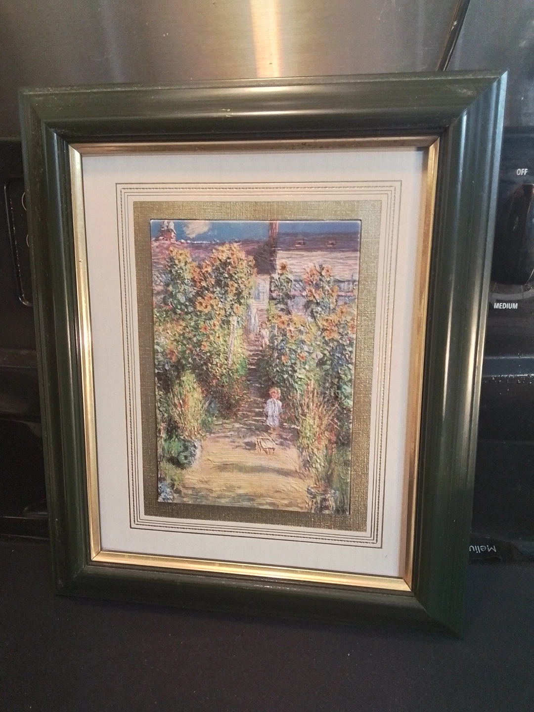 Recreation The Artist's Garden at Vetheuil, 1880 - by Claude Monet Oil Painting Framed Monet-inspired Garden Scene Print Displaying Claude Monet's "The Artist's Garden at Vétheuil" from 1880, this recreation oil painting captures the essence of impressionism with its vibrant colours and serene garden scene. This piece is framed and ready to hang, perfect for adding a touch of classical art to any room. Measurements: 12x10 * **Artist:** Claude Monet * **Title:** The Artist's Garden at Vétheuil, 1880 * **Medium:** Oil on Canvas * **Frame:** Included If the ad is up, the item is still available. Don't miss out on the chance to own this charming piece! Beautiful framed print depicting a garden scene. Style reminiscent of Monet. Dark green frame with gold inner accents. Small, perfect for a table or shelf. Pickup at Young Street and Steels Ave