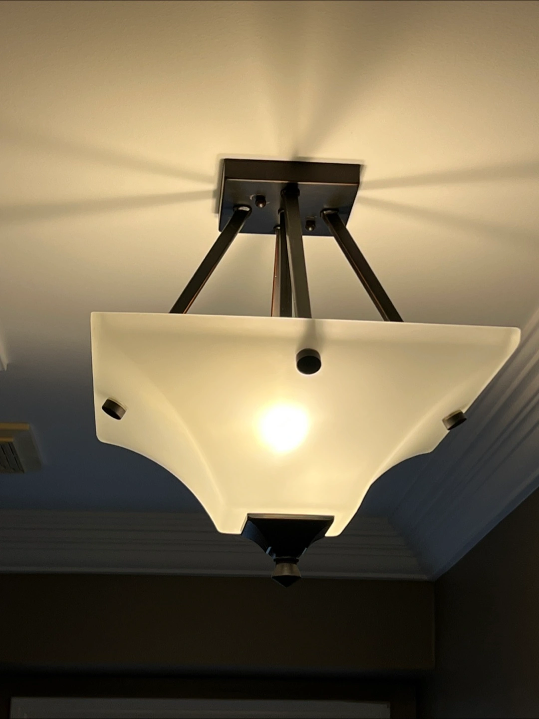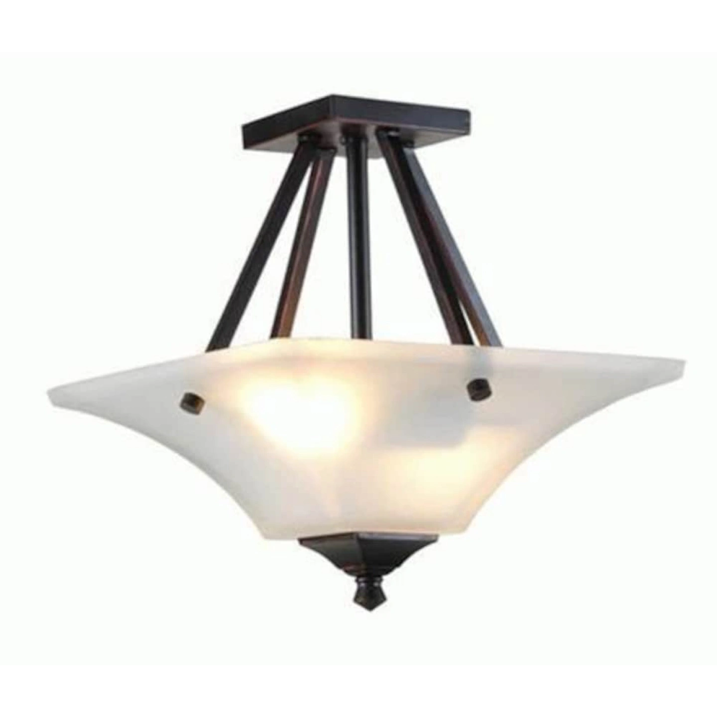 Elegant and Modern ceiling light fixture. Features a frosted glass shade and dark bronze metal frame. Simple, stylish design. -Oil Rubbed Bronze Finish -Uses 2 Medium Base Bulbs ( Sold Separately) -Antique White - Frosted Glass Shade