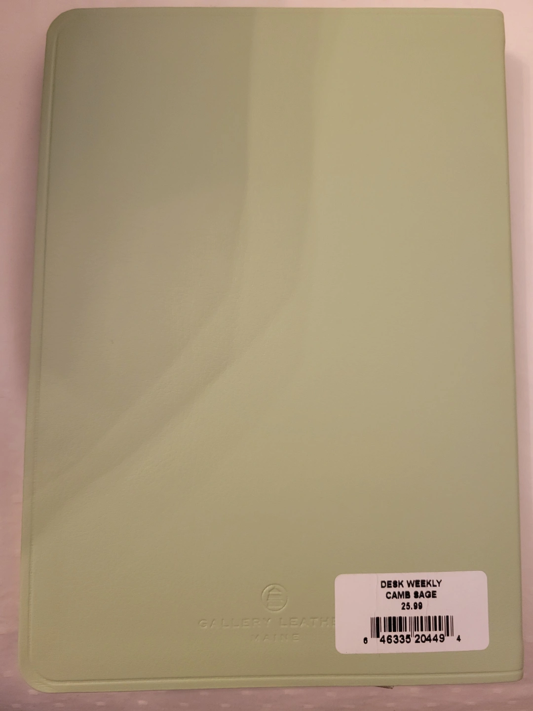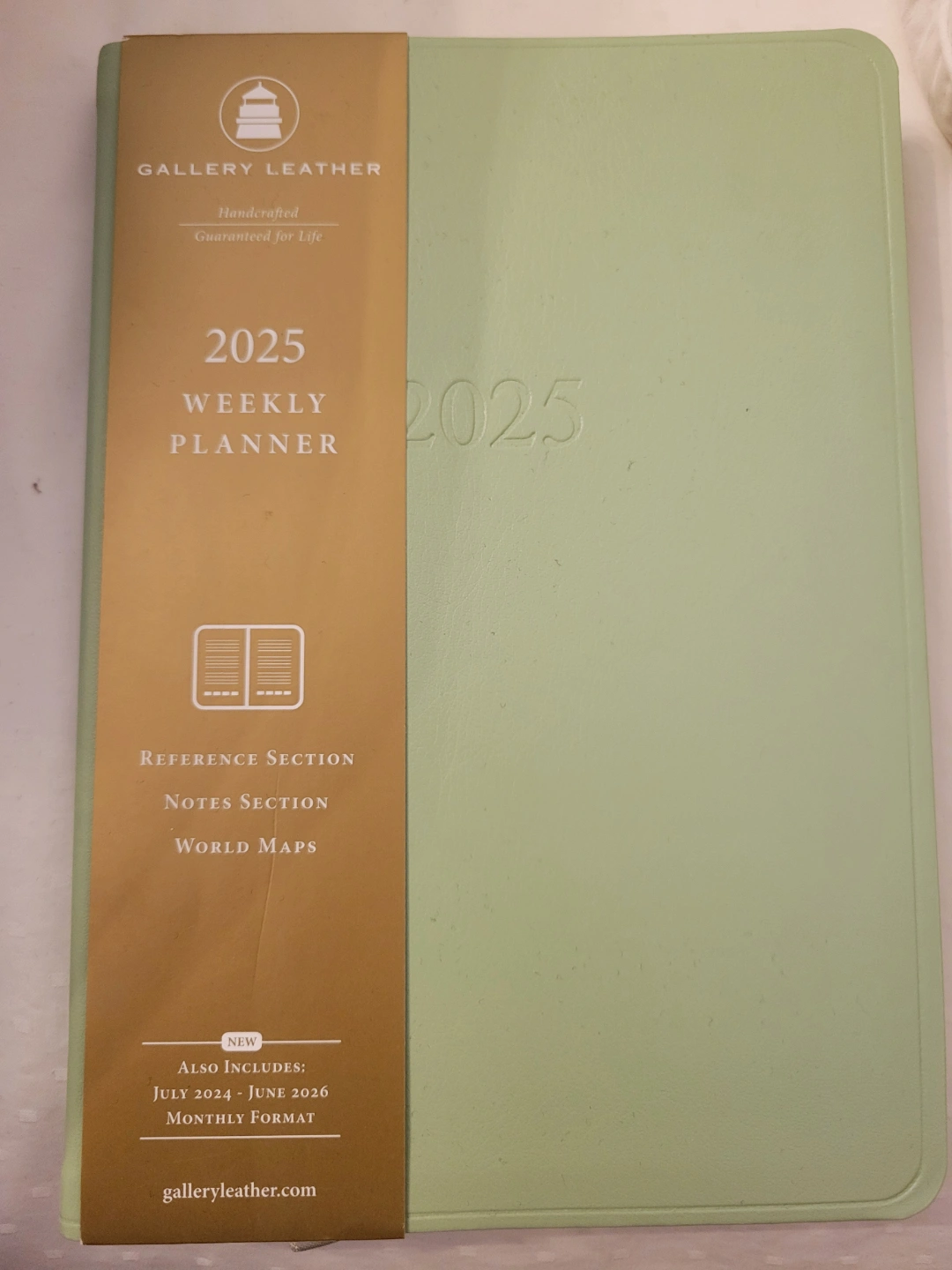 Mint green leather-bound 2025 weekly planner. Includes reference section, notes section, and world maps. Also includes July 2024 - June 2026 monthly calendar. Desk weekly format.