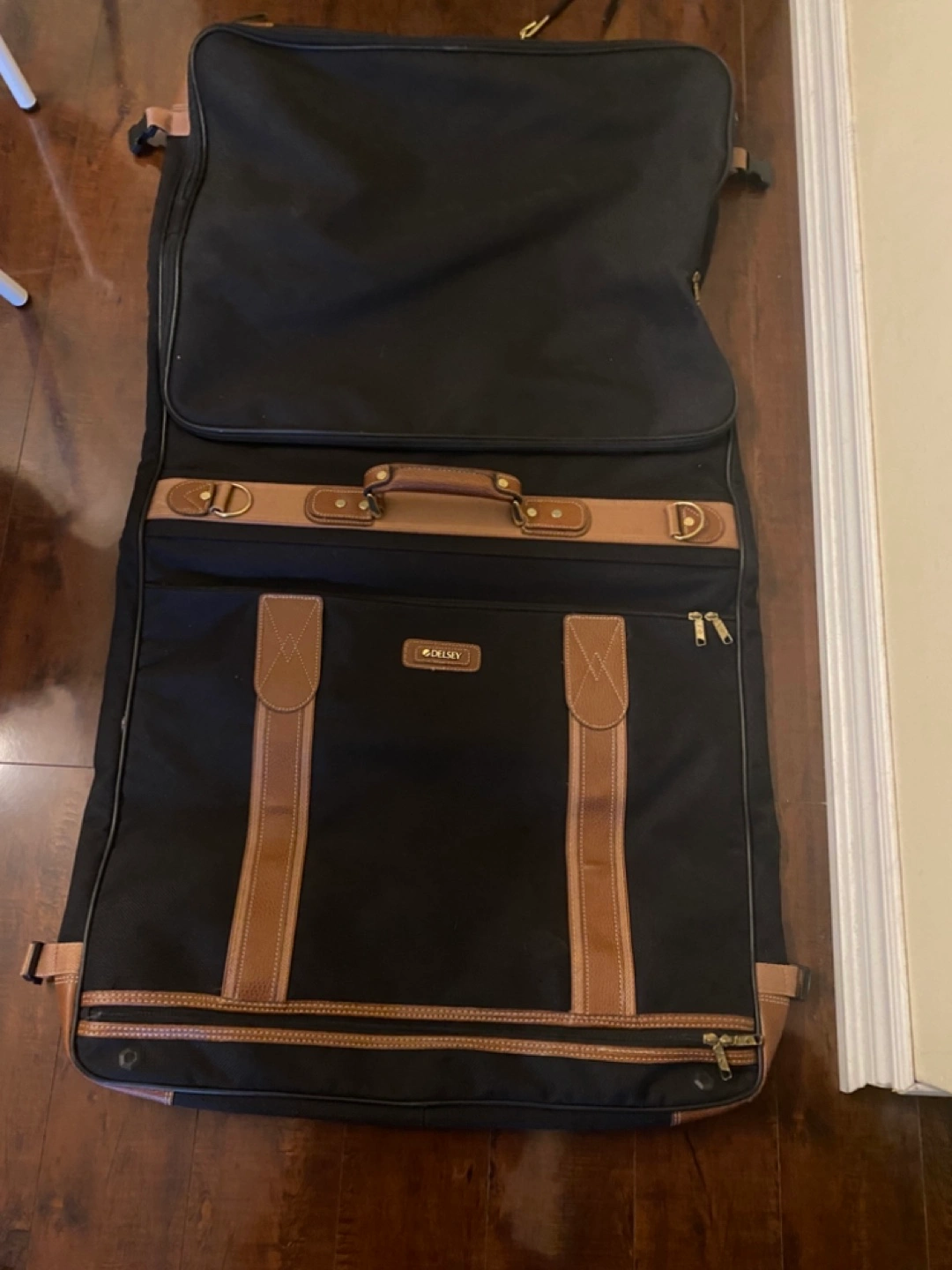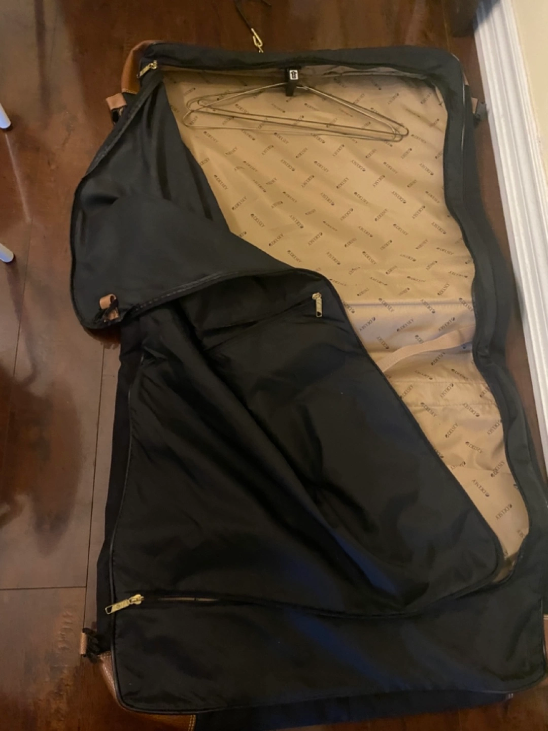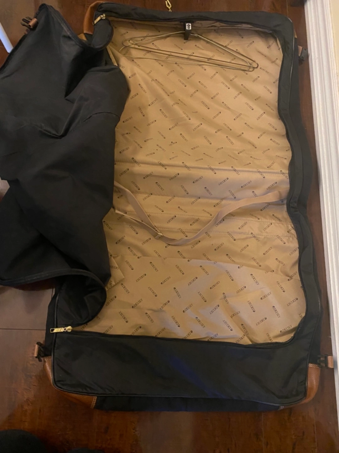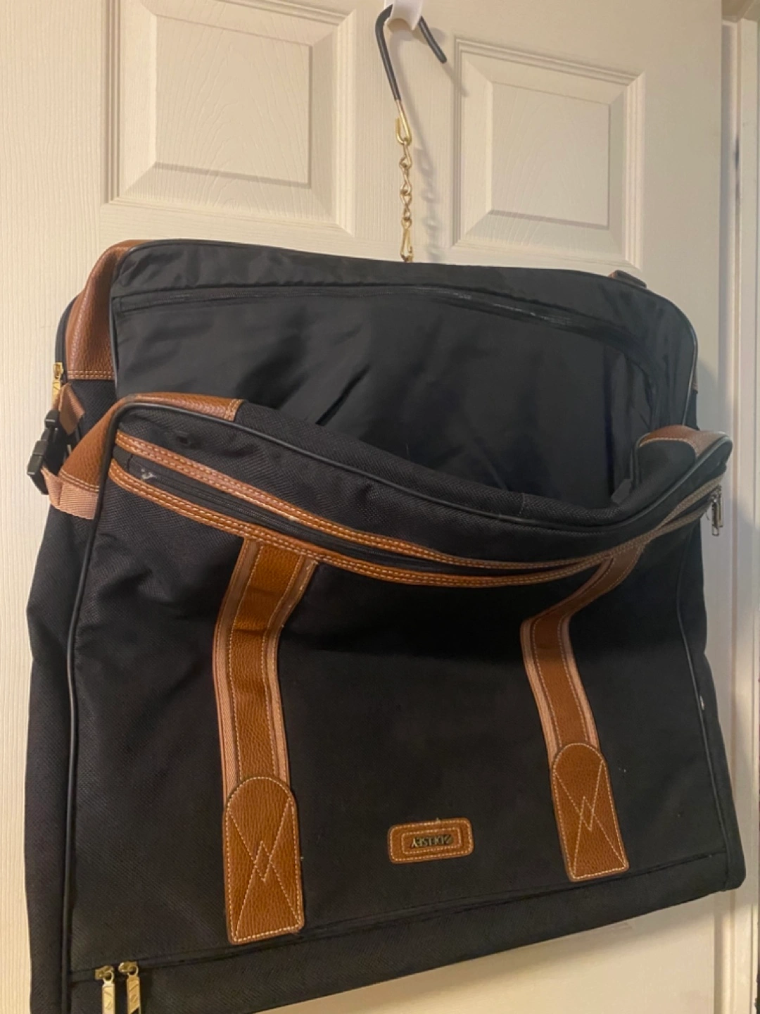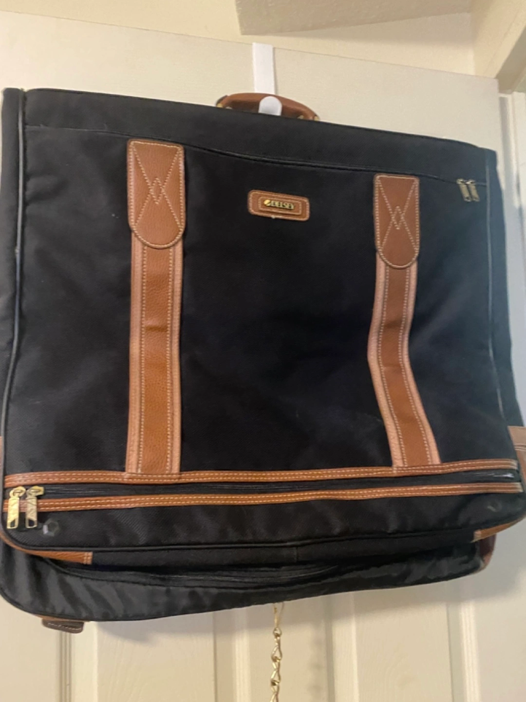 Black garment bag with tan leather accents. Features multiple compartments and a hanger. Ideal for travel.